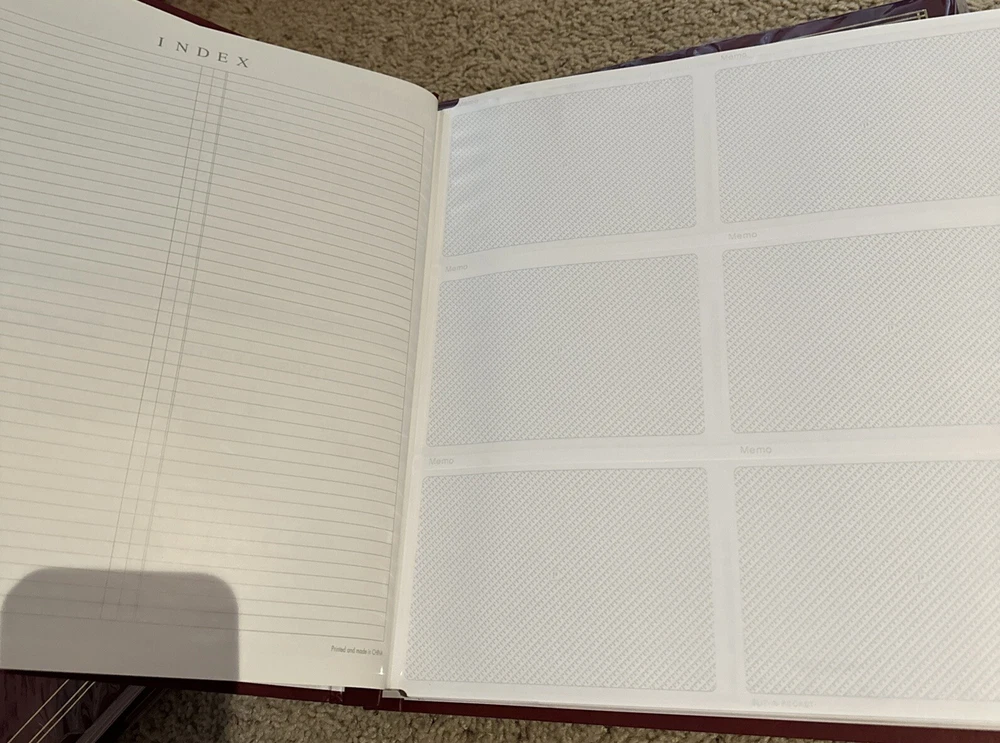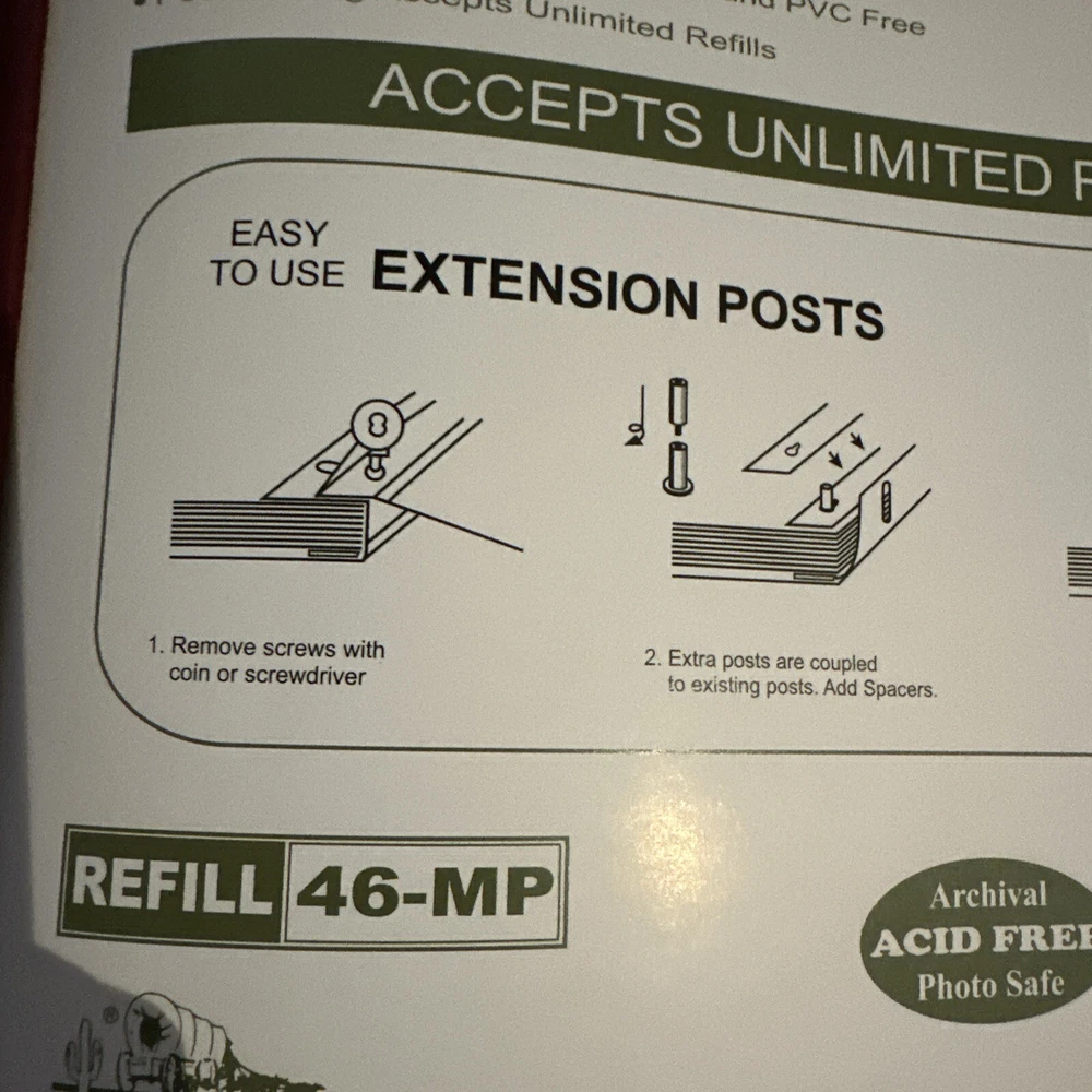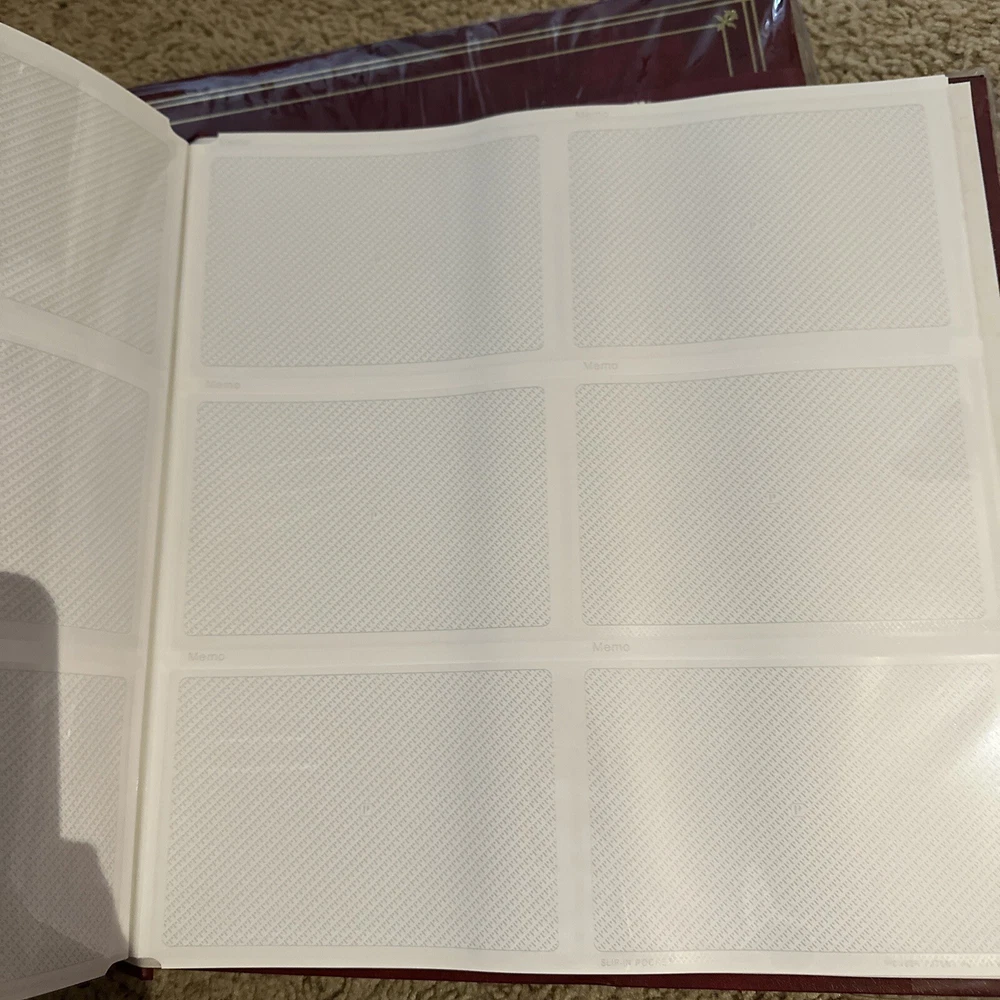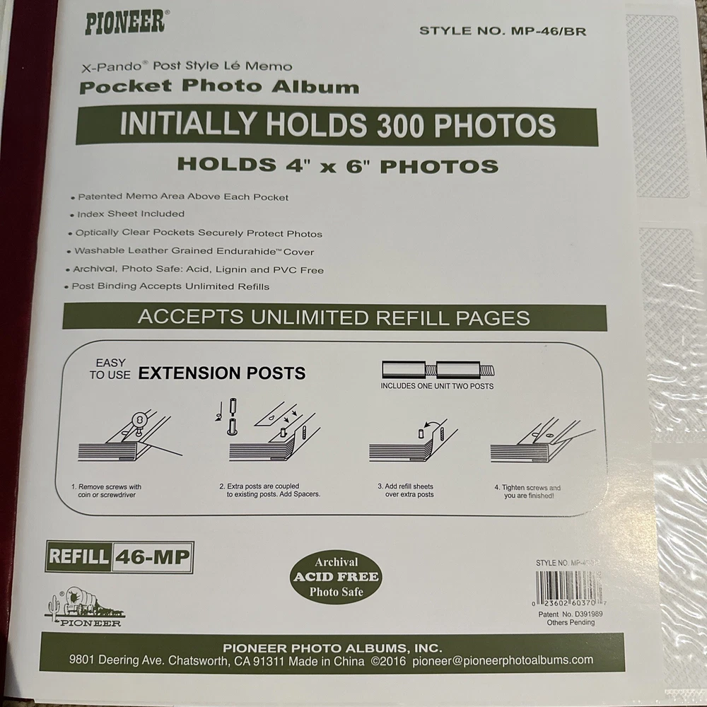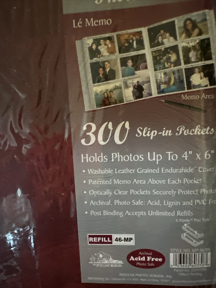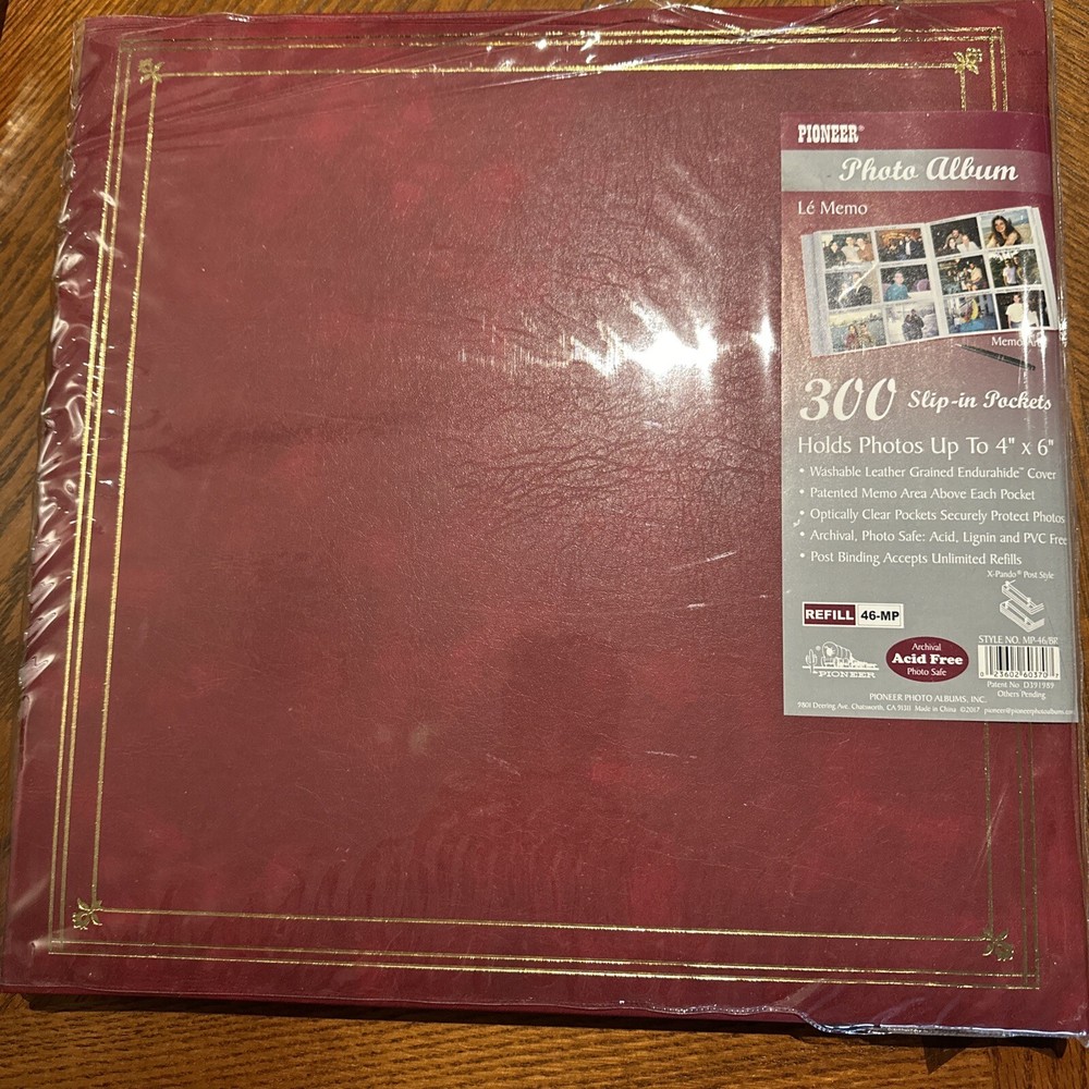 14.5” x 14.5” each page side holds Six photos up to 4x6”. Hearty well built XL 3.5 lb albums that are expandable to hold all your best printed memories for display and protection This Pioneer Photo Album is the perfect choice for those who love to keep their memories alive. With a capacity of 300 up to 4x6" photo size, this refillable album is ideal for both professional and family use. The post-bound format ensures the album is easy to expand and allows you to organize your photos in any way you like. • Washable Leather Grained Endurahide" Cover • Patented Memo Area Above Each Pocket • Optically Clear Pockets Securely Protect Photos • Archival, Photo Safe: Acid, Lignin and PVC Free • Post Binding Accepts Unlimited Refills X-pando° Post Style The album has a maroon cover, making it a stylish addition to your collection. The memo area on each page allows you to add notes or labels to your photos, making it easy to remember the important details. This Pioneer Photo Album is a high-quality product from a trusted manufacturer and is perfect for anyone looking to keep their treasured memories safe. Stored in a clean smoke free home 2 available, price listed is for one new album