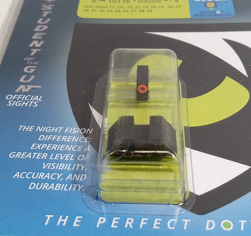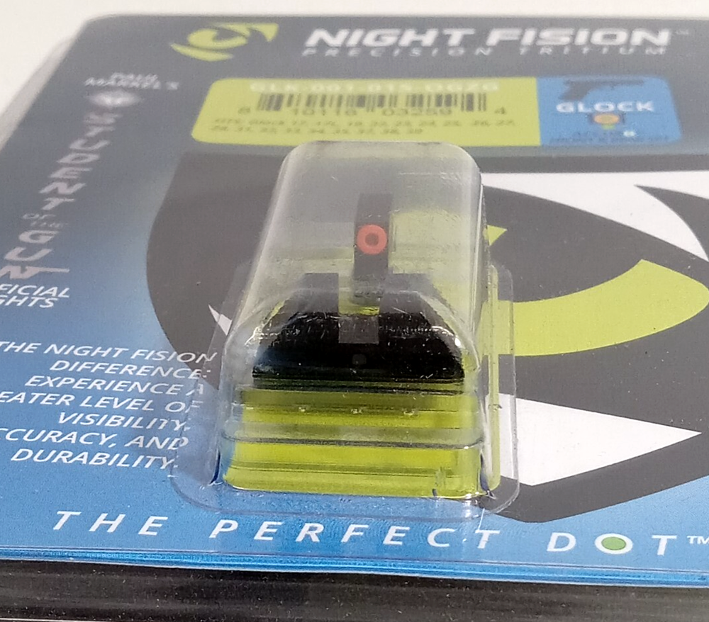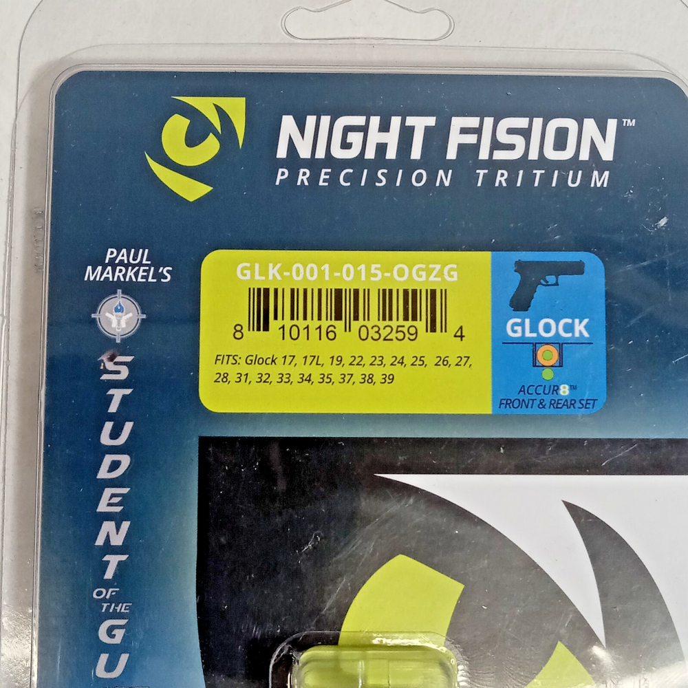 Night Fision Tritium ACCUR8 Front & rear SET! Night Sight Orange/Green Dot Glock 17 17L 19 22 23 24 25 26 27 28 31 32 33 34 35 37 38 39 20 21 29 30 36 40 41 42 43 43X 48 - GLK-000-001-OGXX DESCRIPTION: Night Fision utilizes an injection molded process and military-grade polymer with durable polymer tritium outlines to give you flexibility and unrivaled daytime visibility. With the exception of the tritium vials, imported from Switzerland, Night Fision products are crafted end-to-end right here in the USA. This front AND rear night sight has a square top, green tritium with a orange outline, and fits all Glocks. When it comes to tritium gun sights, aluminum sleeves and painted-on white rings are the norm. Night Fision breaks the mold, literally. Our patent-pending injection molded sleeve design not only holds our tritium vials securely in place, it creates a brighter and more durable ring, we call The Perfect Dot, that provides maximum visibility both day and night. Features Type: ACCUR8 system Front & Rear SET Series/Collection: Perfect Dot Finish: Nitride Coated Color: Green with Orange Outline Front, Black Frame For Use With: Glock 17, 17L, 19, 22, 23, 24, 25, 26, 27, 28, 31, 32, 33, 34, 35, 37, 38, 39, 20, 21, 29, 30, 36, 40, 41, 42, 43 Pistols Dimensions: 0.213" H Front Notch Style: Square Blade Width: 0.14" Front Blade Height: 0.163" Front