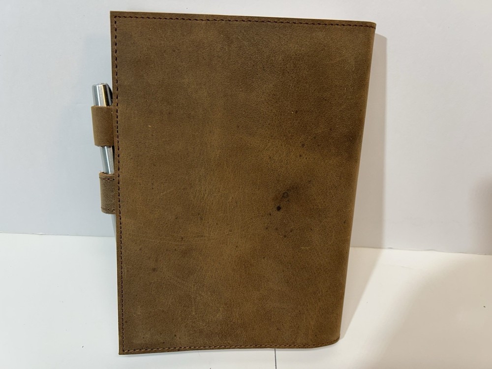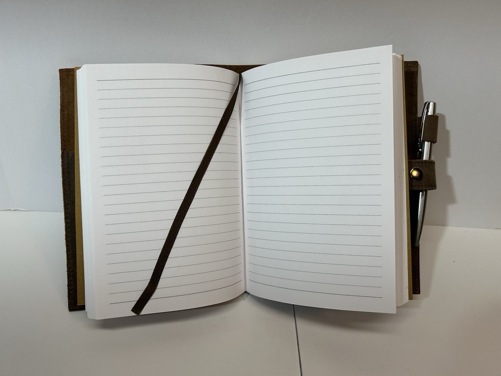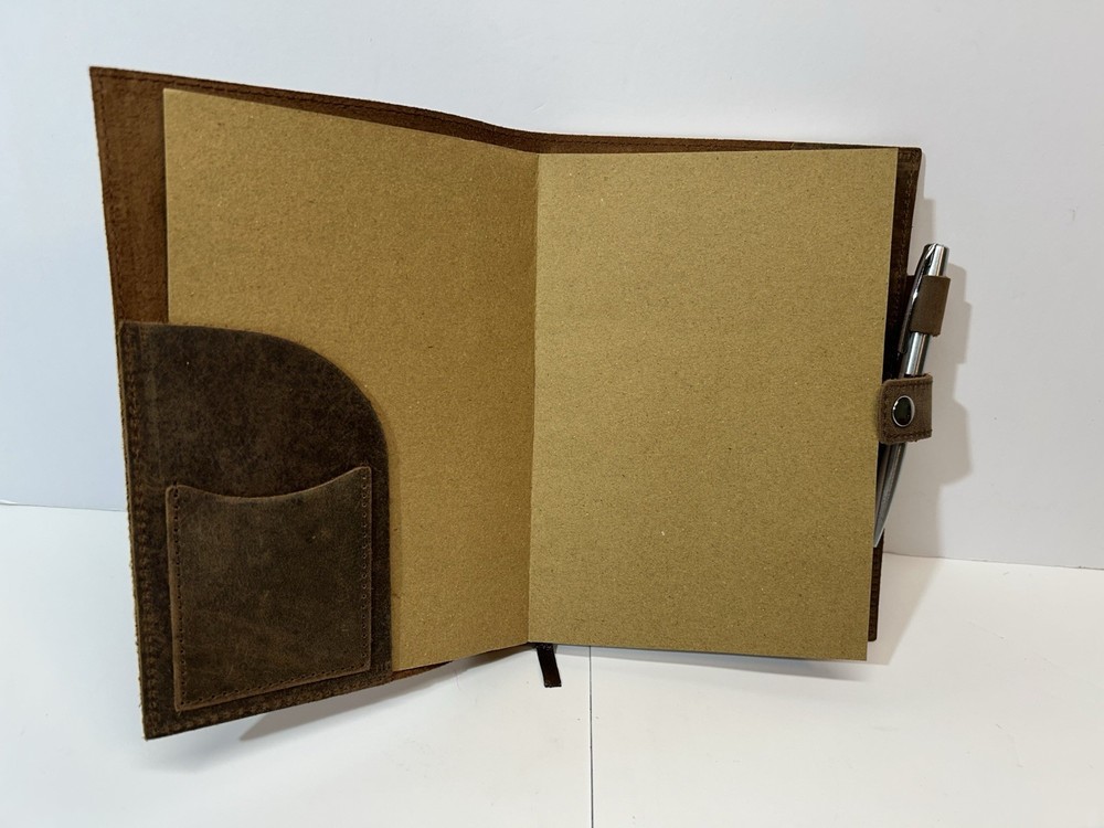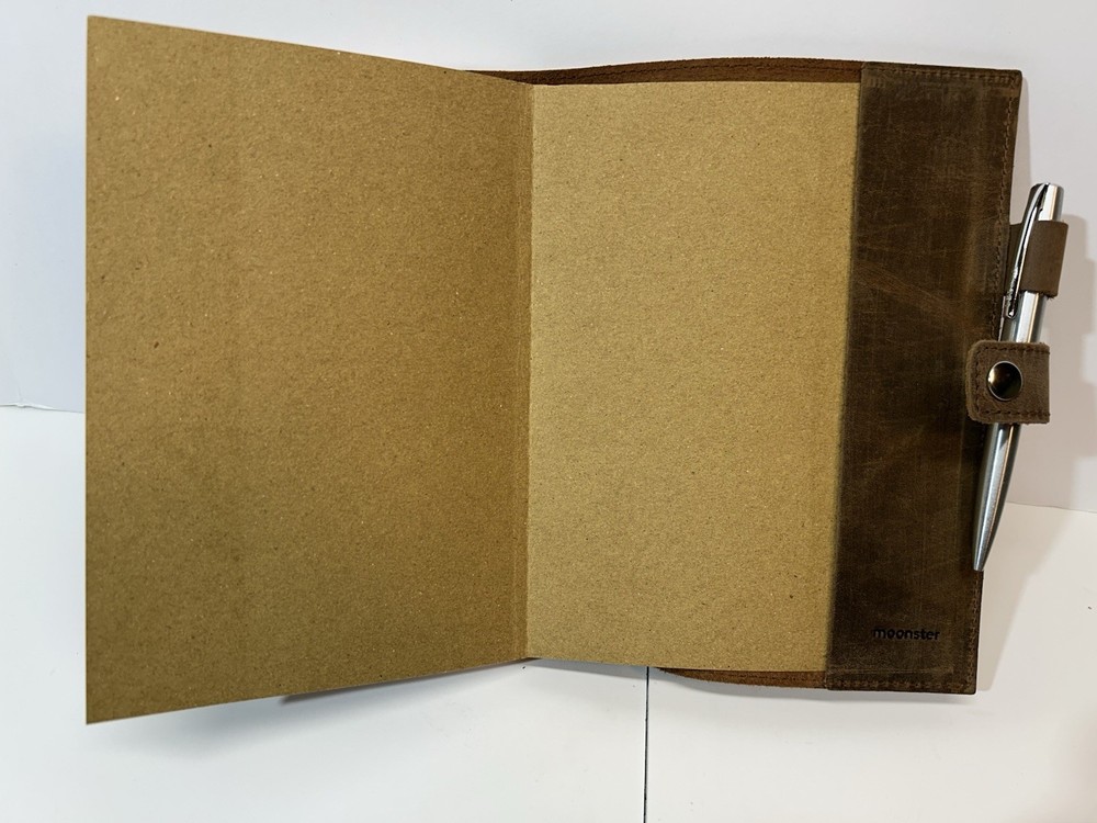 New in box rustic leather bound journal by handmade by Moonster. Journal has an integral ribbon bookmark, snap closure and ball point pen. Journal cover is undecorated front and back. Includes undamaged unmarked original box and promotional insert card.