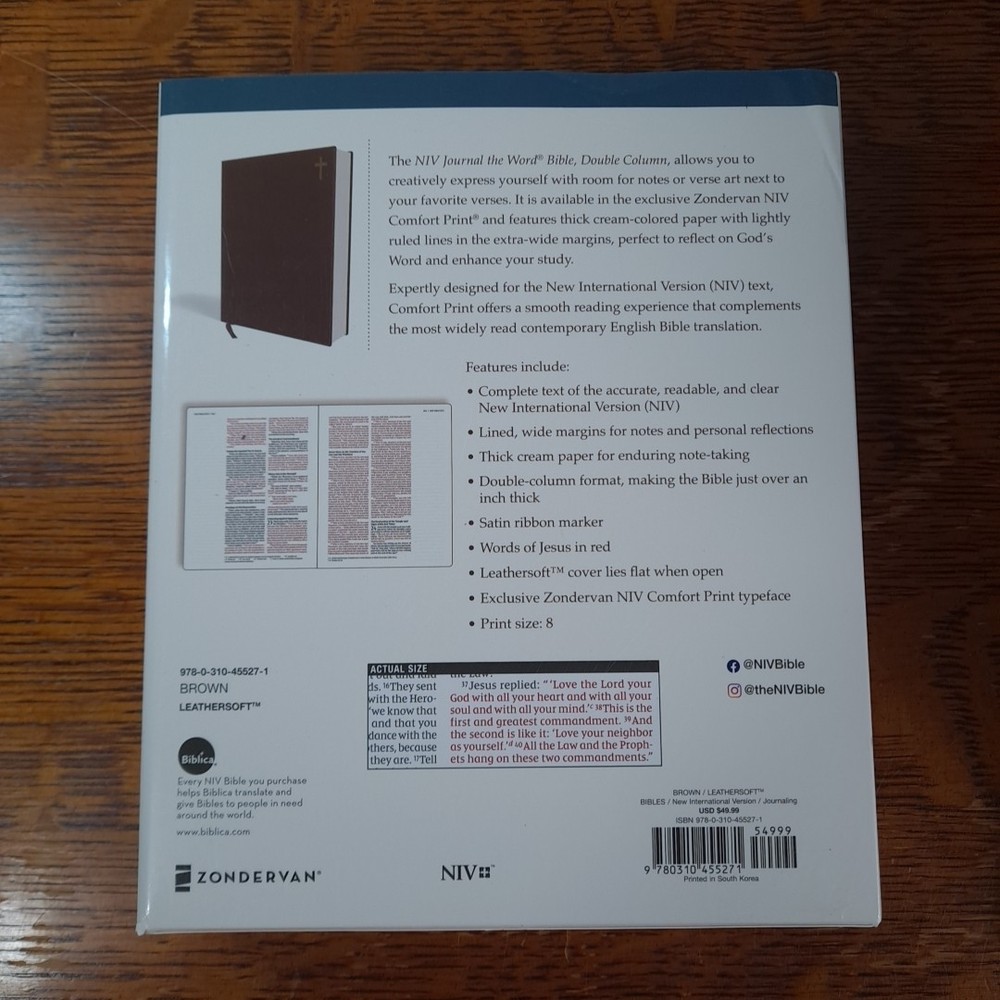 This Bible is absolutely stunning—the leathersoft cover feels luxurious, and the double-column layout makes reading effortless. I love the extra-wide margins for journaling my thoughts and prayers. The NIV text is clear and easy to follow, perfect for both study and reflection. The elegant brown and red design adds a classic touch. It’s become my go-to for quiet time, helping me connect deeper with scripture. Highly recommend for anyone who loves to reflect as they read!