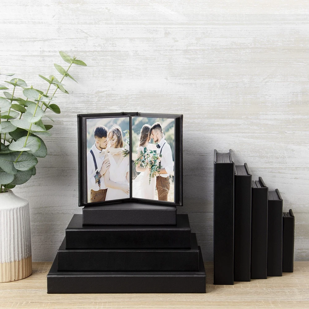 Holds 20 photos in 5" x 7" size Made of a rich leatherette material Easy peel and stick assembly Includes a presentation box Perfect for wedding photographers or portrait photographers who like to assemble photos on site instantly
