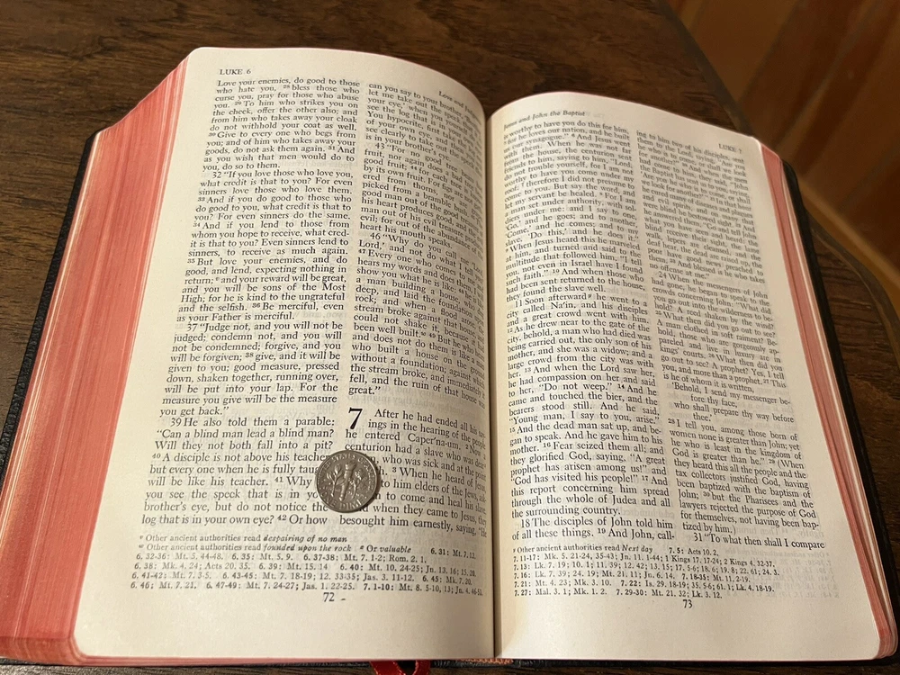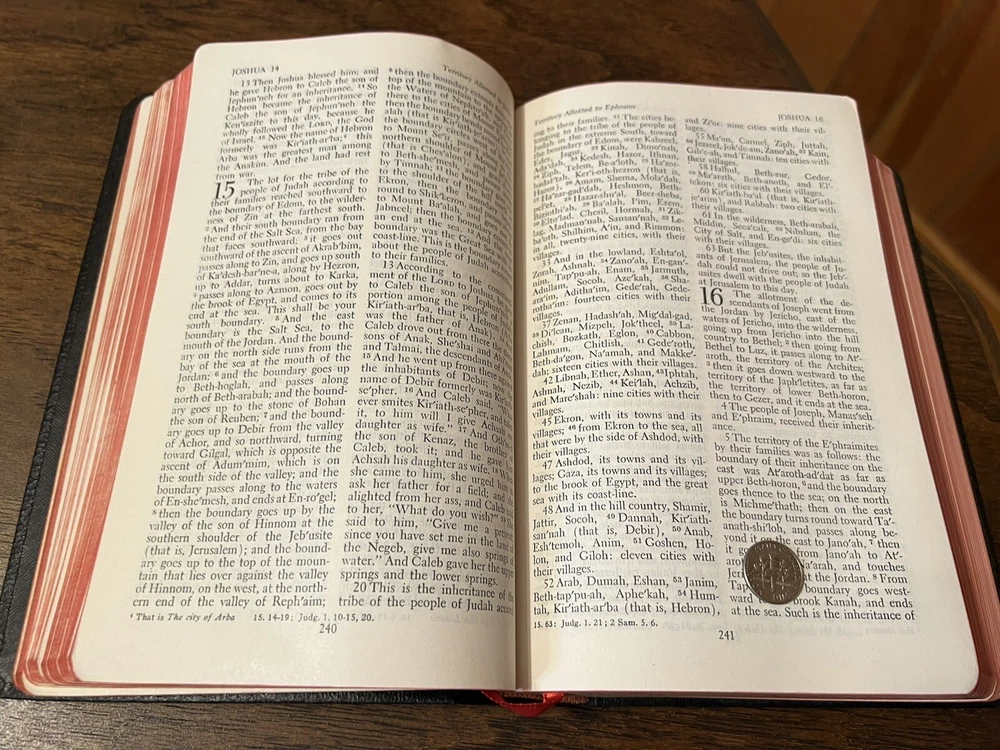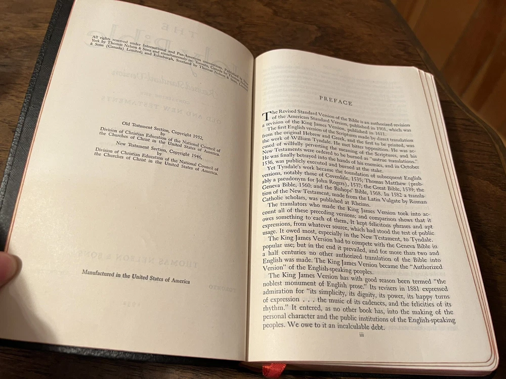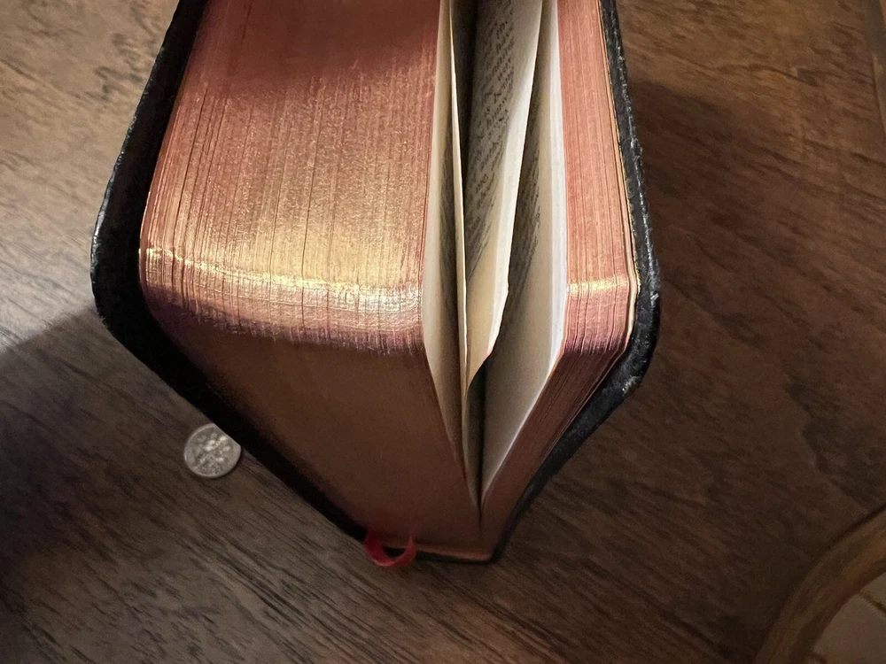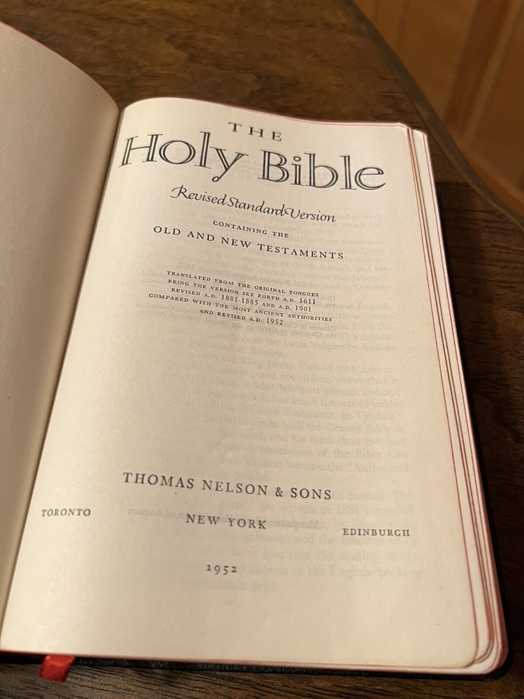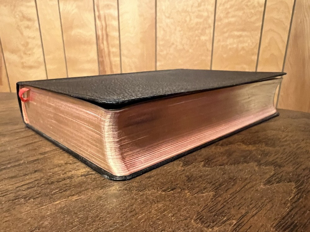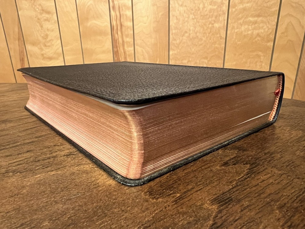 Nelson RSV Revised Standard Version Bible Genuine Leather 3807 Text Edition This is a beautiful and certainly unread RSV text edition in genuine leather with gilt page edges in practically perfect condition. This is the classic text edition with opaque paper, clear typeface, and a very pleasant reading experience. The leather is flexible and in remarkably good condition. The binding has only a few abrasions I could see. This is a classic RSV text, but rarely found in such good quality with art gilding! It’s also the thickest copy I’ve ever handled. The pages still stick and, just from opening it, it is clear that it is in mint condition. I don’t think it was ever opened until I inspected it. There is no writing anywhere I could see. The art-gilt is essentially perfect, with the tiniest of imperfections. It’s amazing how perfect it is! Sewn Black letter Double column Text edition Art-gilt page edges 8.5 x 5.75 x 1.5 inches Dime used for comparison Note: I do not accept returns unless the item was not as I described because of a mistake I made. If the item is smaller than you thought it would be (because you didn’t read the description with dimensions), that’s on you. I do not cancel orders for any reason, even if you accidentally ordered it. It takes about 3 steps to purchase an item, so if you paid for it, it’s yours. I make these annoying rules because so many customers have recently treated the purchase of items flippantly and I have to draw a line somewhere. Well, here it is. I always list any writing, stains, tears, or imperfection of any kind. And I always list the condition conservatively, so you should expect the item to be in better condition than listed. Unlike the vast majority of sellers out there, I refuse to hide imperfections through cleverly taken pictures or obscure descriptions. I try to include as many pictures as necessary to highlight the imperfections rather than the beauty of the items, which is part of why I have an elevated Seller Status and perfect feedback in which many consistently report back “just as described” or “better than described.” If I miss something by accident, please contact me so I can make it right. My flawless feedback should speak for itself, but you won’t be disappointed! Thank you for your business and God bless!