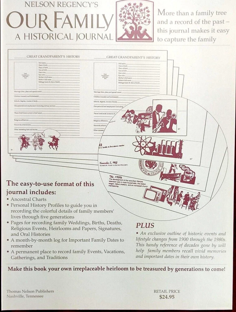 Nelson Regency's Our Family Historical Journal Book Leather Bound Unused Slight imperfection at top of binding also right there some gold gilt is missing from the pages otherwise Excellent Condition Please see photos Inventory Loc: Books SHIPPING: USPS or FedEx or UPS whatever is most economical. We ship all items within 1 business day of your payment clearing (excludes weekend and holidays) RETURNS: We will accept any item back for a return within 30 days as long as all items included are sent back in the same condition they arrived in. Buyer To Pay Return Shipping. FEEDBACK: We strive to earn positive 5 star feedback for all items. We will leave the same for all good buyers. If you feel we deserve anything less please send us a message before leaving anything less or opening a case and we will fix the issue within 24 hours. Thank you!!!