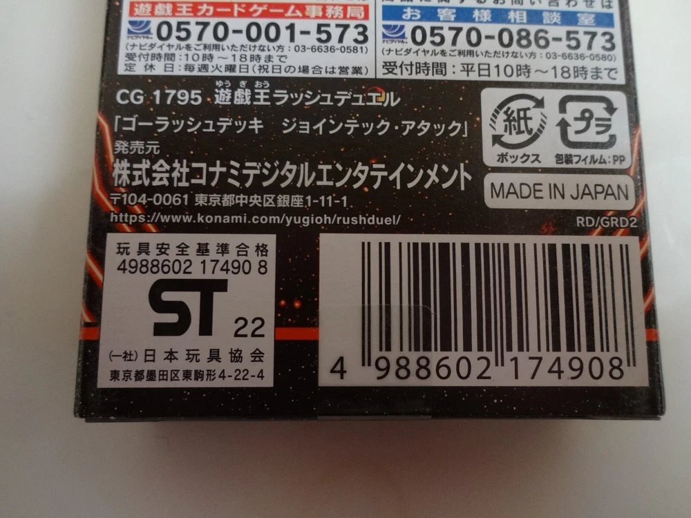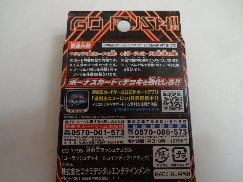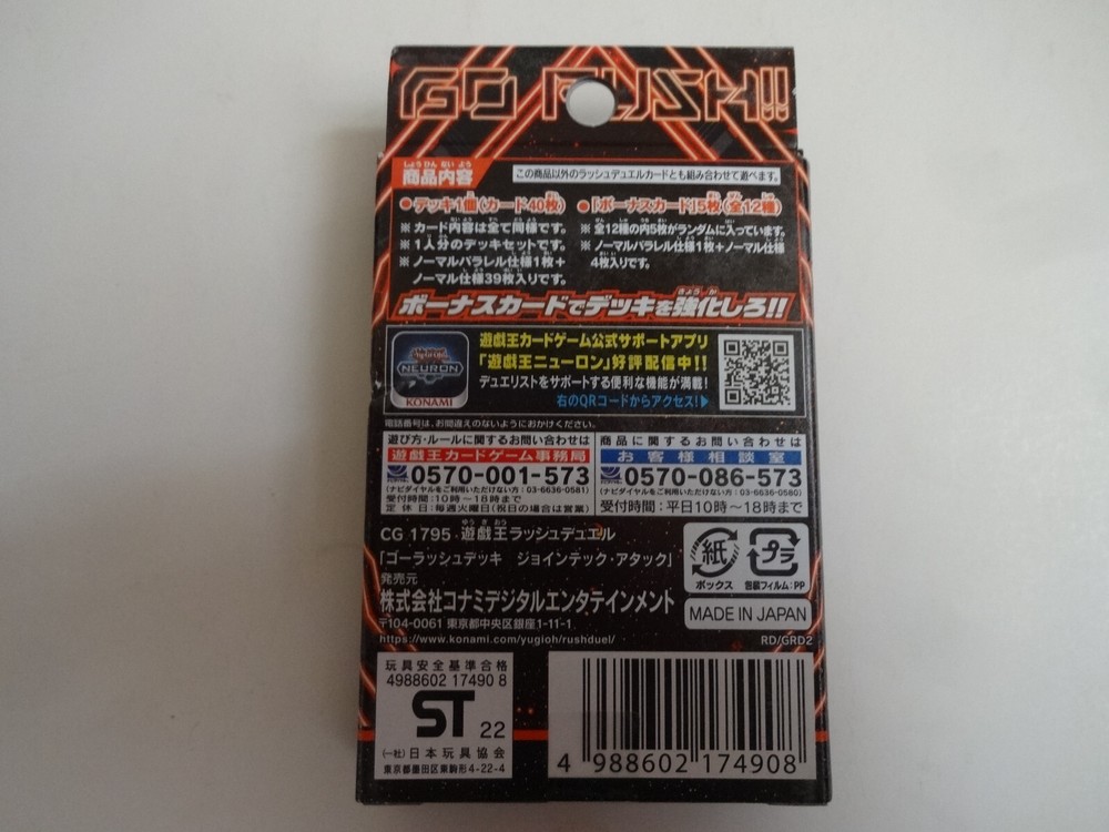[Product Description] Thanks for visiting. I always do my best. I do package very well for my buyers to receive it in an excellent condition. This product is Konami Yugioh Rush Duel Go Rush Deck "Jointech Attack". It is a new unopened item. Release year: 2022 Product code: 4988602174908 Product introduction An introductory deck based on the character "Oudou Yuhi" from the new anime "Yu-Gi-Oh! Go Rush!!"! In addition to the fixed deck of 40 cards each, 5 "bonus cards" with random elements are included from a total of 12 types, allowing you to experience deck arrangement! The "bonus card" always includes 1 type of legendary card that can only be put in the deck! Yu-Gi-Oh Rush Duel Go Rush Deck Galactica Alive will be released at the same time! Product content ・ Pre-constructed deck:1 (40 cards) (1 normal parallel, 39 normal) ・ Bonus card:5 cards (1 normal parallel card, 4 normal cards) [International Buyers] Import duties, taxes, and fees are not included in the item price or shipping cost. These costs are the responsibility of thepurchaser. Product Description Import duties, taxes, and fees are not included in the item price or shipping charges. These fees are usually collected by the shipping (freight) company or at the time of receiving the goods, and should not be confused with additional shipping charges.