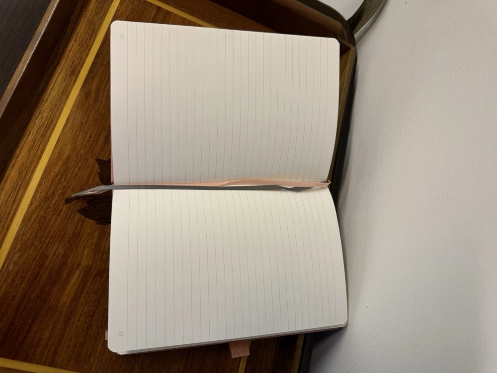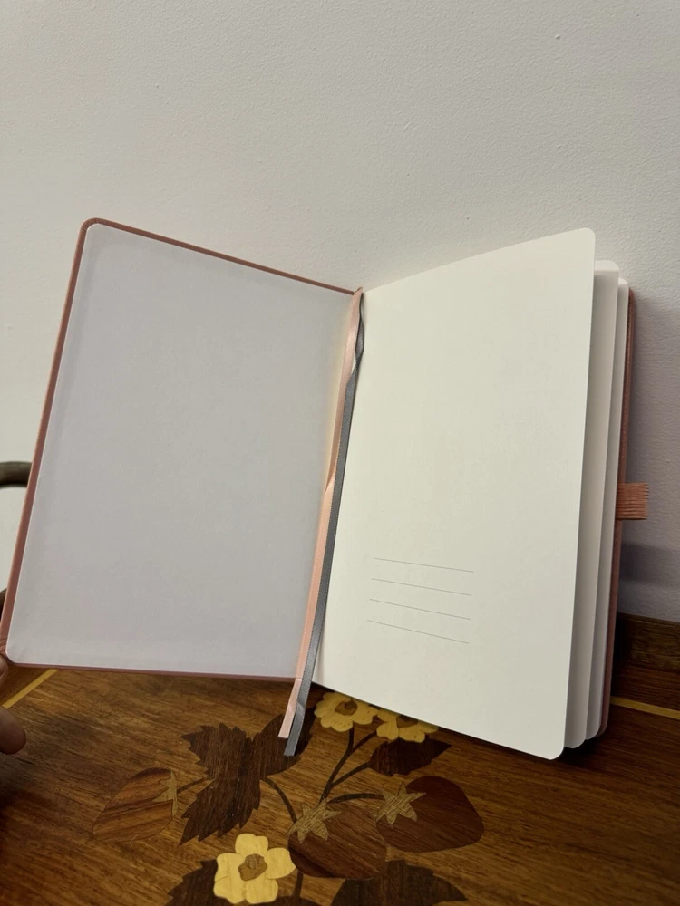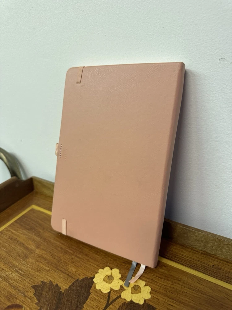 New unused Pink Leatherback Ruled Lined Journal. It has Index/Table of Contents Pages, a back pocket with organizer tabs, an elastic pen holder, an elastic band closure and two ribbon bookmarks.