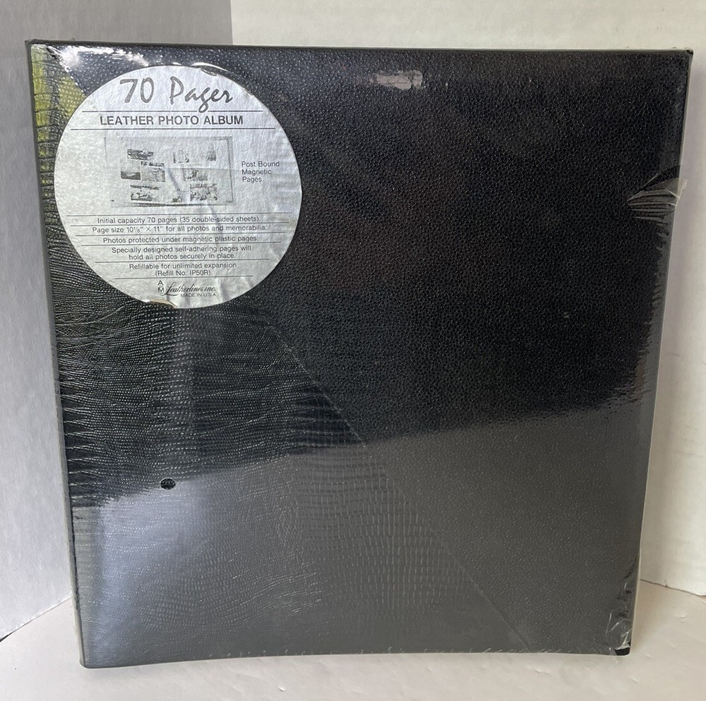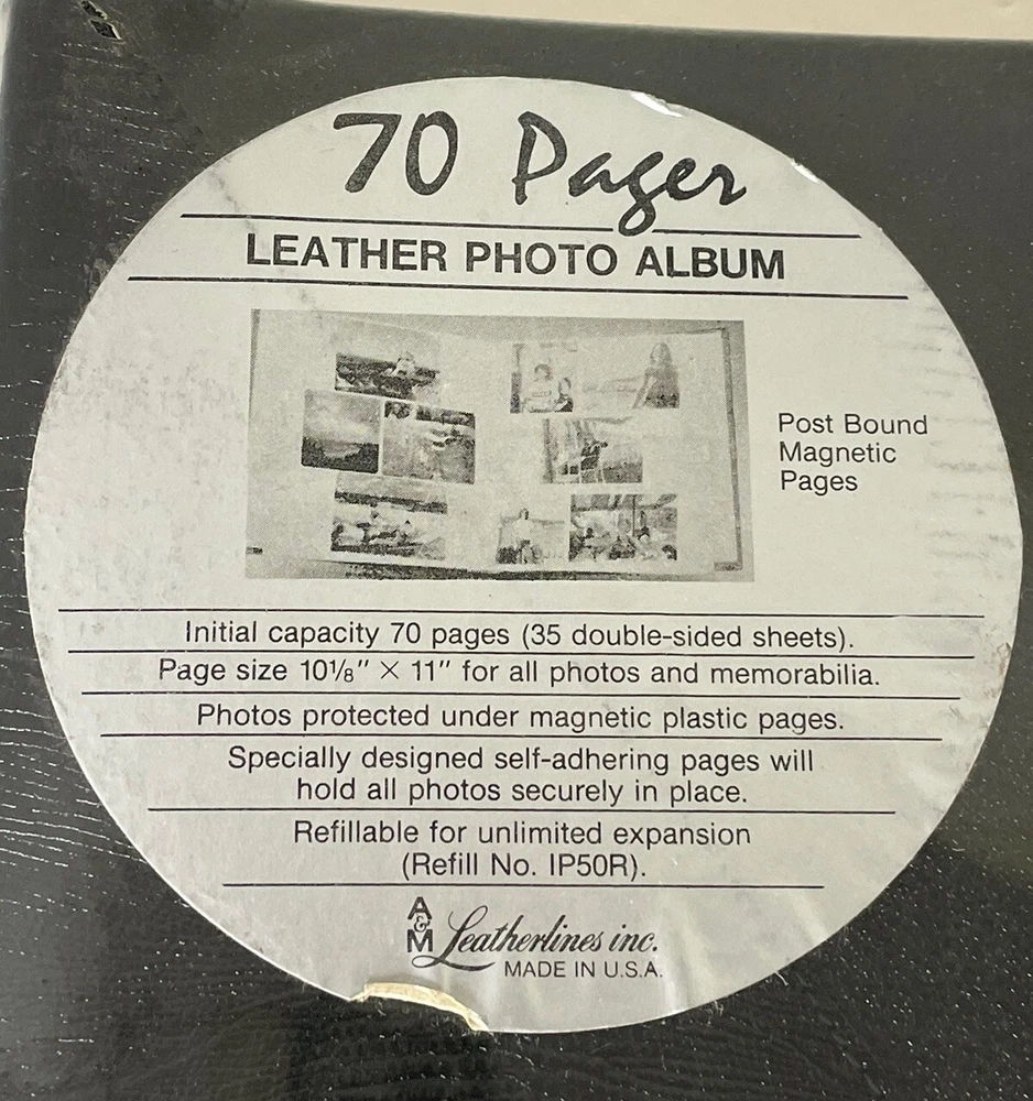 Up For Consideration is for a LEATHER PHOTO ALBUM 100% Guaranteed Authentic or Your Money Back! New Sealed Condition Black Leather Photo Album Post Bound Magnetic Pages Initial Capacity 70 Pages (35 Double-sided Sheets) Page Size 10 1/8” x 11” for All Photos And Memorabilia Photos Protected Under Magnetic Plastic Pages Specially Designed Self-Adhering Pages Will Hold All Photos Securely in Place Refillable for Unlimited Expansion Refill No. IP50R A&M Leatherlines Inc. Made in U.S.A ~ Terms ~ All items have been carefully checked for an accurate description. If something is overlooked or if you have an issue with an item you have purchased, please advise me before leaving any negative or neutral feedback, or anything less than 5 stars. I will do my best to resolve any issues. If for any reason I misrepresent the item, return it in same condition received within 30 days and I will gladly refund your purchase price. Please make sure you agree with all terms and conditions. ~ Payment ~ PayPal is the only acceptable form of payment. Please pay within 3 days. If you cannot pay within 3 days please contact me. If there is no payment within that time I reserve the right to re-list the item and an unpaid item case will be opened. ~ Shipping ~ Item will be shipped within 24 hours of receipt of payment. I will only ship within USA and those Countries in the Global Shipping Program. If you have any questions feel free to contact me. Thanks for looking and Happy Bidding!! Track Page Views With Auctiva's FREE Counter