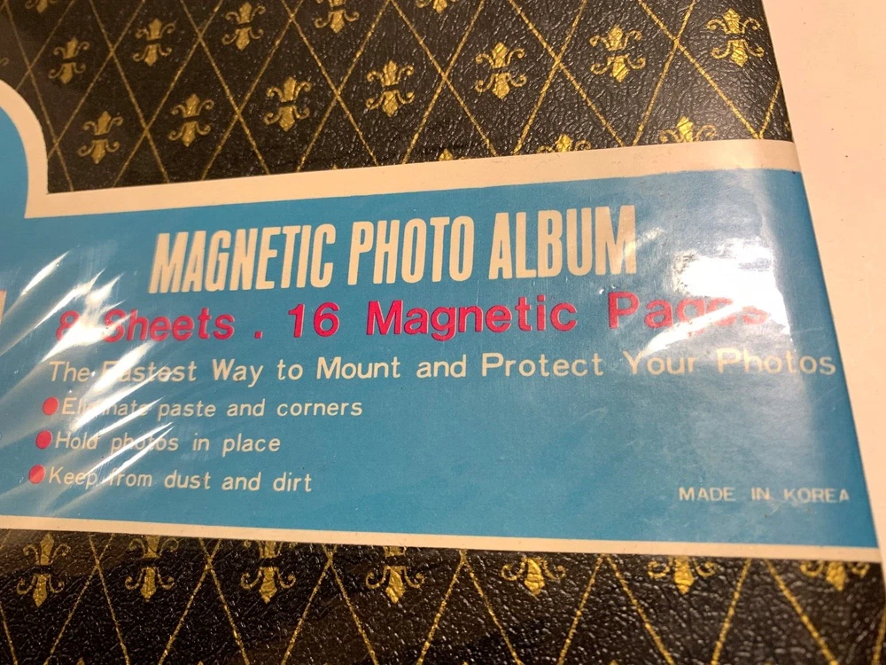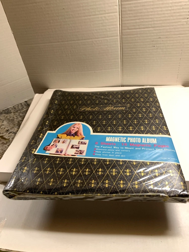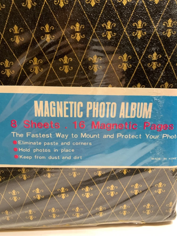 **Please do not copy our auction, photos, description etc.. It is a against eBay policy and just dishonest, thank you!** whtcmibox-mtpicframes****************************** *************** ***************************** ************************** So much better than the photos! All of our photos are taken in bright light to show true color, condition and details. We do not use filters to make our items look better, they are as seen in our numerous photos. New Sealed nice quality Magnetic PHOTO ALBUM 9x12" true vintage with Fleur-de-lis Leatherette Cover in black and gold, made in KOREA, great price! Comes from a smoke and pet Free environment.