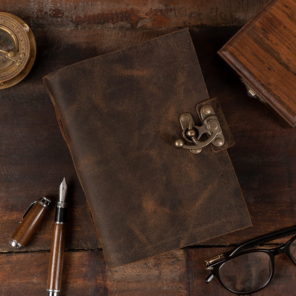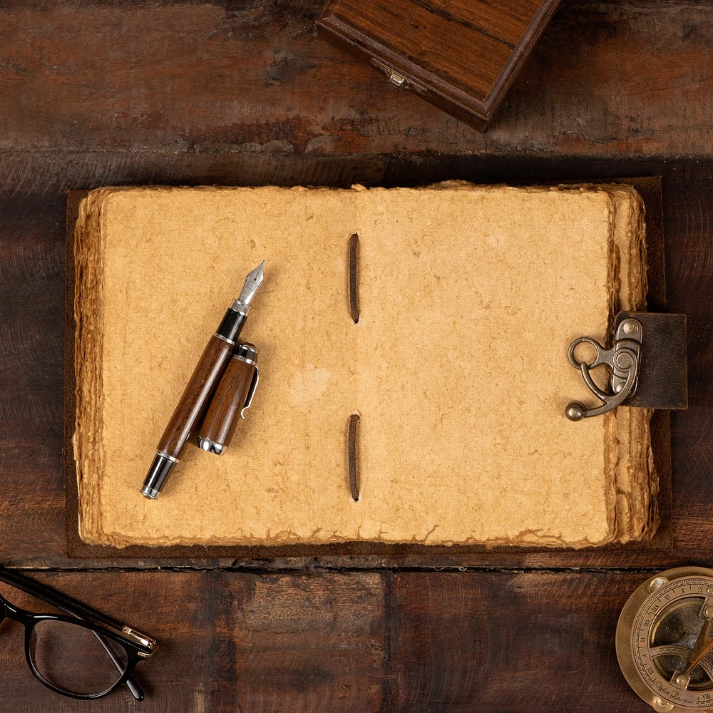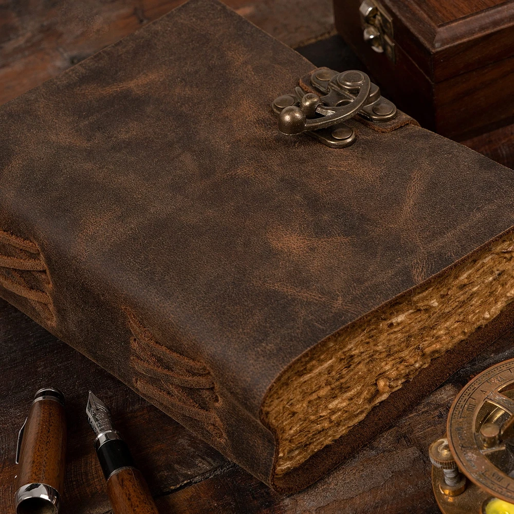Bring out your inner creativity with the NomadCraftsCo. Antique Leather Bound Writing Journal for Women and Men! The deckle edged vintage paper looks and feels like a thousand years old is treat to write on. The paper is made from environmentally friendly cotton and jute canvas. The paper is acid-free and pH nuetral therefore is a timeless piece of art. No more worries about ink messing up the pages either. The thick pages are ideal for pen, pencil, crayons and even charcoal! We can guarantee no bleed through! The vintage leather journal is a perfect sketchbook , book of shadows,grimoire, wicca, calligraphy journal, scrapbook, art journal, leather sketchbook and manymore. The leather bound journal made from antique paper is a treasure that you can pass down the generations. The leather is soft and supple to the touch and smells amazing. The leather will age over time and will get better and better. Its the perfect travel companion to cherish memories or even to jot down precious ideas and there is not better way preserve your memories for your future generations. Get Yourself The Most Valuable Travel Companion Today – Never Have To Travel Alone Again . Handcrafted by skilled artisans with a lot of love and care. Here’s Why This Vintage Leather Bound Writing Journal Is What You Are Looking For: 1. Soft Luxurious Durable and Supple Rustic Leather Bound Cover which ages with time. 2. 240 Pages of Thick Antique Vintage Cotton Paper which looks like thousand years old. 3. Sturdy Leather Binding Technique will make sure that the pages never fall off. 4. Large size 11.5 by 8.25 inches rustic scrapbook/organizer easily portable. 5. Being hand-made, no two journals are quite the same. UNIQUE HANDMADE VINTAGE PAPER - Nomad Crafts Co. Vintage Journal is made with 240 pages of Antique Paper which looks like it was pulled from history. You will fall in love with the the antique handmade cotton paper which is very unique to our Nomads Vintage journal. VINTAGE LOCK AND STURDY BINDING - The vintage lock will keep all your valuable writing locked inside.Sturdy hand stitched binding to make sure that no paper comes out loose from your vintage notebook. ANY KIND OF PEN - Sketch, Doodle, Write on your Leather Bound Journal with a Calligraphy Pen Fountain Pen, Brush Pen, Ball Pen, Acrylic Colours, Watercolor and many more. PREMIUM SOFT SUPPLE THICK GENUINE LEATHER - The Nomad Leather Journal is made from naturally tanned full grain leather which feels and smells Amazing. It's soft and very comfortable in the hands. Don't be fooled with competitors using cheap substitutes, this is the real deal. OUR 365 DAY REPLACEMENT PROMISE - We are very confident that you will fall in love with your Vintage Journal that we offer a 1 year guarantee .If you are not happy with your leather journal for any reason we will offer a FULL REFUND or a FREE REPLACEMENT. No Questions asked!