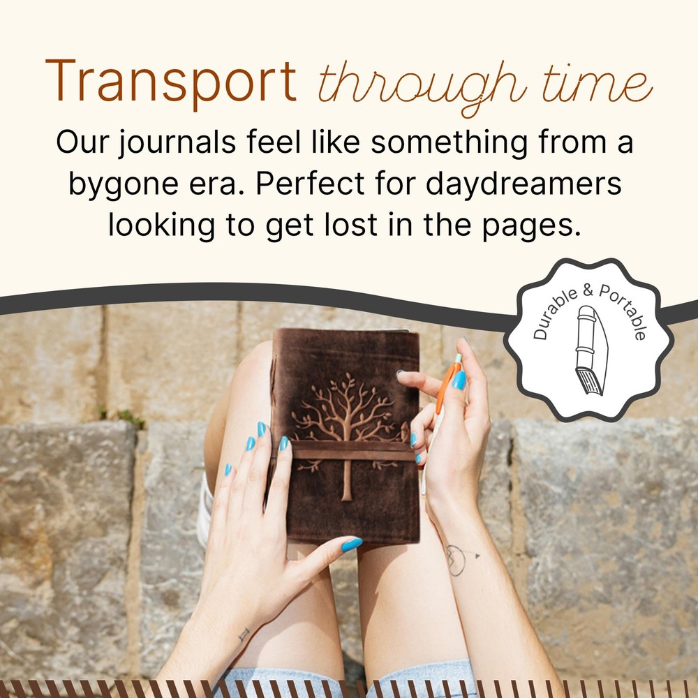 Get Yourself The Most Valuable Travelling Companion Today – Never Have To Travel Alone Again The deckle edged vintage paper looks and feels like a thousand years old is treat to write on. The paper is made from environmentally friendly cotton and jute canvas. The paper is acid-free and pH nuetral therefore is a timeless piece of art. No more worries about ink messing up the pages either. The thick pages are ideal for pen, pencil, crayons and even charcoal! We can guarantee no bleed through! The vintage leather journal is a perfect sketchbook , book of shadows,grimoire, wicca, calligraphy journal, scrapbook, art journal, leather sketchbook and manymore. The leather bound journal made from antique paper is a treasure that you can pass down the generations. Here’s Why This Vintage Leather Bound Writing Journal Is What You Are Looking For: 1. Durable and high quality leather bound cover. 2. 240 pages Vintage Paper for drawings, sketches, stories, pregnancy thoughts, writing prompts, food and exercise planning, fitness tips, and more! 3. Travel notebook for weight watchers, poets, writers, pen fountain lovers, artists, parents, world explorers, and yourself! 4. Medium size rustic scrapbook/organizer easily portable. 5. Being hand-made, no two journals are quite the same Manufactures Warranty applicable only if purchased from "NomadCraftsCo." Scroll Up & Click Add To Cart Now! UNIQUE HANDMADE VINTAGE PAPER - Nomad Crafts Co. Vintage Journal is made with 240 pages of Antique Paper which looks like it was pulled from history. You will fall in love with the the antique handmade cotton paper which is very unique to our Nomads Vintage journal. ANY KIND OF PEN - Sketch, Doodle, Write on your Leather Bound Journal with a Calligraphy Pen Fountain Pen, Brush Pen, Ball Pen, Acrylic Colours, Watercolor and many more. EXQUISITE & UNIQUE EMBOSSED TREE DESIGN: The Leather Bound Journal is made from thick Dark Brown Water Buffalo Leather which is Soft & Supple to the touch. We have taken extra to make sure that the emboss is perfect in every piece.The leather is tanned with a special oil that will allow you to create your own distressed style if you fold the leather. Our Journals are proudly made by Gifted Artisans and use the best genuine leather that is available. STURDY BINDING AND LEATHER WRAPAROUND - Sturdy hand stitched binding to make sure that no paper comes out loose from your vintage notebook . The leather wraparound keeps the papers of the journal safe and secure. OUR 365 DAY REPLACEMENT PROMISE - We are very confident that you will fall in love with your Vintage Journal that we offer a 1 year guarantee .If you are not happy with your leather journal for any reason we will offer a FULL REFUND or a FREE REPLACEMENT. No Questions asked!