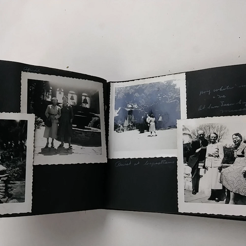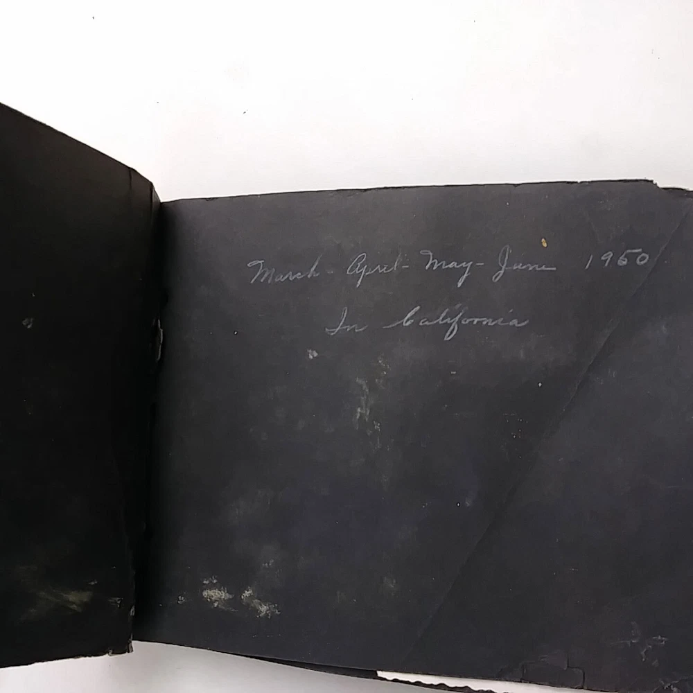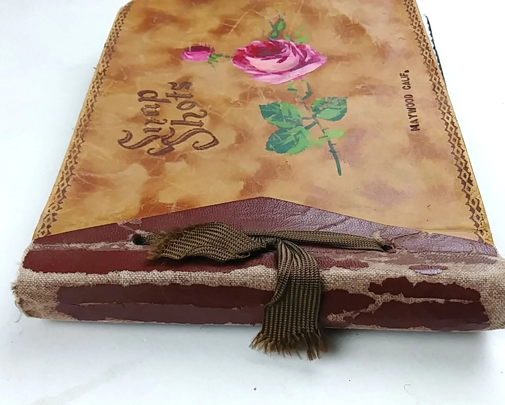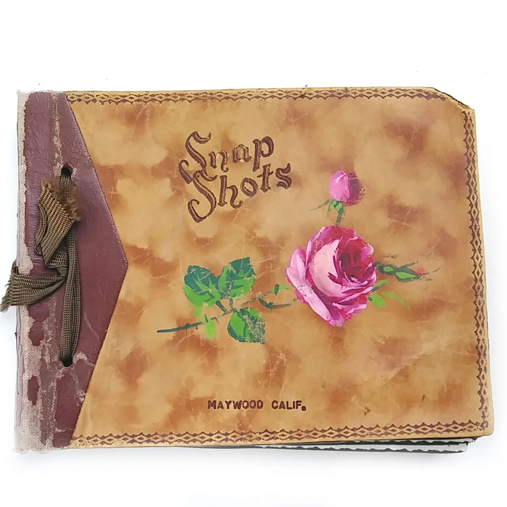 1950 Snap Shots Leather Bound Photo Album, Haywood California 47 Pics March-June 1950 trip to Haywood, California. Hand painted cover. Black & white pictures are mostly of people/family, some background scenery. Girl Scout Breakfast Menu. Decent condition, some wear.
