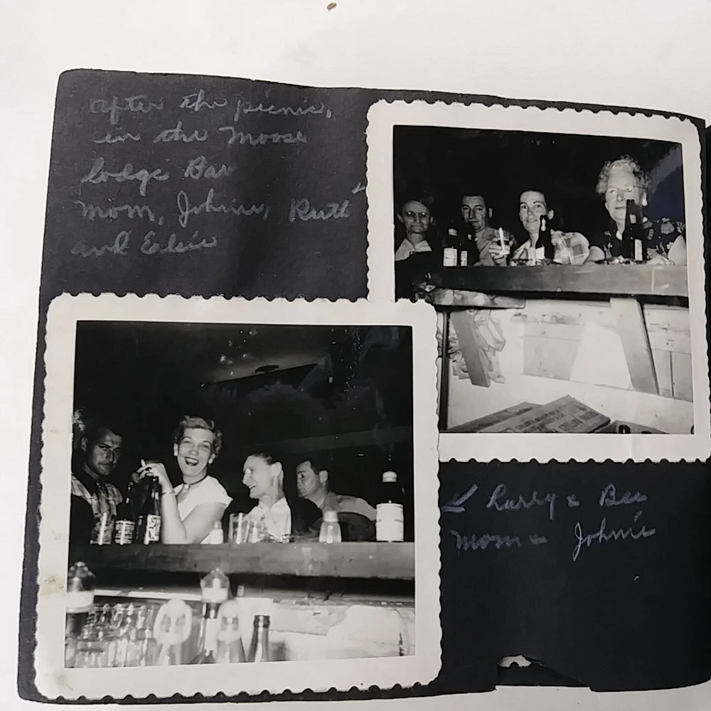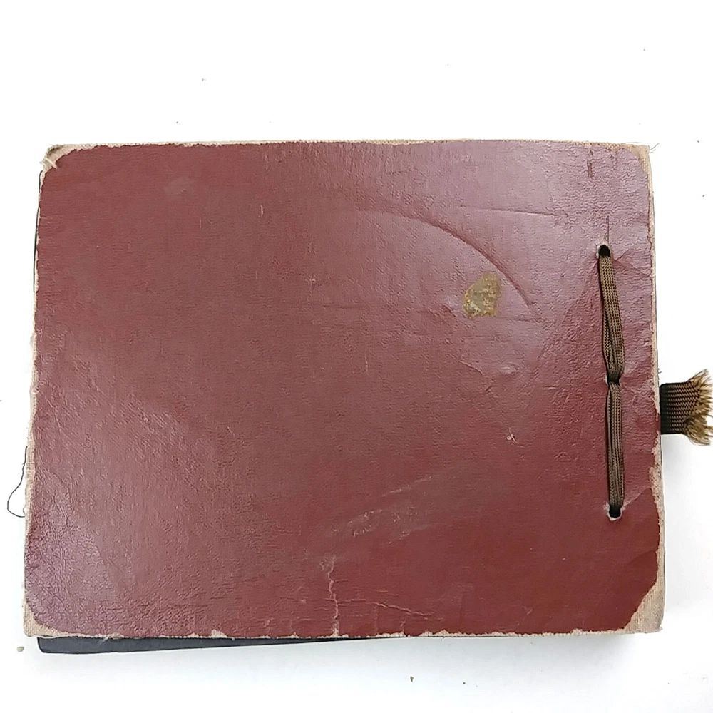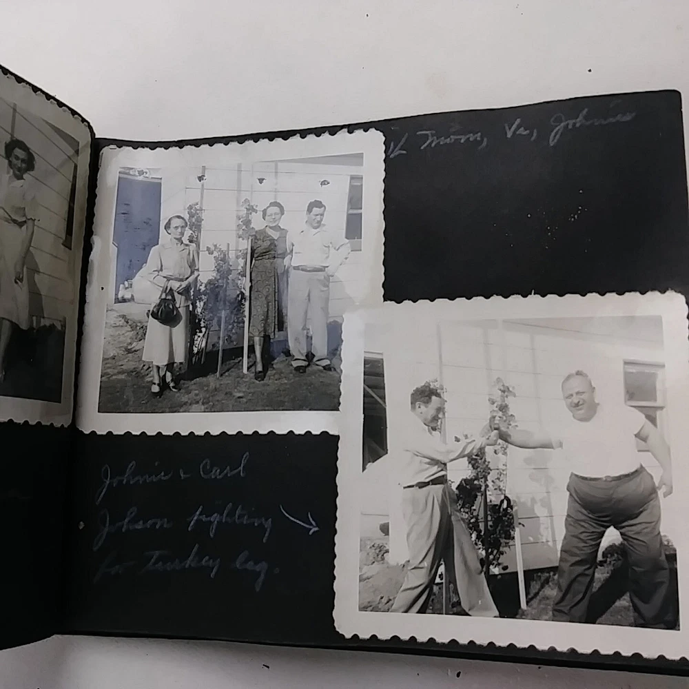 1950 Snap Shots Leather Bound Photo Album, Haywood California 47 Pics March-June 1950 trip to Haywood, California. Hand painted cover. Black & white pictures are mostly of people/family, some background scenery. Girl Scout Breakfast Menu. Decent condition, some wear.
