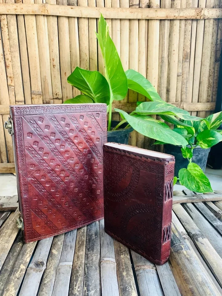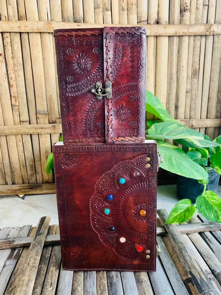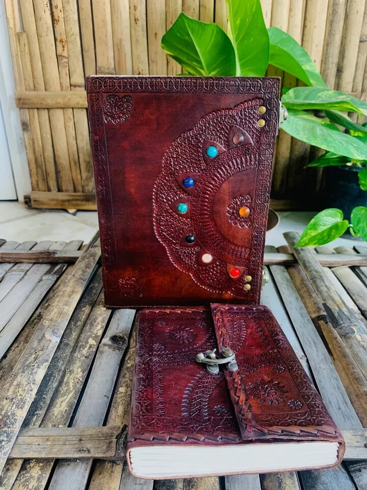 Beautifully Handcrafted – This journal is purely handmade and the leather is tanned naturally. The leather which has been used in making of this journal is genuine goat leather. Size – The size of this Journal is 8"H x 6"W Inch. 100 sheets/200(counting both side) of unlined off white/cream coloured papers. This journal is sewed through cotton thread. Multiple uses – This leather journal has multiple uses. You can write anything you want you can also make sketches in this. This leather journal is perfect for appointment book and planning book. Premium quality - The texture of the paper, the stone and the design on the cover makes it beautiful. This leather journal\diary has beautiful small flowers design embossed on all over. There are also 3 big stones at the front side of the journal. A timeless gift – This journal is a timeless gift for your loved ones. You can gift them on their special occasions and events.
