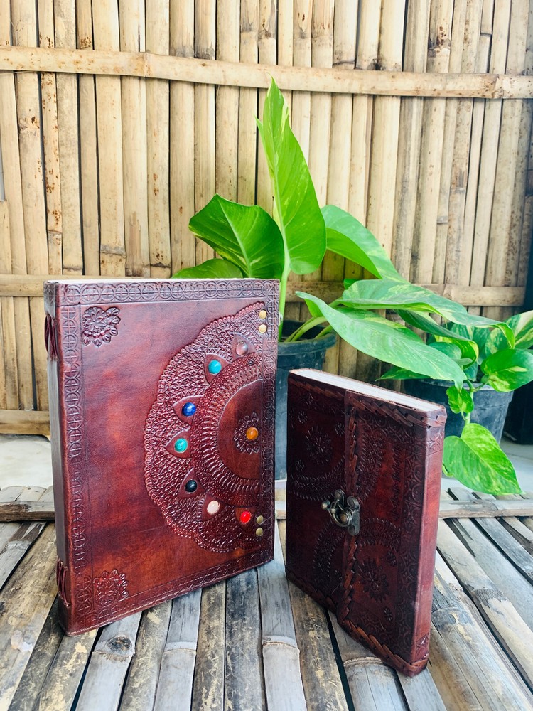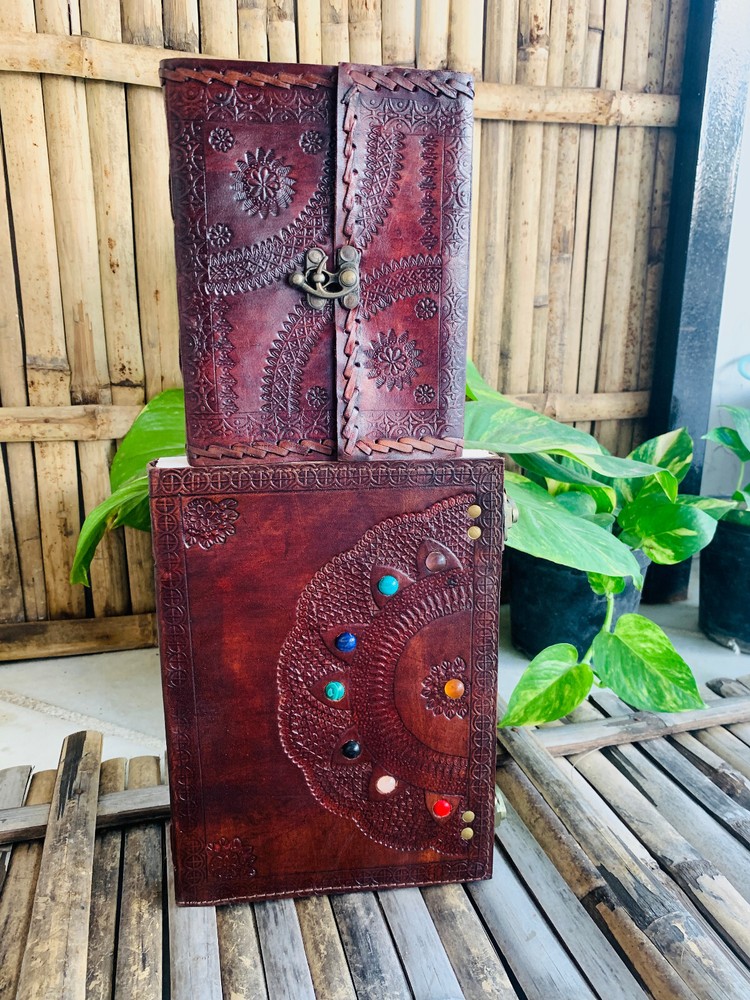 Beautifully Handcrafted – This journal is purely handmade and the leather is tanned naturally. The leather which has been used in making of this journal is genuine goat leather. Size – The size of this Journal is 8"H x 6"W Inch. 100 sheets/200(counting both side) of unlined off white/cream coloured papers. This journal is sewed through cotton thread. Multiple uses – This leather journal has multiple uses. You can write anything you want you can also make sketches in this. This leather journal is perfect for appointment book and planning book. Premium quality - The texture of the paper, the stone and the design on the cover makes it beautiful. This leather journal\diary has beautiful small flowers design embossed on all over. There are also 3 big stones at the front side of the journal. A timeless gift – This journal is a timeless gift for your loved ones. You can gift them on their special occasions and events.