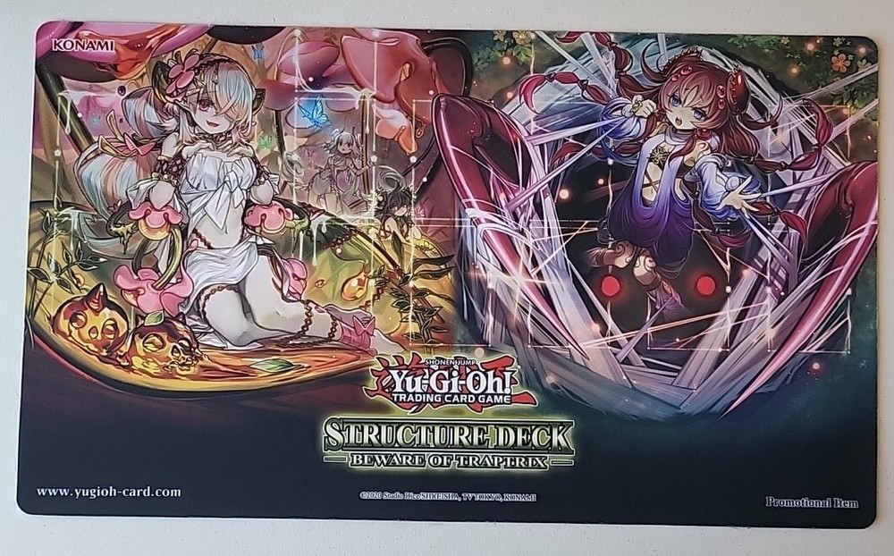 This official Yu-Gi-Oh! playmat features the Traptrix character and is from the Structure Deck: Beware of Traptrix release events by Konami. The mat is a standard size and is perfect for any Yu-Gi-Oh! TCG player. It is designed with high-quality materials to ensure durability and a smooth surface for easy card play. This CCG playmat is a must-have for any Yu-Gi-Oh! fan and is perfect for collectors or for use during gameplay. The mat is in great shape and is ready for a new owner to enjoy. Don't miss your chance to add this amazing piece to your collection!