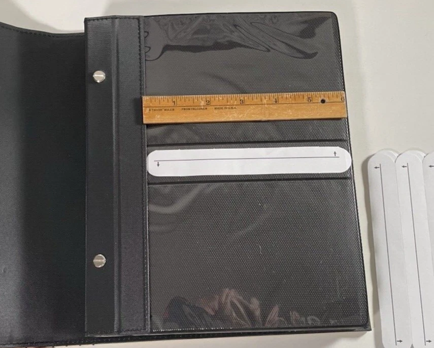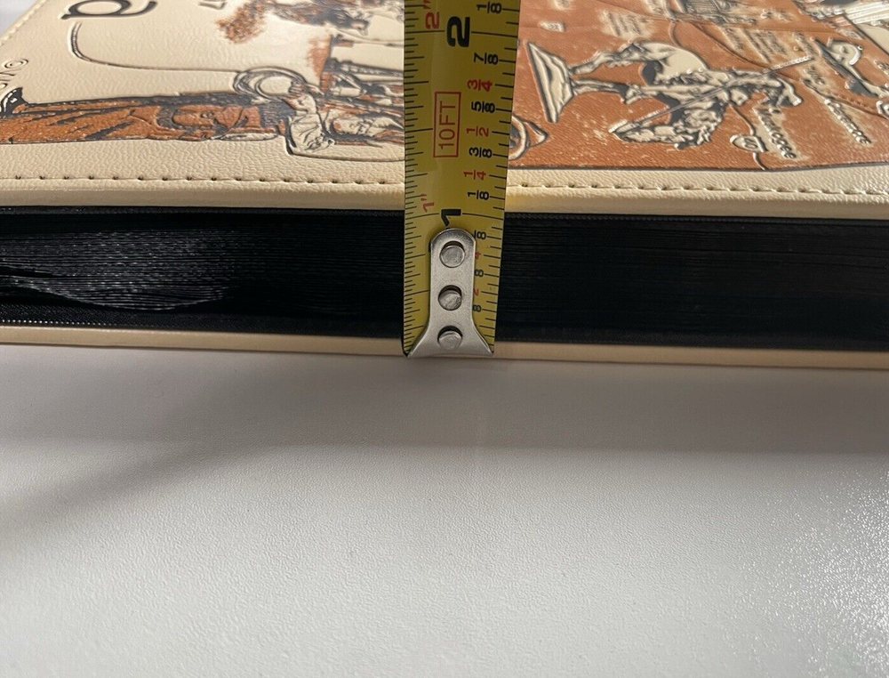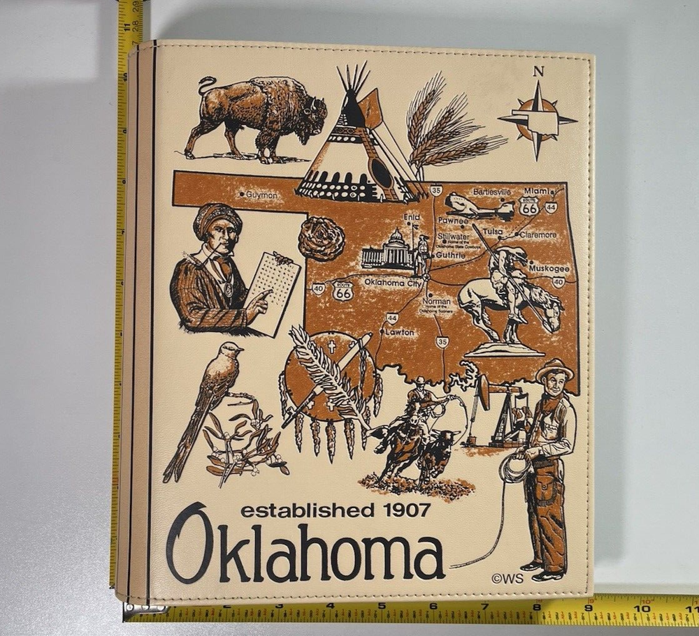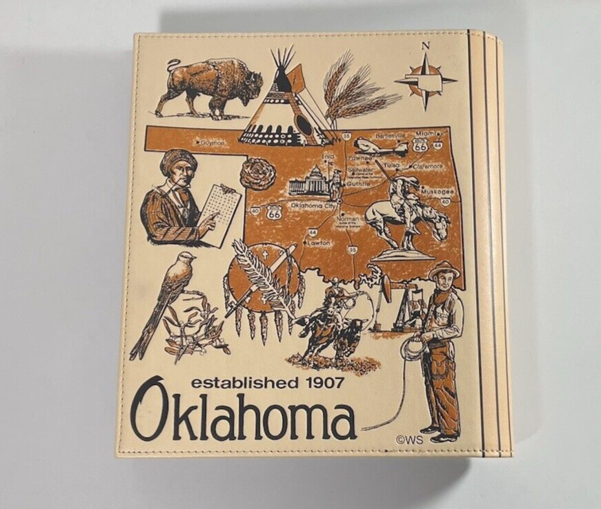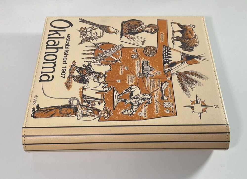 This is a brand new Photo Album for storing and displaying 4" x 6" pictures. The album has 50 pages. Each page has 4 slots (2 front & 2 back) to slide the photos into. The pages don't use an adhesive backing, so the photos may be easily inserted and removed without damage. There's also a slot on the pages where a label may be inserted, for including visible notes on each shot (see photos 7 & 8). Blank labels are included with the album. The cover of the album has a State of Oklahoma theme, with a map and images associated with the state's culture, people, places and wildlife. When closed, the album measures approximately 9" x 10" and is about 1½" thick (without photos). This album would be perfect for displaying pictures from an Oklahoma Business Trip, Vacation, Wedding or ???. Please select your preferred shipping method at checkout.