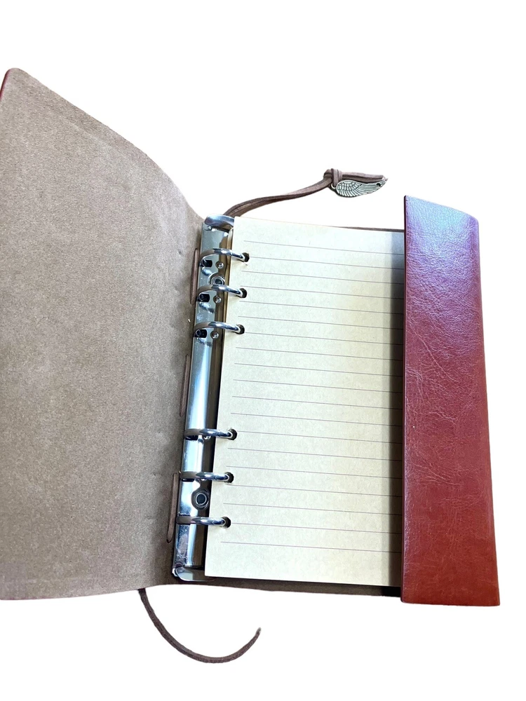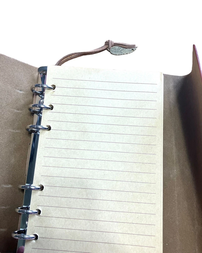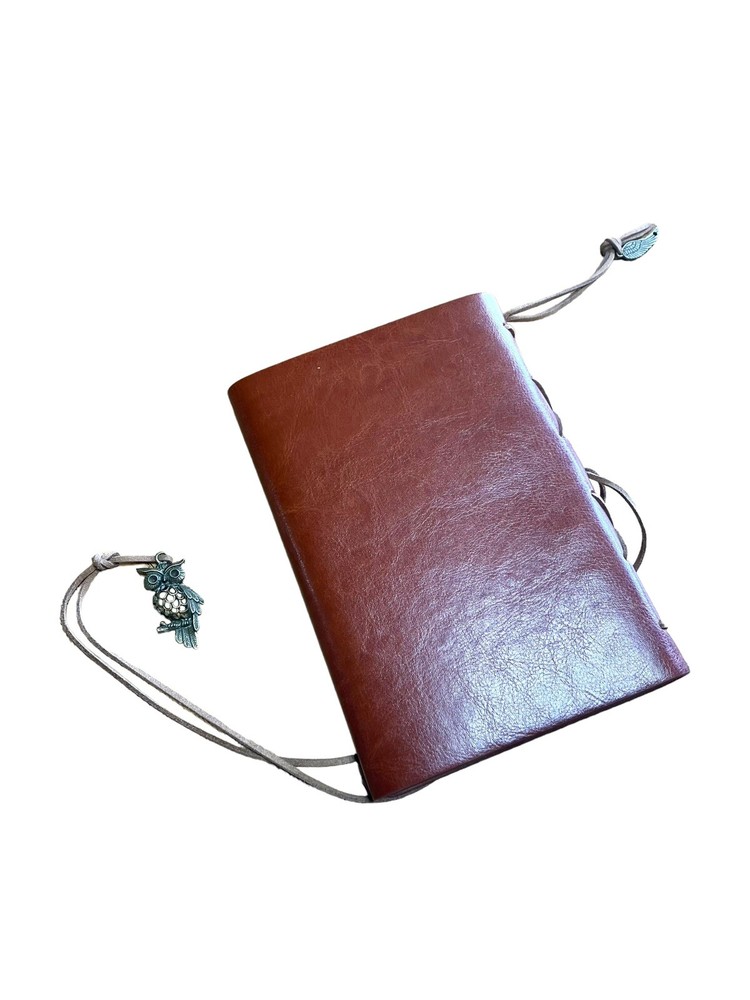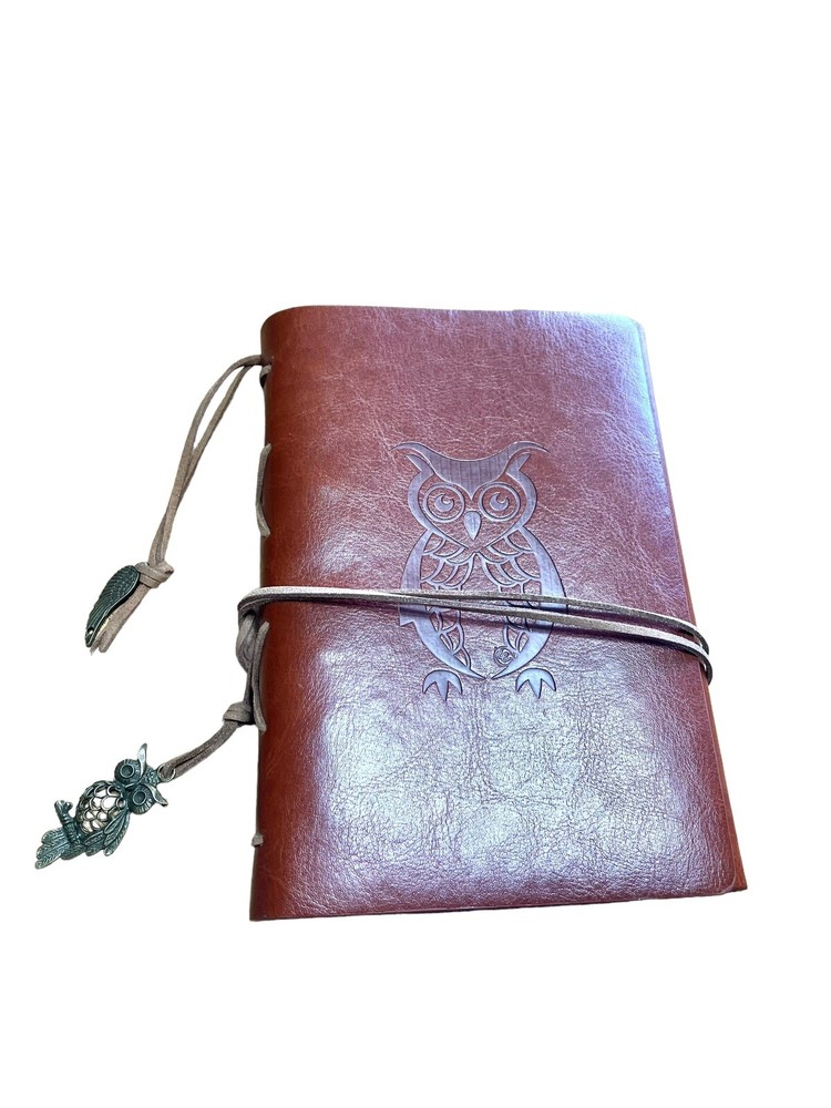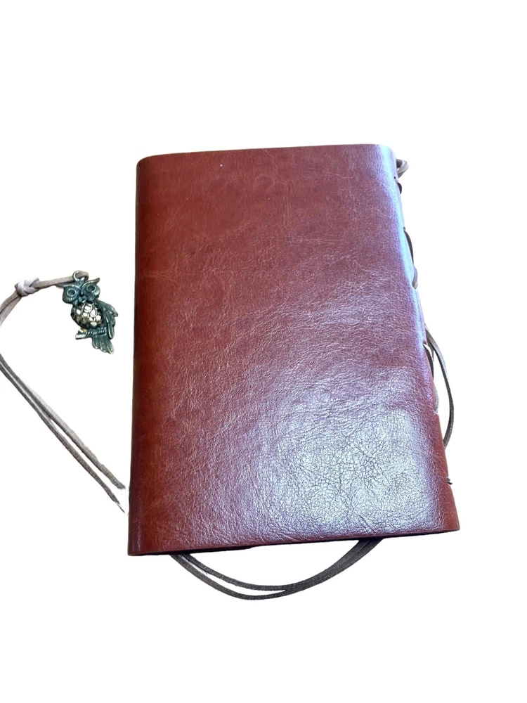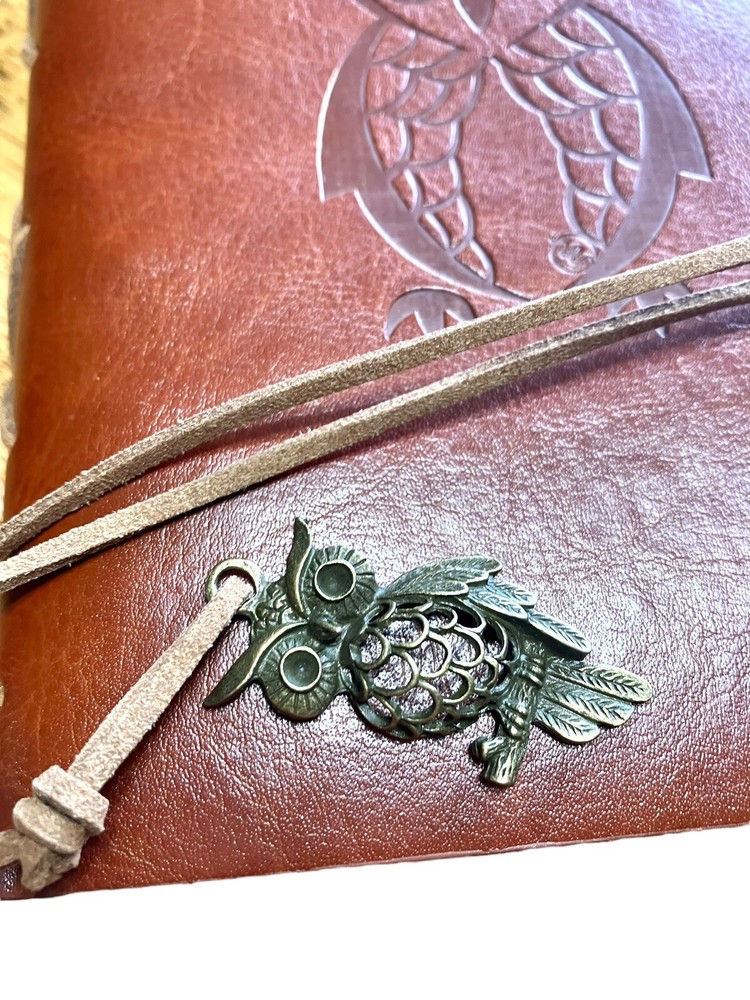 Owl journal Brown synthetic Leather Bound, NEW Drawing writing Book Refillable Bookmark. Filled with blank lined journal pages, an attached owl bookmark, and a wing strap binder. Beautiful dark brown with an engraved Owl. This is a 3 ring binder, so pages can be refilled or changed out. Measures approx. 7.25” tall x 5”wide x 1” thick and pages measure 6.75” x 4.25”. Condition New no box. Please see photos as part of the description. Thank you for looking!