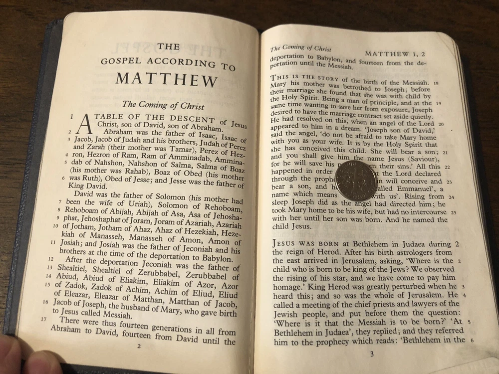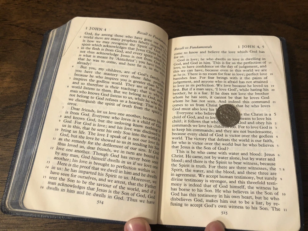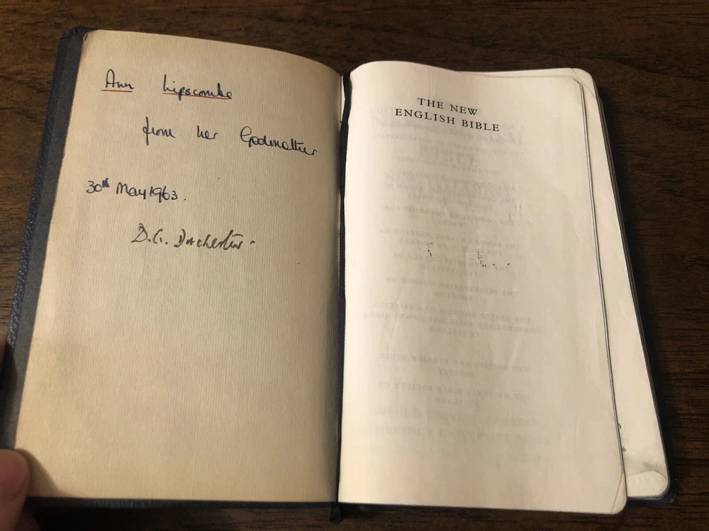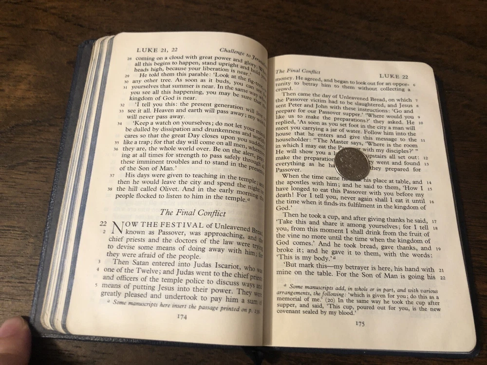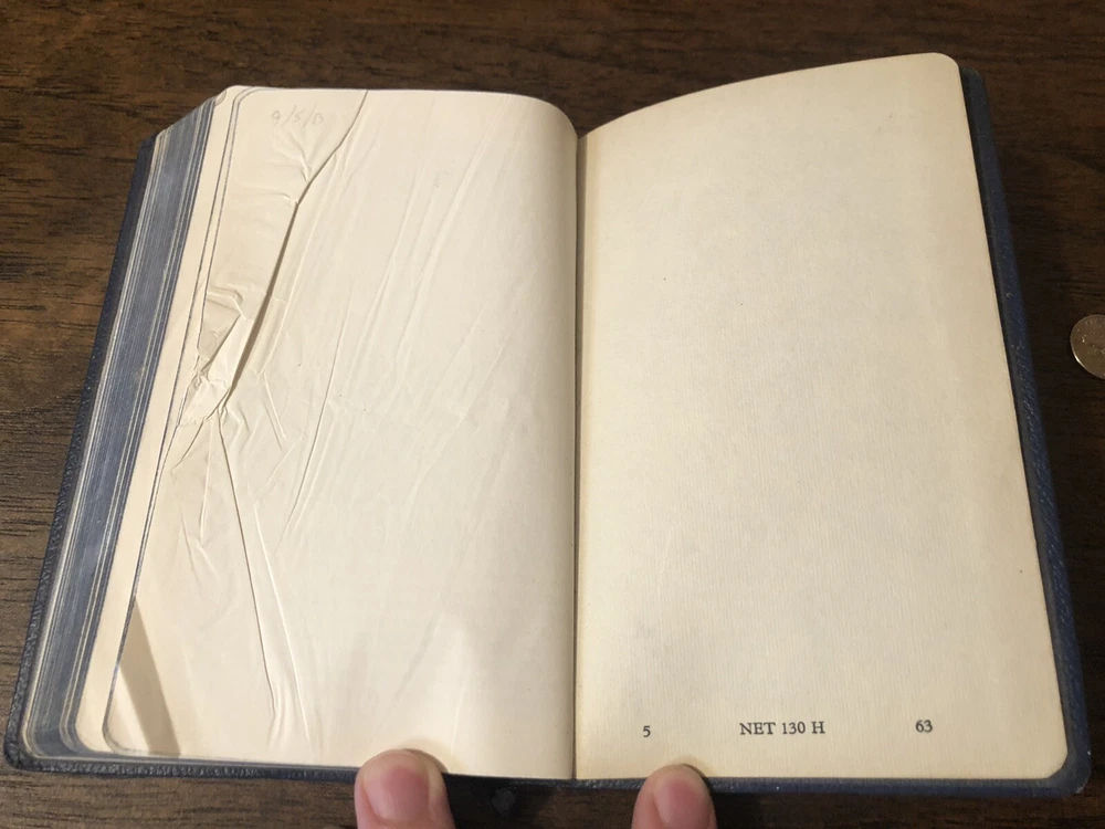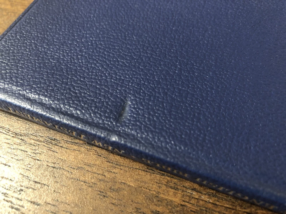 Oxford Cambridge NEB NT New English Bible Navy Leather Art Gilt 130H These are exceedingly rare, but over years and diligent searching I’ve acquired several of these and decided to part with them from my personal collection. This is a navy 130H NEB with the New Testament only. It features perhaps the most pleasant reading format available for the Bible, single column with a rather perfect character line count, with the verse numbers outside the text. The gilding has some mild abrasions, but the way the art-gilt reflects light, you’d think it was merely faded. The binding imitation leather or "rexine," but it is much more flexible than most of the others I’ve handled. That being said, it doesn’t really want to bend and it would need some gentle usage before it softened up. I found no writing in the text, though the front blank page has an inscription. I found a crumpled page in the very back and the binding has an indentation on it. Black letter Reinforced sewn text block 6 x 4 x .5 inches Dime used for comparison Note: I do not accept returns unless the item was not as I described because of a mistake I made. If the item is smaller than you thought it would be (because you didn’t read the description with dimensions), that’s on you. I do not cancel orders for any reason, even if you accidentally ordered it. It takes about 3 steps to purchase an item, so if you paid for it, it’s yours. I make these annoying rules because so many customers have recently treated the purchase of items flippantly and I have to draw a line somewhere. Well, here it is. I always list any writing, stains, tears, or imperfection of any kind. And I always list the condition conservatively, so you should expect the item to be in better condition than listed. Unlike the vast majority of sellers out there, I refuse to hide imperfections through cleverly taken pictures or obscure descriptions. I try to include as many pictures as necessary to highlight the imperfections rather than the beauty of the items, which is part of why I have an elevated Seller Status and perfect feedback in which many consistently report back “just as described” or “better than described.” If I miss something by accident, please contact me so I can make it right. My flawless feedback should speak for itself, but you won’t be disappointed! Thank you for your business and God bless!