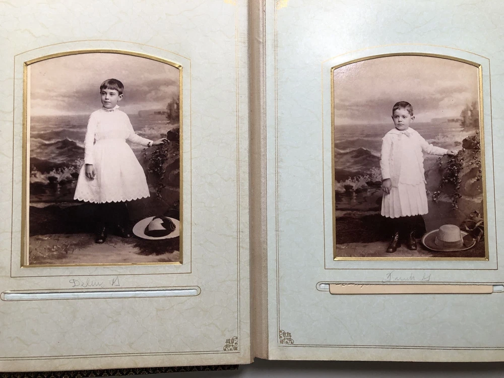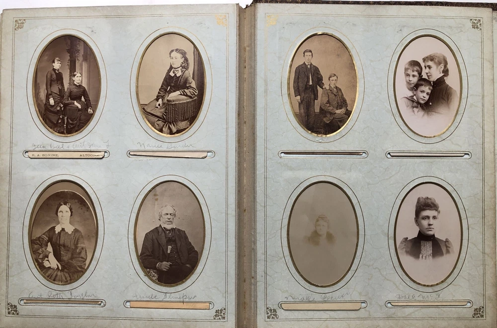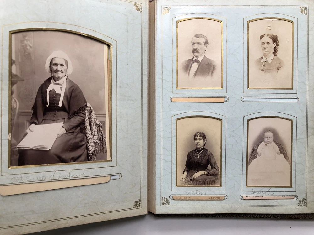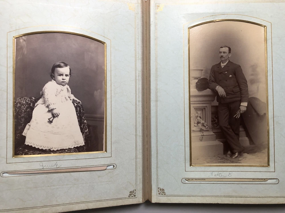 1880s photo album Altoona, Hollidaysburg families Author: (PA - Blair County) Title: 1880s photo album Altoona, Hollidaysburg families Description: 11 inches tall, handsome leather aesthetic movement binding, 38 photos inside, 22 cabinet sized photos (5.5 x 4 inches) and 16 CDV sized photos (3.5 x 2 inches), mainly of families in Altoona and Hollidaysburg, plus a couple who had their photos taken in a Denver studio, and one from San Francisco. Many are identified in sloppy pencil, hard to read: Gardener family, Crawford, a Mollie Cram, Cardem (?), an Aunt Sallie Culpin (?). Torn off section of envelope inserted with the note: "Gerald Patton / Family album of doctor _____who lived and practiced at Altoona." A few pages have some wear to their mounts but generally very good. Seller ID: H9650 Subject: Western Pennsylvania RAREBOOKSTORE RareBookStore is a long-established eBay seller specializing in used and rare books in all fields-plus prints, ephemera, maps, music, photography, and the occasional painting. We sell good books at good prices and want you to be satisfied with your purchase. Be sure to add us to your "favorite" sellers and check back to see new items listed daily! We pride ourselves on our high standards, high eBay ratings, and helpful staff, so please contact us directly if you encounter any issues. Standard shipping is via USPS Media Mail. Expedited options are available at checkout. Payment is expected within 2 business days unless otherwise arranged. Our warehouse is staffed Monday-Friday and we respond to inquiries as quickly as possible. We hope you enjoy browsing our selection of great books. Happy reading! This listing was created by Bibliopolis.