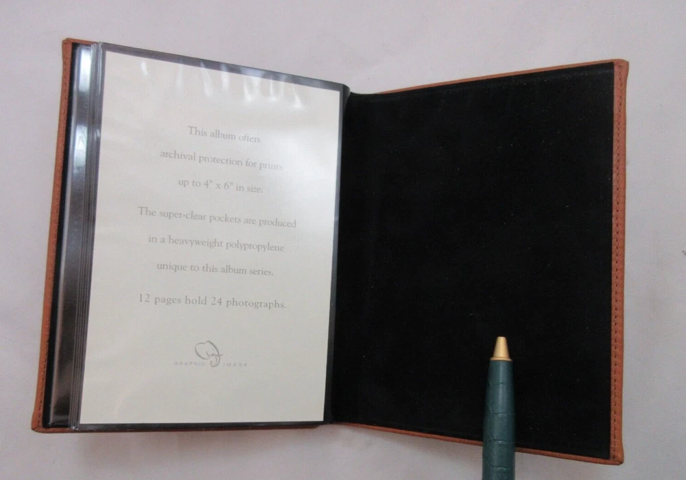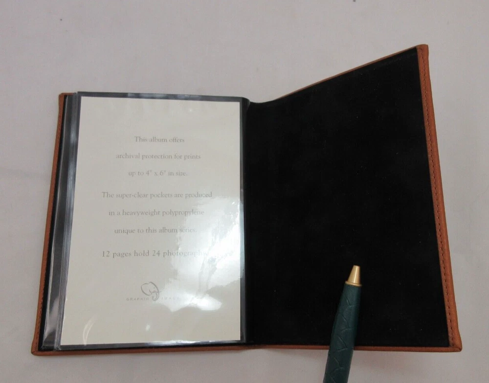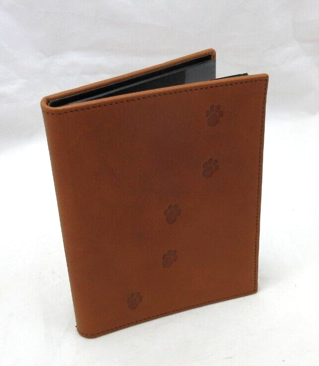 New Graphic Image small clear pocket album. A great gift for animal lovers. Featuring archival quality polypropylene pages that are heavy weight and super clear. Pages won't wrinkle or harm photos. Album measures 5" x 6-1/2" Smooth fine leather with topstitching and paw prints across the cover. 12 pages hold 24 photographs. If you are buying multiple items from us we will adjust shipping costs and ship in one box.