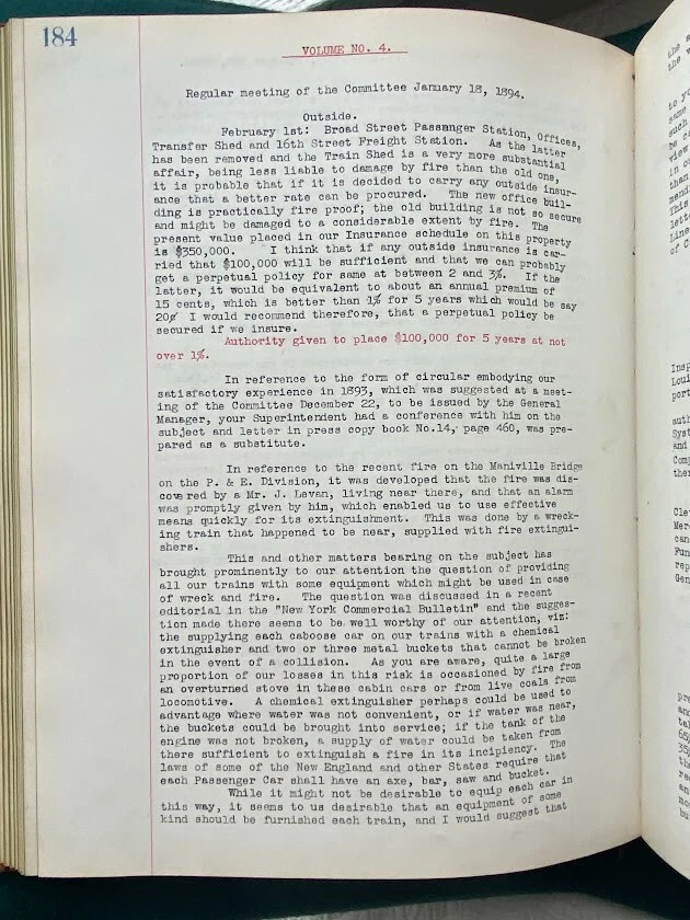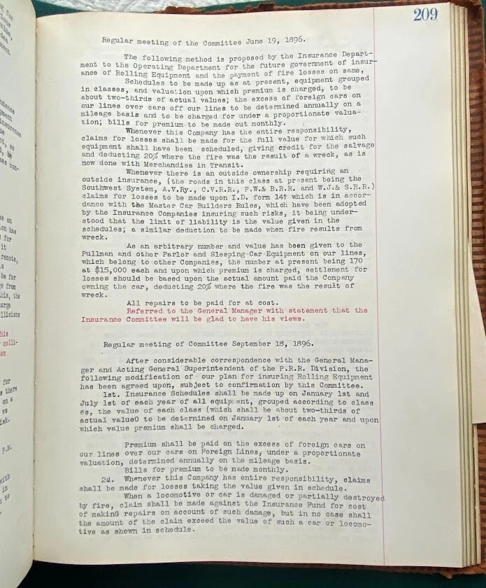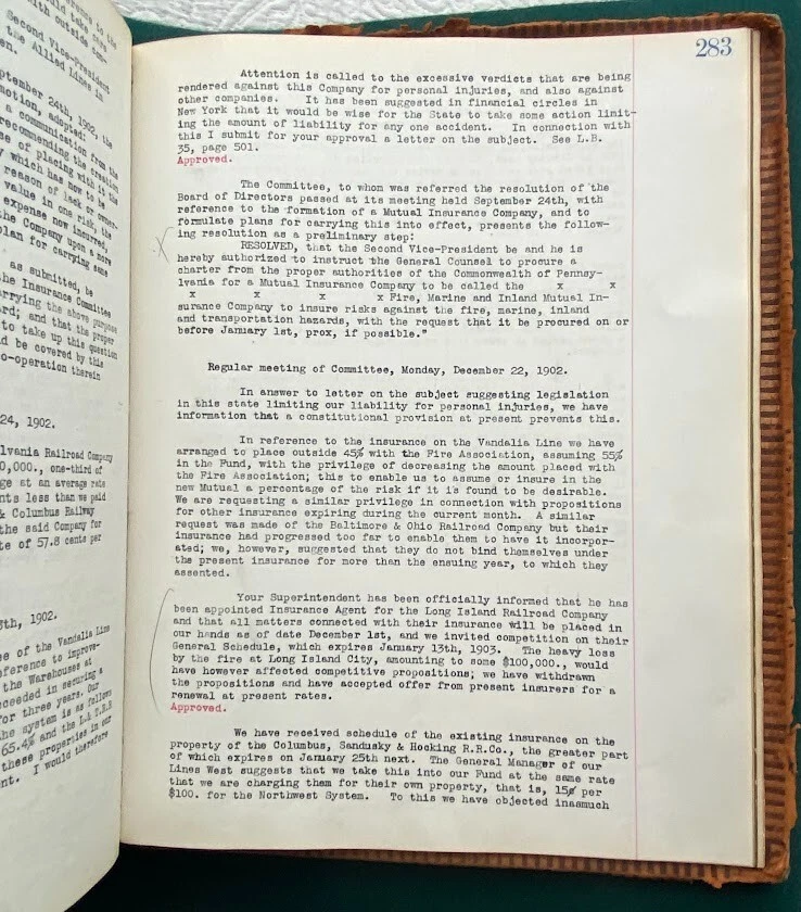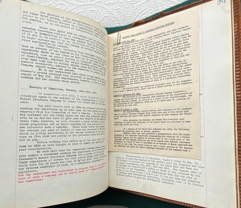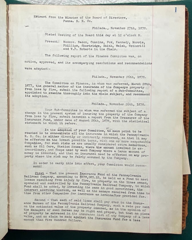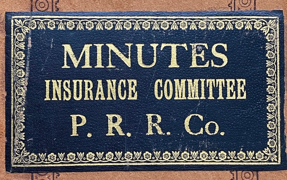 Minutes Insurance Committee P.[ennsylvania] R.[ail] R.[oad] Co.[mpany]. A single volume containing 284 pages of typescript extracts from the minutes of the meetings of the PRR Insurance Committee, dated 27 November 1878 – 22 December 1902. [Probably compiled circa 1910-30]. Large quarto (12 ½ x 10 inches). 248 typescript pages, with occasional manuscript corrections or additions. Original reversed calf, labels to upper cover and spine, marbled paper endpapers (extremities damaged). A fascinating and wide-ranging series of extracts. An almost random sampling: Nov. 26, 1878 PRR Subcommittee on Insurance reports that PRR should also self-insure non-hazardous properties and goods in transit. (MB) Nov. 27, 1878 PRR Board approves creation of Insurance Bureau, reporting to Board, effective Jan. 1, 1879 Dec. 10, 1878 PRR Subcommittee on Insurance makes second report on creating a Standing Committee on Insurance and an Insurance Bureau. (MB) Jan. 22, 1879 PRR Board authorizes creation of a Standing Committee on Insurance and an Insurance Dept. (not Bureau as earlier); orders trustees of insurance fund established in Dec. 1876 to turn over funds to new Insurance Committee. (MB) Feb. 12, 1879 PRR Board grants Altoona Library Association $500 plus a room in the shops; appoints W.W. Curtin Clerk of the Insurance Dept. Feb. 26, 1879 Thomas T. Firth relieved as head of Insurance Fund; made registrar of Consolidated Mortgage bonds. (Watkins) Apr. 1, 1881 Thomas T. Firth resigns as Treasurer of the Insurance Fund and Secretary & Treasurer of the sinking fund of the Consolidated Mortgage because of health. (MB, RRGaz) Oct. 1, 1882 Hugh B. Ely (1838-1907) named Secretary of the Insurance Dept. as new department head, replacing W.W. Curtin, Clerk of the Insurance Dept., resigned. (MB) Dec 22, 1882 report of the Committee who toured and inspected the Piers and Buildings in New York Harbor Apr 9, 1886 report of a disastrous fire, Camden, N.J. Sep. 22, 1886 PRR Insurance Dept. enlarged to cover marine risks. (MB) Sep 1, 1887 complimentary report submitted by Hugh B. Ely Sept 4, 1891 report that Hugh B. Ely named Insurance Agent of the Northern Central Railway. (AR) Apr 7, 1893 report of some of the changes during re-organization, including Hugh B. Ely named to new position of Superintendent of Insurance Dept. (RRGaz). Nov 17, 1893 report of claim for cotton bales ‘damagd by fire’ – owner had outside insurance, Ely does not want to pay. Apr 7, 1899 resolution reported: PRR extends Insurance Fund to cover personal injuries except those to employees. Jan. 8, 1900 Value of PRR’s Insurance Fund is $4,345, 511.85 million. (MB)