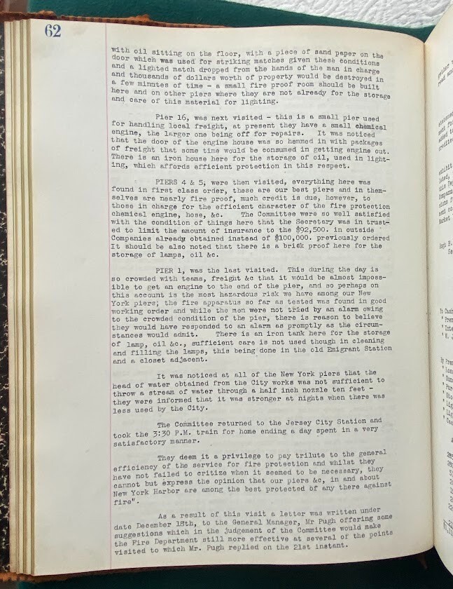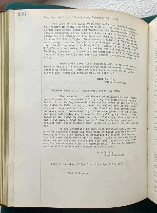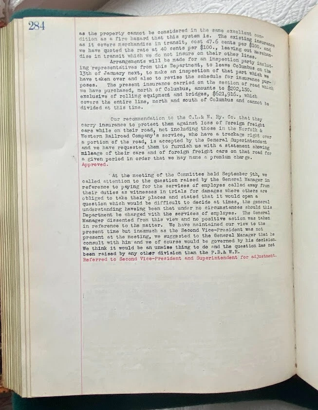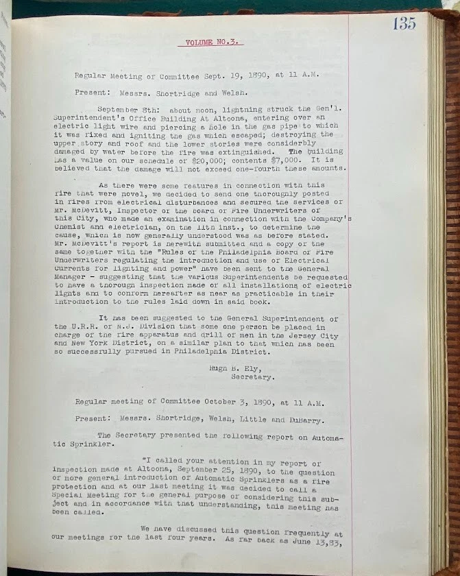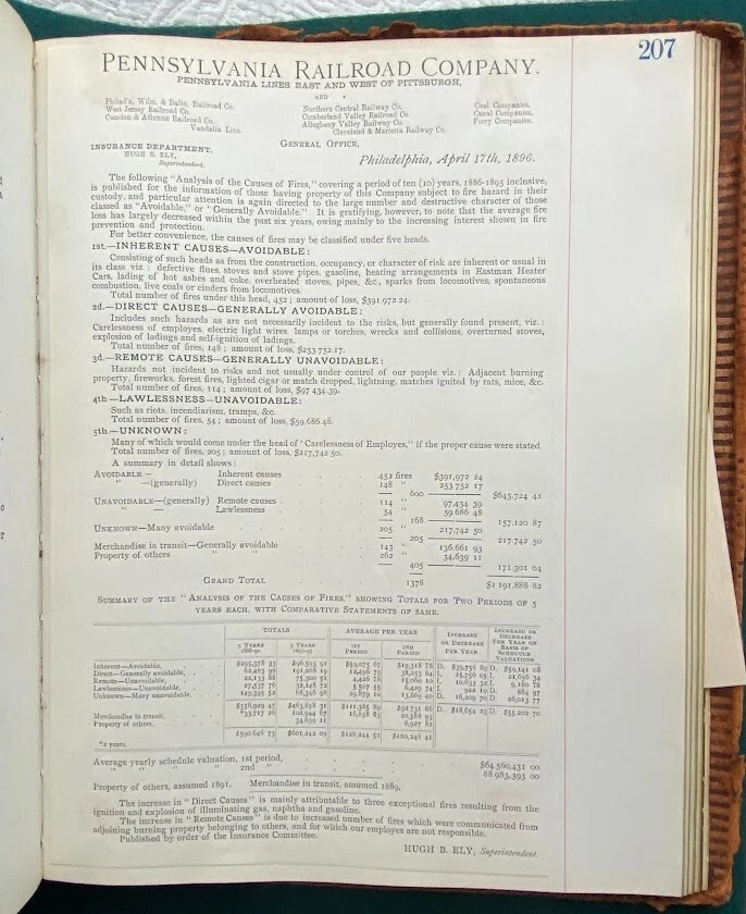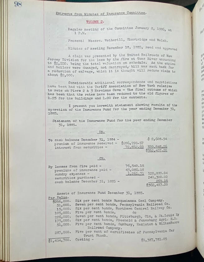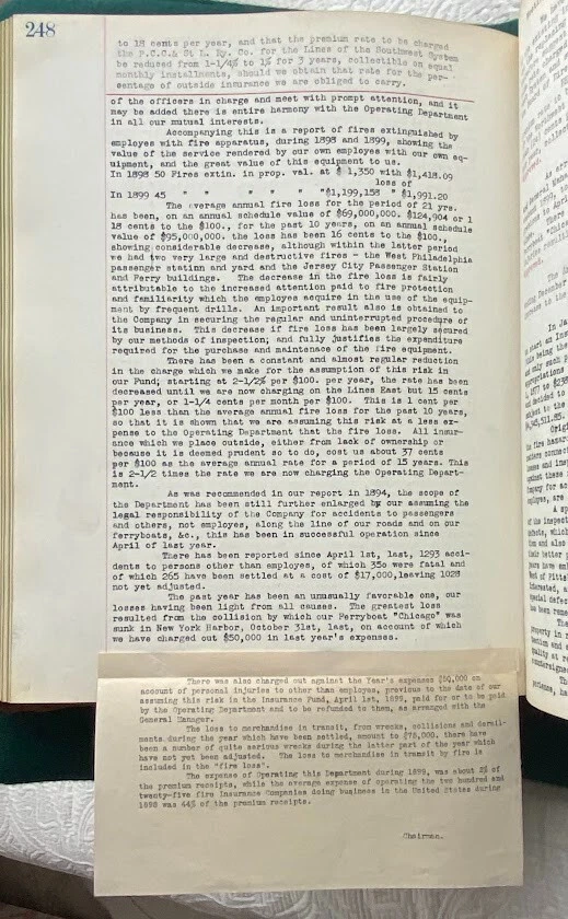 Minutes Insurance Committee P.[ennsylvania] R.[ail] R.[oad] Co.[mpany]. A single volume containing 284 pages of typescript extracts from the minutes of the meetings of the PRR Insurance Committee, dated 27 November 1878 – 22 December 1902. [Probably compiled circa 1910-30]. Large quarto (12 ½ x 10 inches). 248 typescript pages, with occasional manuscript corrections or additions. Original reversed calf, labels to upper cover and spine, marbled paper endpapers (extremities damaged). A fascinating and wide-ranging series of extracts. An almost random sampling: Nov. 26, 1878 PRR Subcommittee on Insurance reports that PRR should also self-insure non-hazardous properties and goods in transit. (MB) Nov. 27, 1878 PRR Board approves creation of Insurance Bureau, reporting to Board, effective Jan. 1, 1879 Dec. 10, 1878 PRR Subcommittee on Insurance makes second report on creating a Standing Committee on Insurance and an Insurance Bureau. (MB) Jan. 22, 1879 PRR Board authorizes creation of a Standing Committee on Insurance and an Insurance Dept. (not Bureau as earlier); orders trustees of insurance fund established in Dec. 1876 to turn over funds to new Insurance Committee. (MB) Feb. 12, 1879 PRR Board grants Altoona Library Association $500 plus a room in the shops; appoints W.W. Curtin Clerk of the Insurance Dept. Feb. 26, 1879 Thomas T. Firth relieved as head of Insurance Fund; made registrar of Consolidated Mortgage bonds. (Watkins) Apr. 1, 1881 Thomas T. Firth resigns as Treasurer of the Insurance Fund and Secretary & Treasurer of the sinking fund of the Consolidated Mortgage because of health. (MB, RRGaz) Oct. 1, 1882 Hugh B. Ely (1838-1907) named Secretary of the Insurance Dept. as new department head, replacing W.W. Curtin, Clerk of the Insurance Dept., resigned. (MB) Dec 22, 1882 report of the Committee who toured and inspected the Piers and Buildings in New York Harbor Apr 9, 1886 report of a disastrous fire, Camden, N.J. Sep. 22, 1886 PRR Insurance Dept. enlarged to cover marine risks. (MB) Sep 1, 1887 complimentary report submitted by Hugh B. Ely Sept 4, 1891 report that Hugh B. Ely named Insurance Agent of the Northern Central Railway. (AR) Apr 7, 1893 report of some of the changes during re-organization, including Hugh B. Ely named to new position of Superintendent of Insurance Dept. (RRGaz). Nov 17, 1893 report of claim for cotton bales ‘damagd by fire’ – owner had outside insurance, Ely does not want to pay. Apr 7, 1899 resolution reported: PRR extends Insurance Fund to cover personal injuries except those to employees. Jan. 8, 1900 Value of PRR’s Insurance Fund is $4,345, 511.85 million. (MB)