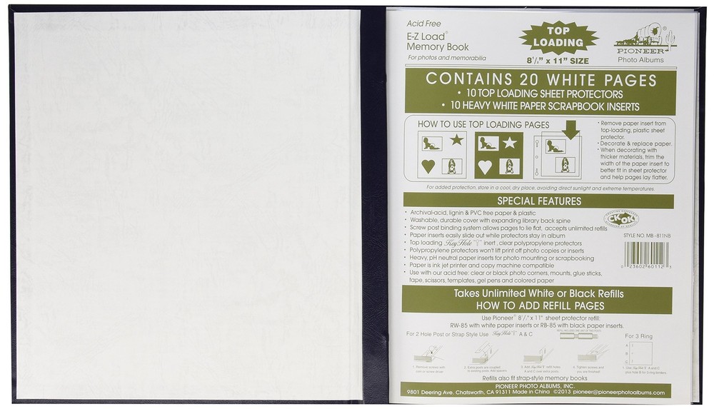 These 11x8-1/2in albums offer a sleek design quality and a timeless look for any scrapbook project and the vinyl leather look cover is easy to wipe clean. Albums include ten acid and lignin free and archival top-loading page protectors with white cardstock inserts. Albums measure 11-3/8x9-7/8x1-1/4in and are available in a variety of colors. Imported. Features a smooth padded printed cover Album includes 10 top-loading page protectors Acid free and archival safe Package dimensions : 0.85 inches (H) x 11.45 inches (L) x 9.73 inches (W)