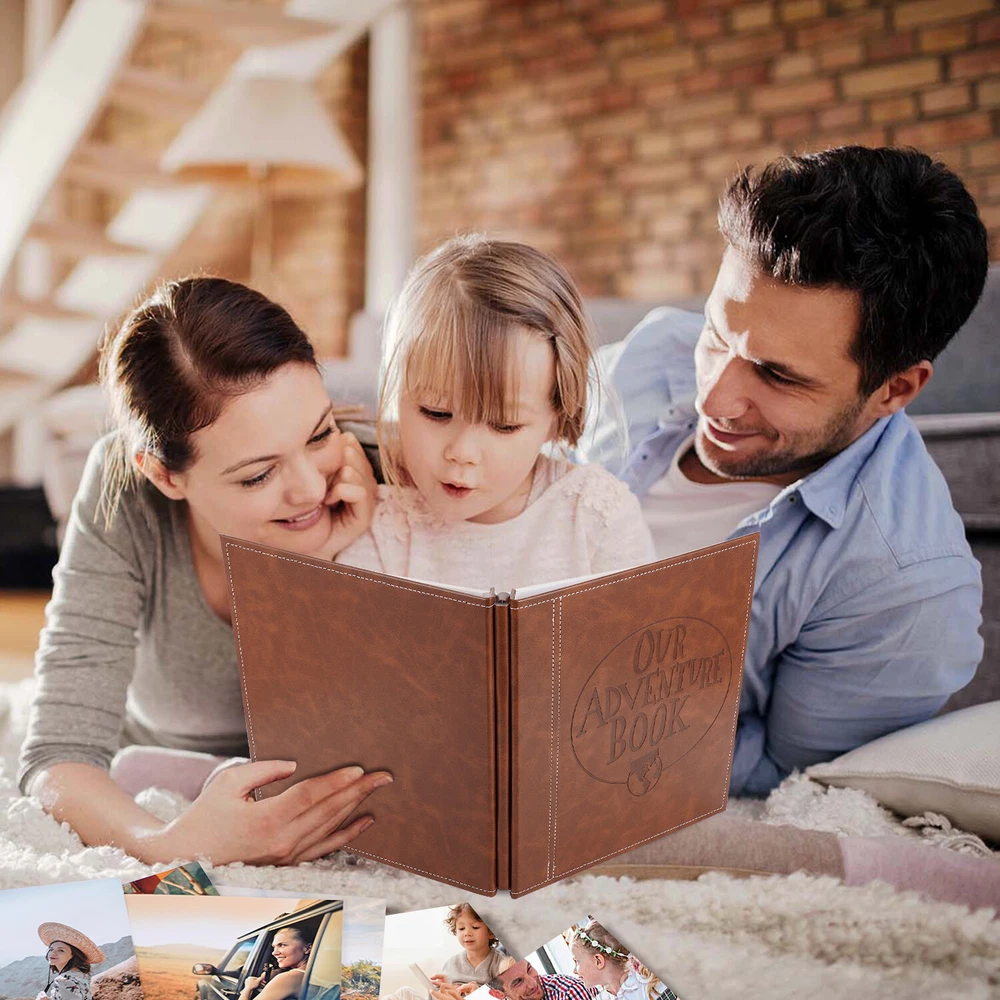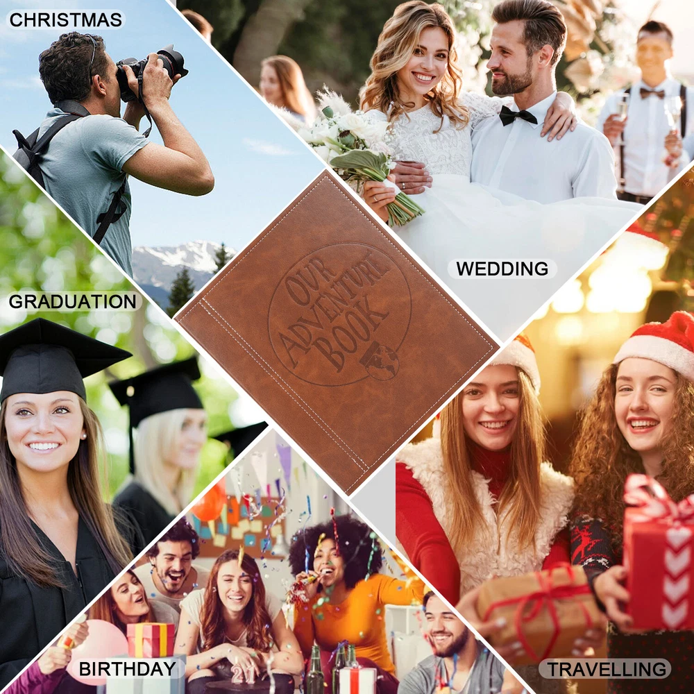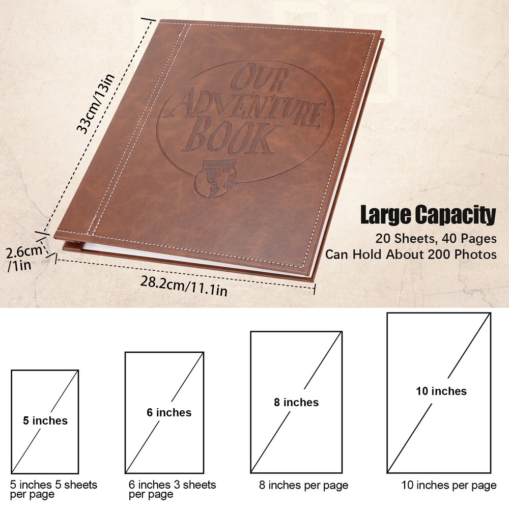 Product description: Our Adventure Book It is an our adventure book scrapbook album, which is made with bigger size than ordinary ones, so you will have more space to place and record your memories. All pages are blank, so you can make it as your unique scrapbook with your sweet photos, travel tickets, and write your notes, it is a meaningful photo album to storage your special memories. Pages: 20 sheets/40 pages Style: screw binding Material: The cover is leather, the inner page is PP film + white cardboard. If you are thinking of giving someone a gift for birthday, wedding event, or to your significant other, this one can be a great option for you to choose, it can be used for many occasions as wedding shower, baby shower, anniversary album, Valentine's day, Christmas, Thanksgiving Day, etc. Product features: 1. High-grade leather cover + 2.5mm thick gray board window + 300g viscose inner pages 20 sheets (40 pages) 2. Cover size: 330×280mm 3. Packing method: single copy into OPP bag Package including: 1 * Photo Album Scrapbook