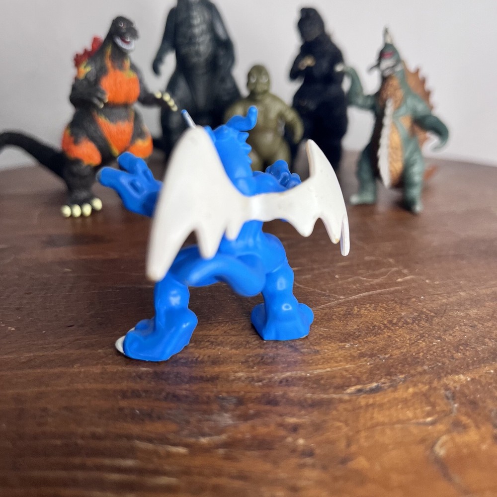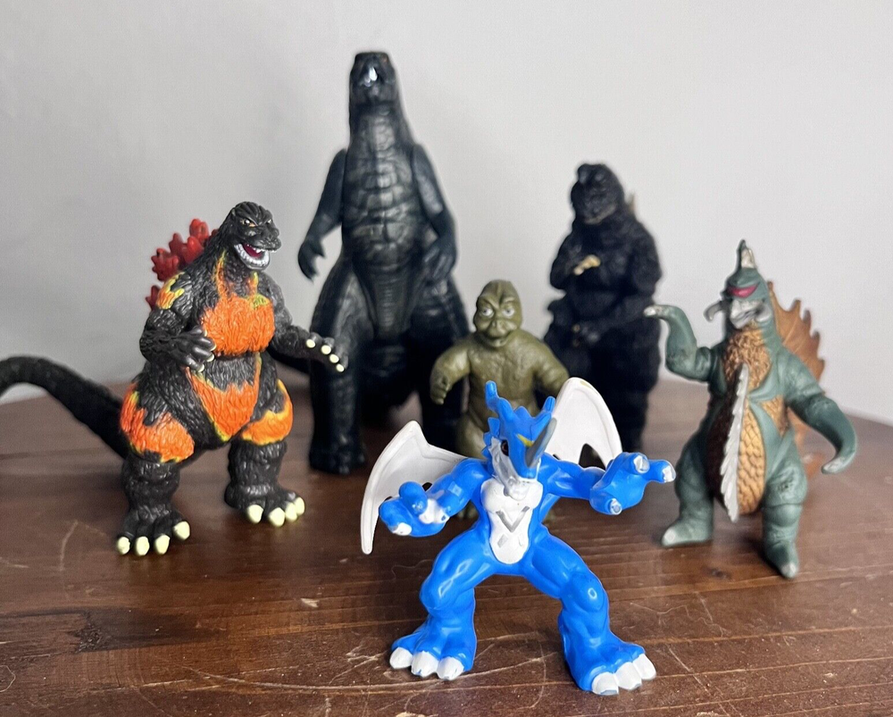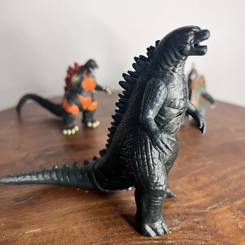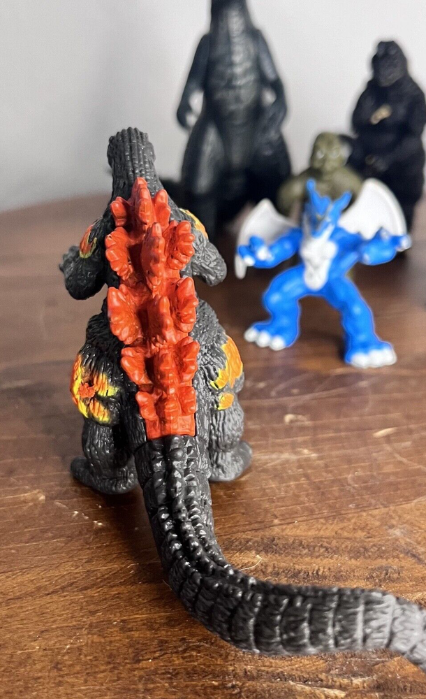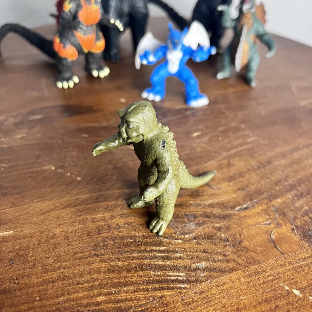 Mini Godzilla action figures - check out pics for description 'cuz this is what I'm knowing: 'Godzilla action figures'. Please note mark on Baby Godzilla's shoulder - the battery powered one (on side) has not been tested. Bic for sizing~ Thanks for looking!