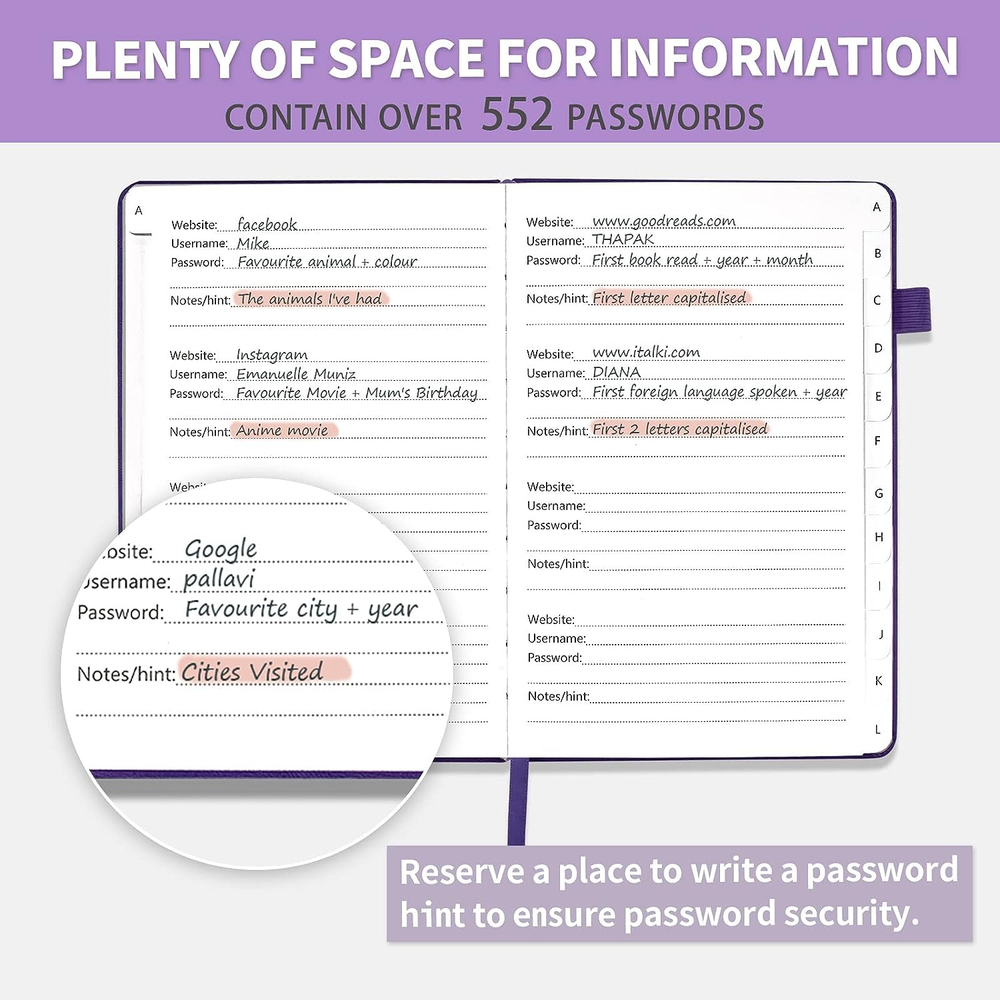 Store New Arrivals Add to Favorite View Feedback Contact Password Book with Alphabetical Tabs, Hardcover Password Keeper, Password Notebook Organizer for Computer and Internet Address Website Login, Gifts for Home and Office, 5.3''X 7.7''- Purple Description Item model number Password Book AG3 Color Purple Cover Material Leather Material Type Paper Manufacturer Part Number Password Book AG3 Package Dimensions 7.64 x 5.39 x 0.75 inches Item Weight 10 ounces Ruling Ruled Manufacturer Blugool Brand Blugool Size Medium (5.3 x 7.7 inch) No more Password Aggravation:This book will simplify your electronic life and free you from the constant frustration of trying to remember and reset your passwords. You can record longer and more complex passwords and never forget them again. Alphabetical Tabs (A-Z): We upgraded to one letter one tab(A-Z),others are two letters share 5 pages(AB-YZ). Our password journal has 6 pages per alphabetical tab. Makes your password easy to find and keeps organized. Plenty of Space for Information: Each tab has 6 pages with 4 entries per page, it can contain over 552 passwords. There're additional pages, PC info, email settings and 6 pages of notes. We have reserved a place to write a password hint instead of the password itself to ensure password security. 100GSM No-Bleed Paper: This password notebooks are made of very thick 100gsm paper, no bleed through. Size 5.3in x 7.7in, suitable size for carry-on. 180°lay flat so it’s easy to write in. Excellent Gift to All Ages:Easy to use, keeps passwords organized. With an elastic band, pen holder, bookmarker and inner pocket. A great present for friends and family. Product Description ABOUT US Our store reflects our family's ethos: dedication to quality, passion for unique items, and a customer-centric approach. Our mission is simple—to provide you with excellent products and an enjoyable shopping experience. Welcome to our family! We provide fast shipment and excellent customer service. We sell good quality and low priced items. If you have any questions before or after purchasing, please do not hesitate to reach out to us through eBay’s messaging system. Business Hours 8:30AM to 5:30PM PST Monday to Friday SHIPPING We are always working hard to ensure your package arrives as soon as possible. Please understand that some factors like weather, high postal traffic, and the performance of shipping companies are outside of our control. Shipment processing time orders are processed within 3 business days. Orders are not shipped or delivered on weekends or holidays. Shipping charges for your order will be calculated and displayed at checkout. RETURNS We currently do accept returns for opened or damaged items. For all other return inquiries, please contact us to issue an RMA number. We are committed to resolving any issues and providing a satisfactory shopping experience. CUSTOMER SATISFACTION We try our very best to make sure every customer is completely satisfied. If there's a problem, message us! We're happy to help. WE ACCEPT
