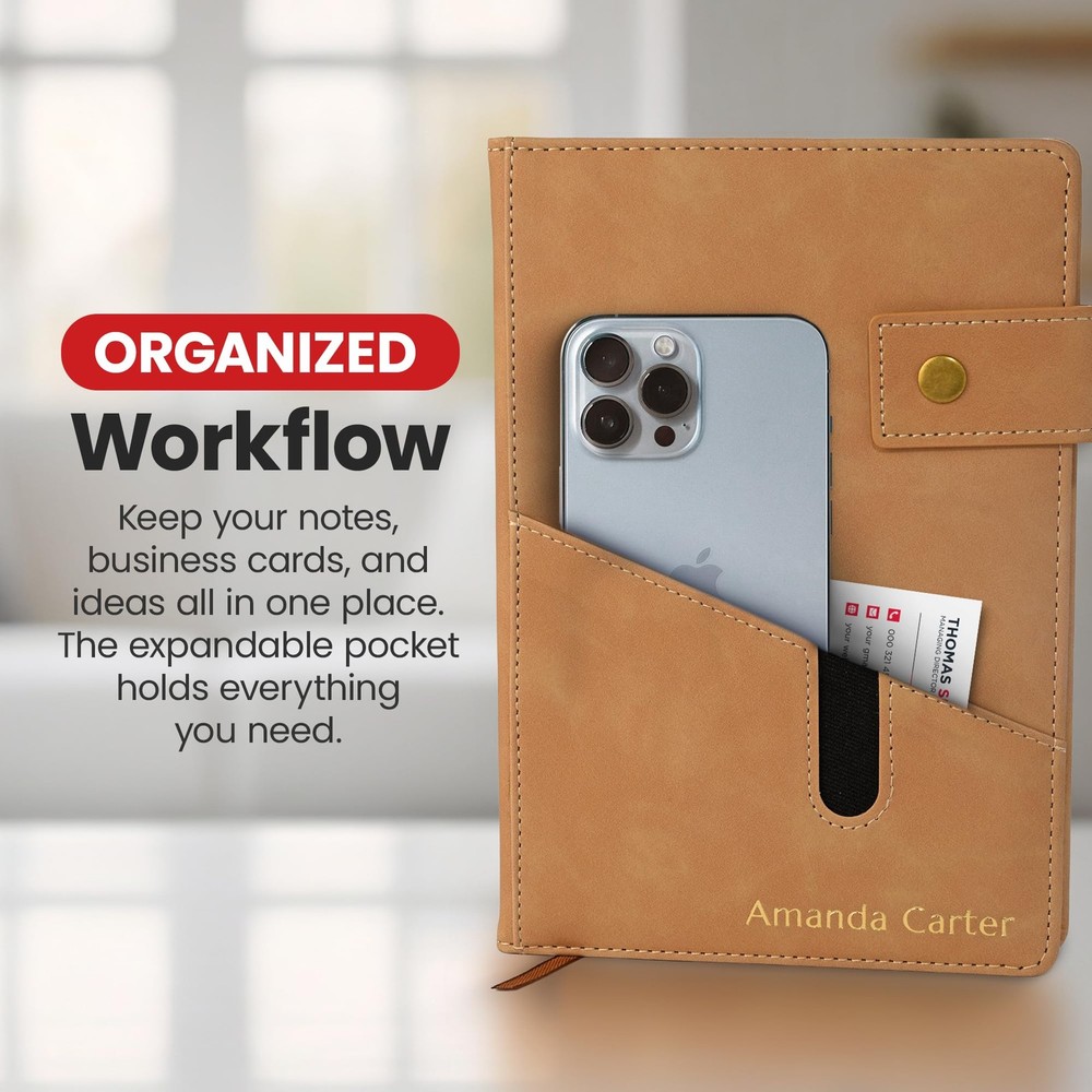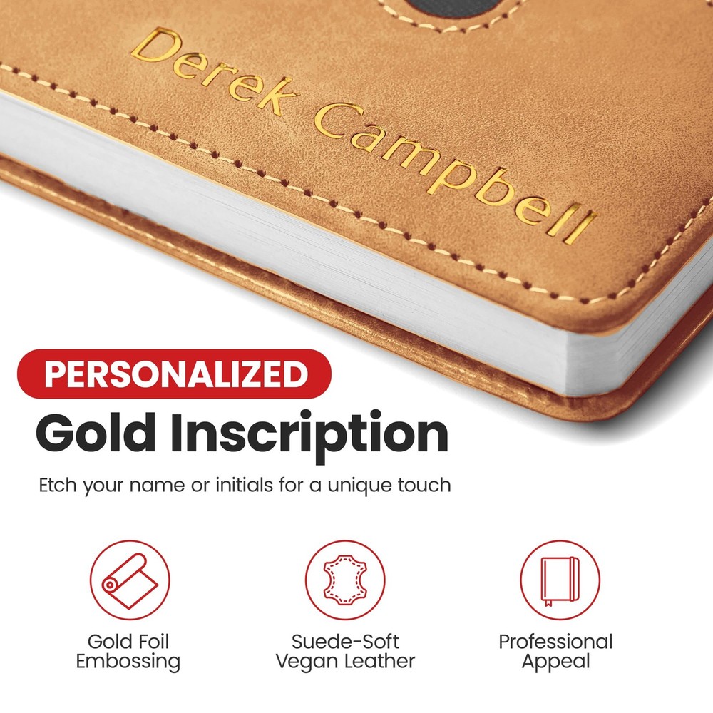 Introducing our Personalized Leather Notebook, a stunning blend of sophistication, functionality, and customization. This premium leather journal allows you to make a bold statement with your name elegantly embossed on the hardback cover in gold metallic foil. With a simple click, you have the power to tailor your work notebook, crafting a truly distinctive and personalized journal that reflects your individuality. Designed for convenience - this leather-bound journal features a thoughtfully crafted pocket and a secure lock design. The pocket design is perfect for keeping loose notes, business cards, or even essentials like your phone close at hand. The lock ensures that your precious thoughts and notes stay protected. Our A5 notebook showcases a luxurious suede-like finish. The smooth and supple vegan leather cover invites your fingertips to explore its soft texture, adding a touch of indulgence to your writing experience. It's a travel journal that appeals to both men and women, exuding sophistication and refinement on every page. Embrace endless possibilities with this versatile lined notebook. Whether capturing your thoughts, sketching your ideas, note-taking, or maintaining a personal journal, this meeting notebook adapts effortlessly to your creative needs. It's the perfect companion for writers, artists, executives, and professionals who seek to express themselves in style. Are you looking for a remarkable gift idea? Our writing journal is a perfect choice. Combining practicality with elegance, it's a thoughtful present for birthdays, anniversaries, or any special occasion. Your loved ones will be captivated by the customized touch. Indulge in the allure of our customizable notebooks, where luxury meets personal expression. Unleash your creativity in a hardcover notebook that is uniquely yours. Your Personalized Notebook: Make a statement with gold embossing customization for your name, infusing an air of sophistication into this unique leather-bound journal. Your travelers' notebook becomes a canvas of your preferences, click "Customize Now" to begin. Make a bold statement and add a touch of unparalleled elegance to your notebook today. Convenient Pocket & Lock Design: Stay organized on the go with a handy pocket, perfect for storing loose notes, business cards, or other essentials. It also comes with a lock to keep the travel journal pages secure. Suede-Soft Vegan Leather: Immerse yourself in the luxurious feel of this journal for men and women, featuring a smooth suede finish that offers a tactile and sophisticated feel that elevates your writing experience. Endless Possibilities: Whether for daily journaling, sketching, note-taking, or a diary for writing, this versatile A5 lined notebook adapts to your creative needs, making it a perfect gift for writers, artists, executives, and professionals. Memorable Gift: Impress your loved ones with a personalized gift that combines practicality and style. This custom leather notebook is a thoughtful present for birthdays, anniversaries, or any special occasion. Choose from 8 colors: Blue, Sky Blue, Black, Storm Blue, Brown, Red, Gray, and Tan.