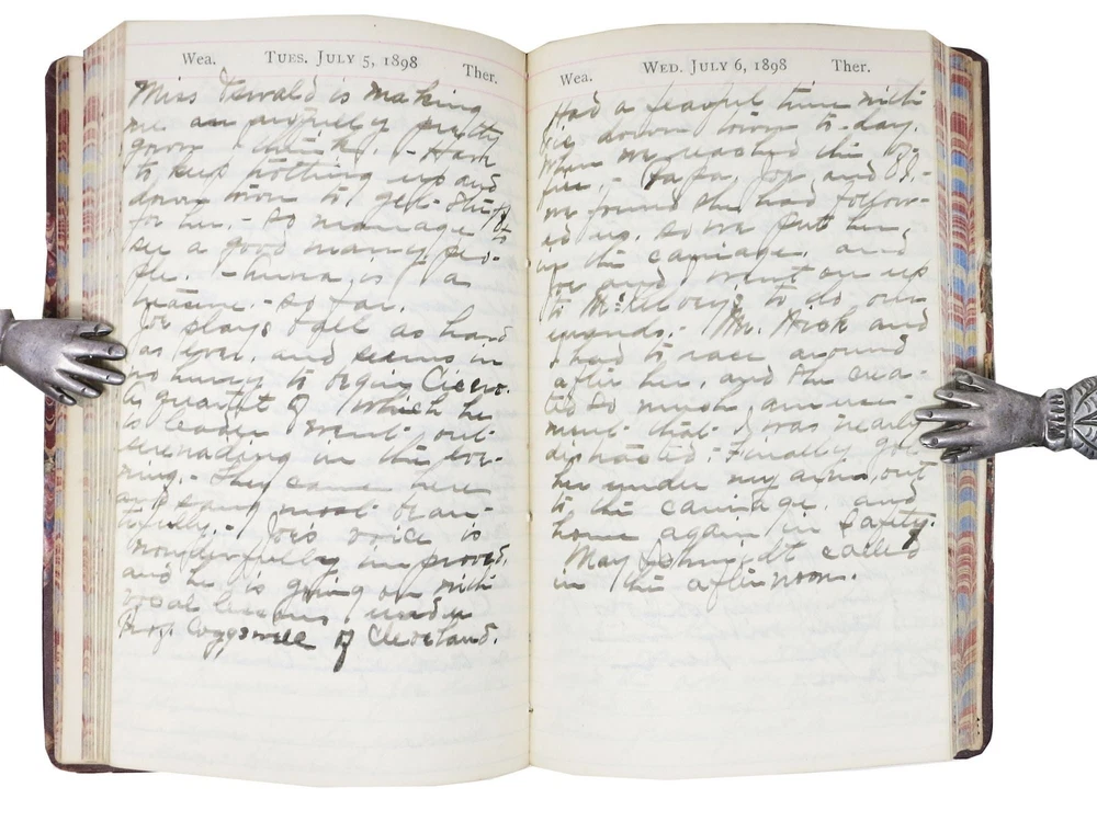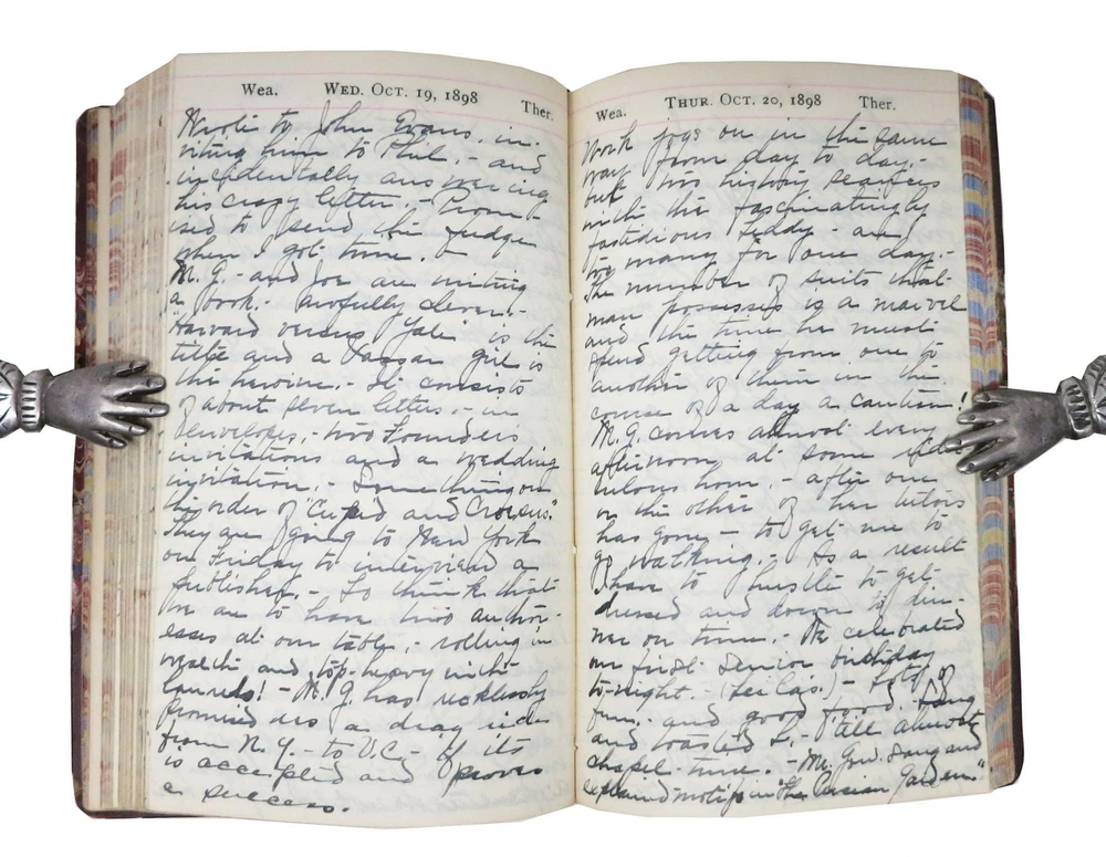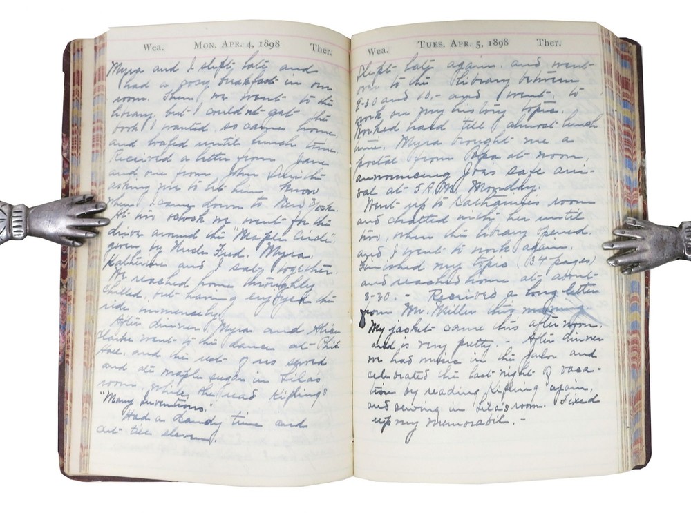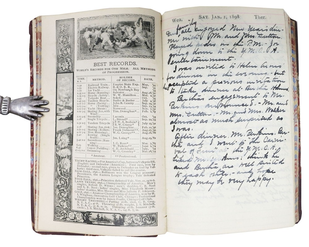 The EXCELSIOR DIARY. 1898. Vassar College Author: Truesdale, Phoebe K[irkpatrick. 1875 - 1960] Title: The EXCELSIOR DIARY. 1898. Vassar College Publication: 1898 Description: Commercial diary, beginning with 16 printed pages, including an almanac calendar for the year, followed by pages of 'factoids', e.g., "States and Territories", "Value of Foreign Coins", etc. The followed by the diary portion [one page per day], memorandum pages, page for addresses [blank] & cash account pages [per month, used by Phoebe in the beginning of the year]. She writes with a small neat, entirely legible script, with most pages [at least] half filled, though often more... ~ 25 lines per page, ~ 5 words per line, 40,000+ words. Printed preliminary pages with decorative border, and photographic image at top. 5-7/8" x 3-1/2". Maroon half-leather with marbled boards & edges. Extremity wear. Truesdale's name, et al, inked to ffep. A Very Good example. Here offered a year long diary from Phoebe Truesdale, who came to Vassar from Youngstouwn Ohio. She begins her entries Jan 1, 1898, concluding with a final entry Dec 31, 1898. Every day is filled with detailed accounts of Vassar, friends, family, gossip, courting, romance, working on plays, attending operas, and trips to New York City. In particular Brooklyn, Staten Island, Columbia Collage, Grants Tomb, Brooklyn Bridge, U.S. Navy Yard onboard the Navy ship " Texas", etc. Of note are some entries regarding the Spanish American War and it's impact on the American public. And while there are many other entries mentioning this conflict, she primarily records the everyday life of a college student. For example: Jan 24,1898 Went to my first exam this week - Economics. It wasn't that bad - and I didn't mind it. Gertrude came over about 4:30pm - feeling pretty tired. We went walking together and got back a little while and begun dinner M.G. came with me to dinner and M.- stayed up in our room and taken during chapel. She was feeling badly and wanted me to go over to Raymond which I did - she told me what has been bothering her so and said she had changed her mind a lot but she begged me not to leave her alone, so I stayed all night. The poor girl has been suffering everything over her first real love affair and is filled with doubts and misunderstandings - I do hope it ill turn out all right. March 29,1898 This morning we went down to the Battery took the ferry to Staten Island in order to see the Harbor. Saw an Austrian gunboat still in - it caused much excitement for a while people believing it to be a Spanish war vessel. After lunch went out to Grants tomb and Columbia Collage. The tomb is a wonderful thing and in a beautiful location. The Columbia buildings are beautiful especially the library but it seems a cramped room the whole thing in my mind does not compare to Princeton. March 30,1898 Joe came back before eight and watered to go to the theatre so we saw " In Gay New York " - at the casino - Rank! Was frightened terribly by a man escorting Joe and following us as we came near Mrs Sloan's - made Joe stay here till I had made sure the man had left. Than I watched him from my window till he whistled to let me know he had reached home safely he reports a fine time at Princeton. Although beginning to feel tired after out long continuous jaunt - we started out this morning determined to cross the Brooklyn Bridge. Watched the school children playing in the park and thought of( Peter Sterling ) than went to the Brooklyn Navy Yard and reviewed the new vessels in come of preparation and the old ones being prepared went onboard the " Texas " and were treated most kindly. If Joe could be an Annapolis man and officer I should be too proud for anything. April 1,1898 Joe and I started out today to buy clothes. He purchased quite an outfit and I had the second fitting on my jacket, went into Grace church, and missed our appointment with the girls at the Fifth Avenue Hotel. Went through Trinity churchyard- down Wall Street and visited the Produce Exchange, which was extremely quiet due to rumor of war. After lunch went down to the Battery and to the aquarium in the old castle garden building. Came up to 23rd Street and did some more shopping than went to see St. Patrick's cathedral and home for a late dinner. Joe received a note from Wilmer Urich to meet him at him at Holland House. They went to See Henry Miller in the " Master" and I stopped at home and packed up. Lost my pocket book containing less than fifty cents. April 21,1898 Went to rehearsal the 7th and I do hope this play is going to be a success! But even if it is not we had lots of fun out of it. At dinner Florence who has been downtown said that war had practically been declared our fleet had sailed and a call for 80,000 volunteers has been issued. It is dreadful to think that inside of the next few weeks we may be in the middle of a fearful war, something I had never expected to see. How thankful I am Papa and Joe will not go. May 3,1898 Received a dear letter from Papa in which he said all are well at home but Mother very tired. Joe and about 60 other fellows drill is on the avenue after seeing "The Logan Rifles" Received a letter from Roslin latest war news is that the Spanish fleet off Manila Island has been destroyed by the American fleet. May 19,1898 My friends have stopped writing about war, partly because I don't ? - their letters and party because in coming home so soon, I presume the family are very good about it. Though Papa thinks it is hardly necessary to write often when we can so soon talk together- so this is not much to read these days since there is a hill in the war excitement due to a lack of fighting - and we are forced to devote our time and attention here to the approaching exams. I don't think I know a single fellow, aside from the West Point men who has gone to the war. Grace keeps em updated about Will Wrights moments and the dear child is moved to pieces when ever she hears that there are pr