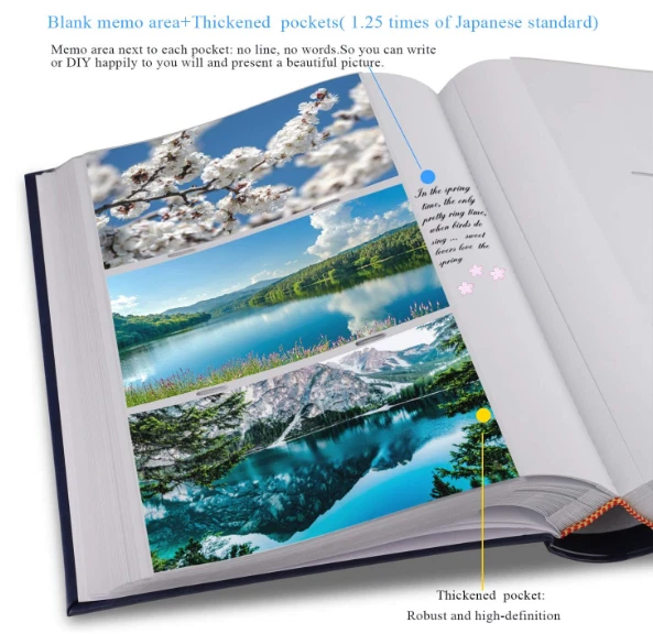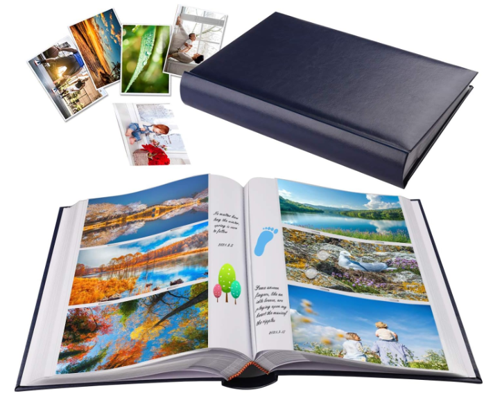 Photo Album 4x6 Photos Hold 402 Pockets with Memo Slip-in Pockets Photo Book, Leather Cover Picture Albums with Writing Space for Wedding Anniversary Family Vacation Mother's Day Christmas Gifts, Blue 【PLENTY OF ROOM】The photo albums measures 12.99 x8.66 x 2.17 inches (L x W x H). Weight: 2.73lb. Album has a total of 67 sheet (134 pages) and holds 3 horizontal pictures per page. It stores up to 402 4x6 pictures. Fit photo size 4" x 6"(10.2 x 15.2 cm), NOT FIT 4½" x 6"(11.4 x 15.2 cm). 【EXQUISITE WORKMANSHIP】The PU leather hardcover which are resistant to tear, more durable than linen, paper, which have a really comfortable and soft touch and make the photo album much strong and non-deformable. It also looks more upscale and can be stored for a longer time. 【SAFE AND LONG-TERM PRESERVATION】Photo safe: acid, lignin and PVC free. The inside pocket sleeves are made of clear PP material, 0.5 times thicker than the industry standard, keeping your photos air free and dustproof, tear resistant, provides a high-quality preservation to your memories. 【PERFECT FOR A GIFT】Albums with a glued binding include a dedicated memo writing area. The blank memo space without horizontal lines next to each pocket, which you can write journal names, dates, places and special memories as you likes. Ideal gift for Valentine's Day, Christmas, Anniversary, Mother's Day, Thanksgiving Day, Birthday, Graduation and so on. It could also be used as Travel Record, Wedding Album, Baby row Album. A memory book of your own journey. 【CUSTOMER SATISFACTION】This is 4x6 photos holds 402 photographs, it will be a perfect photo album for recording your wonderful moments. Please don’t worry, we have checked all the albums before send them out. If you have any questions please feel free to contact us, we're always here for you. Let's take our journey and enjoy.