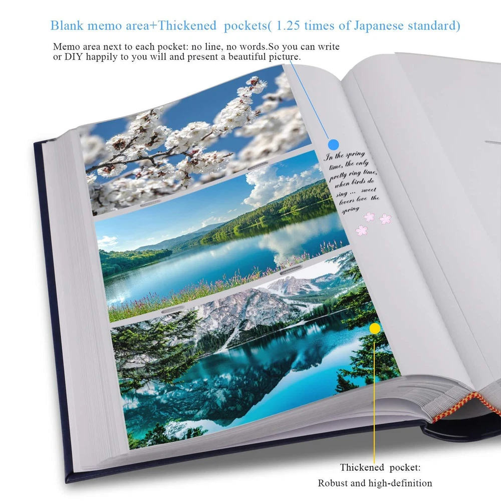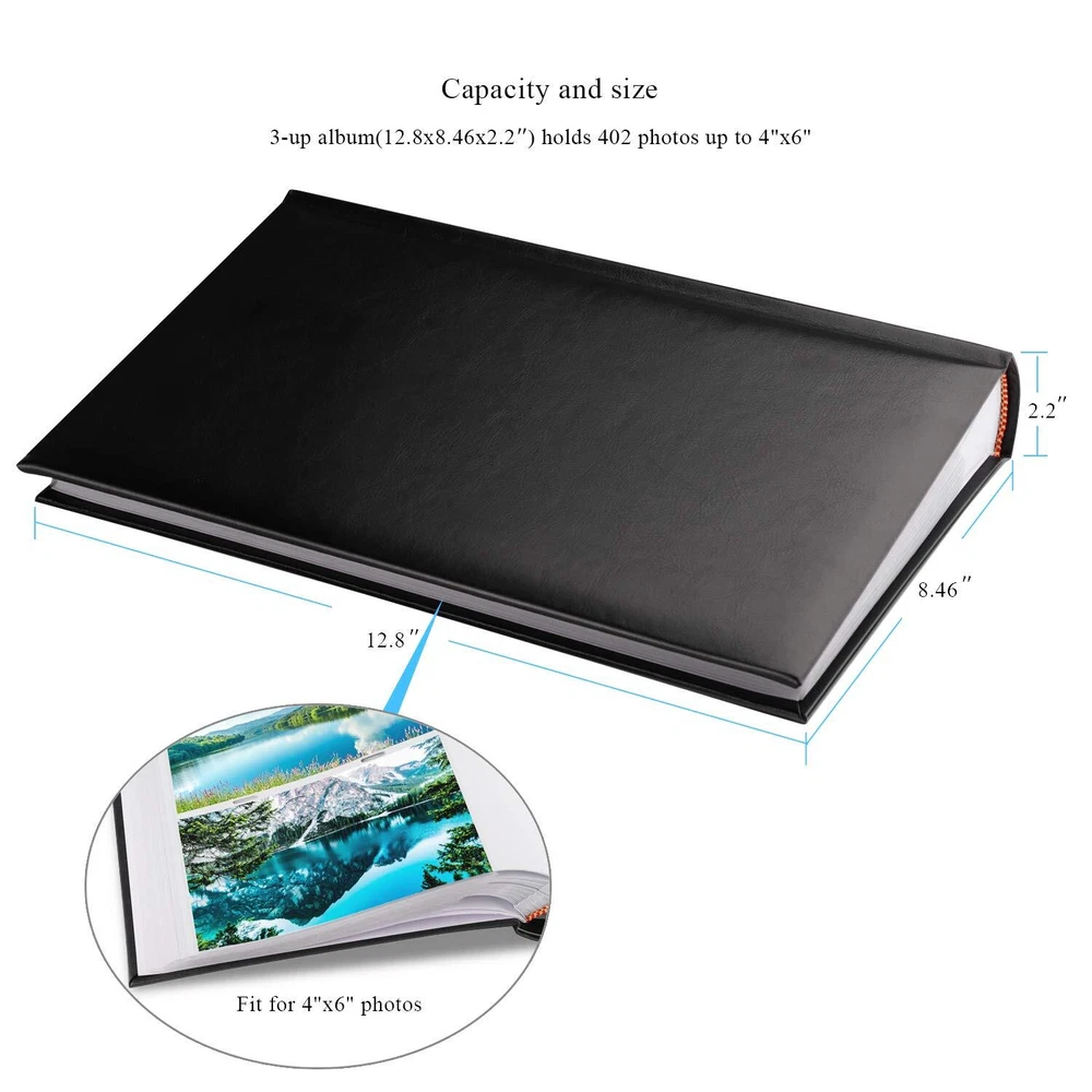 【PLENTY OF ROOM】The photo albums measures 12.99 x8.66 x 2.17 inches (L x W x H). Weight: 2.73lb. Album has a total of 67 sheet (134 pages) and holds 3 horizontal pictures per page. It stores up to 402 4x6 pictures. Fit photo size 4" x 6"(10.2 x 15.2 cm), NOT FIT 4½" x 6"(11.4 x 15.2 cm). 【EXQUISITE WORKMANSHIP】The PU leather hardcover which are resistant to tear, more durable than linen, paper, which have a really comfortable and soft touch and make the photo album much strong and non-deformable. It also looks more upscale and can be stored for a longer time. 【SAFE AND LONG-TERM PRESERVATION】Photo safe: acid, lignin and PVC free. The inside pocket sleeves are made of clear PP material, 0.5 times thicker than the industry standard, keeping your photos air free and dustproof, tear resistant, provides a high-quality preservation to your memories. 【PERFECT FOR A GIFT】Albums with a glued binding include a dedicated memo writing area. The blank memo space without horizontal lines next to each pocket, which you can write journal names, dates, places and special memories as you likes. Ideal gift for Valentine's Day, Christmas, Anniversary, Mother's Day, Thanksgiving Day, Birthday, Graduation and so on. It could also be used as Travel Record, Wedding Album, Baby row Album. A memory book of your own journey. 【CUSTOMER SATISFACTION】This is 4x6 photos holds 402 photographs, it will be a perfect photo album for recording your wonderful moments. Please don’t worry, we have checked all the albums before send them out. If you have any questions please feel free to us, we're always here for you. Let's take our journey and enjoy.