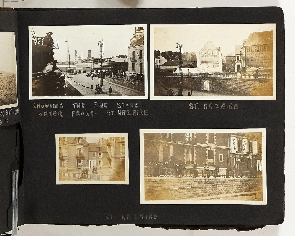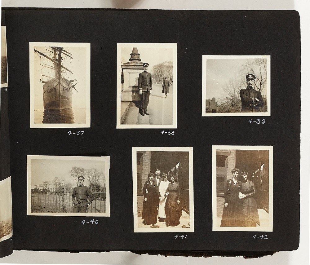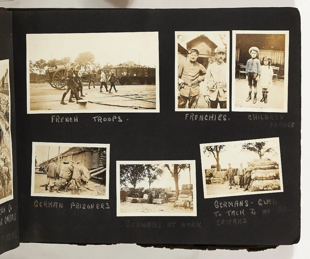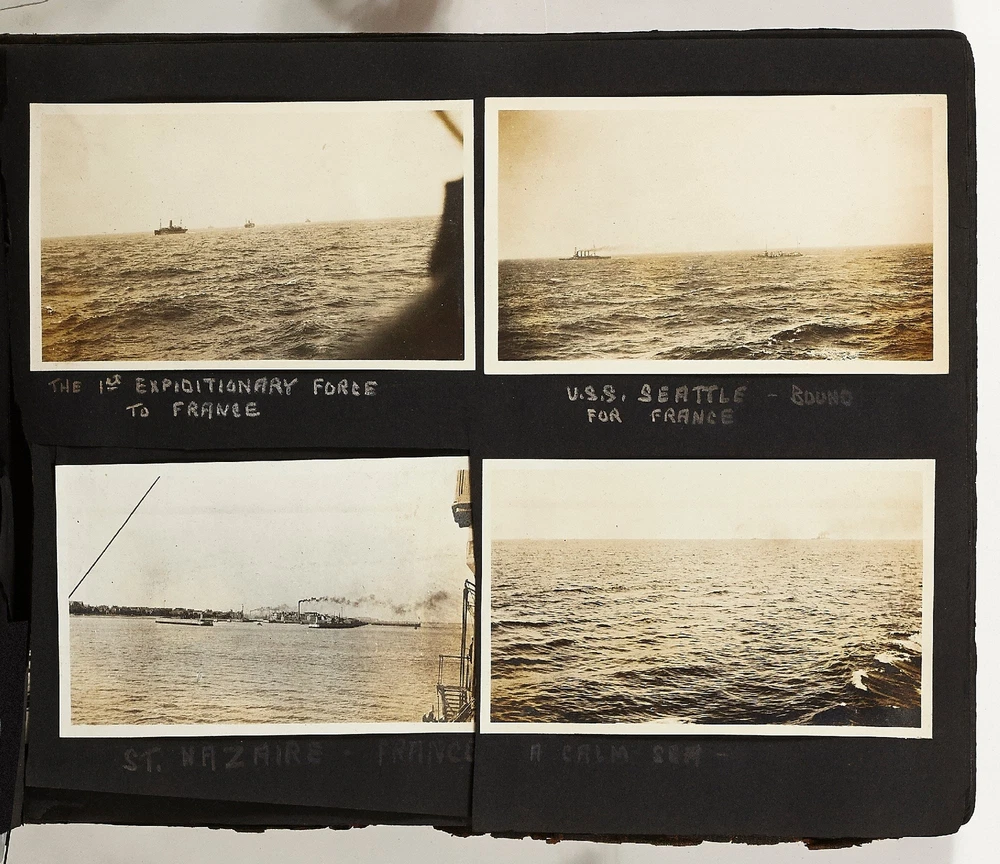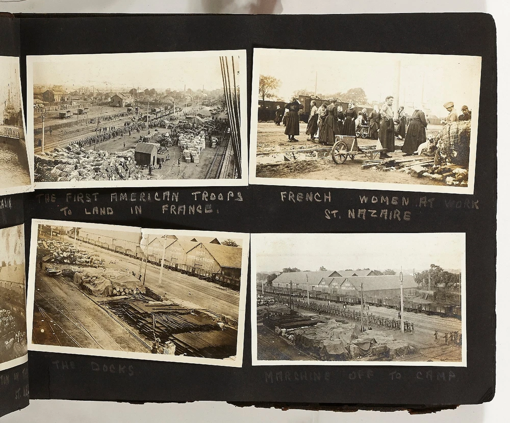 [Photo Album]: American Expeditionary Force WWI Title: [Photo Album]: American Expeditionary Force WWI Publication: France: 1915-1917 Description: Softcover. Oblong quarto. Measuring 12½" x 10". Black leather photo album. A collection of 244 sepia toned or black and white gelatin silver photographs measuring between 2½" x 3½" and 3½" x 6", some with captions. A good only photo album with detached pages, but with very good or better photographs affixed to stiff black paper. An album containing photos of a dock taken around 1915 as well as photos taken by a seaman in World War I. The early photographs show a group of men working on a large ship, both docked and at sea, including images of passing ships, men at the ship's wheel, and one of an unnamed lighthouse. After a break in the album, the second half shows service with either the Marines or Navy during World War I as part of the 1st A.E.F. force to arrive in France on the USS *Seattle* in 1917. They were docked at Port St. Nazaire in France, seen here, and were the first American troops to arrive in France. According to historian, Fred Baldwin, "The USA had joined the war, fighting alongside the Allies, and chose Saint-Nazaire as one of their most important entry harbors to France and Western European battlefields. Between 1917 and 1919, almost 198,000 troops and a daily average of 4,000 tons of material transited through Saint-Nazaire." These pictures show the first U.S. troops marching through St. Nazaire, local women working for the war effort, and a photograph captioned "U.S. aeroplane." Depicted are French troops (here dubbed "Frenchies") as well as French children. A few pages show German prisoners with captions like, "glad to talk to we Americans," "well fed and happy," and "glad to be in France," which suggests the lives of POWs in France was preferable to life in the trenches. There are uncaptioned photos of European towns and local people as well as sailors posed in uniform in front of stately homes and in town squares. One photo shows a group of U.S. Marines engaged in Fourth of July activities on board ship in 1917. The last few pages show the men leaving port with at-sea photographs of the crew, a large group of uniformed soldiers presumably waiting to be offloaded for a mission, and passing ships including an unidentified medical vessel. An extensive depiction of an American seaman's duty during World War I. Seller ID: 397455 Subject: Ephemera, Photography Between the Covers Between the Covers has been selling books for more than 30 years. Today we offer a wide ranging inventory, from Modern First Editions to General Used Books to Rare Archival Collections. We are active members of the Antiquarian Booksellers' Association of America (ABAA) and the International League of Antiquarian Booksellers (ILAB) . Terms All orders ship within two business days. Standard mail is USPS Media Mail. Expedited and international shipping are also available. We offer combined shipping on multiple orders. All books are guaranteed to be as described or they may be returned within 30 days of receipt for a full refund. This listing was created by Bibliopolis.