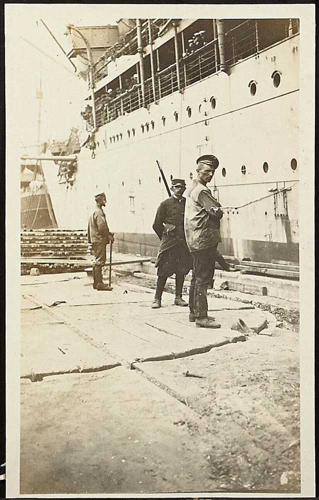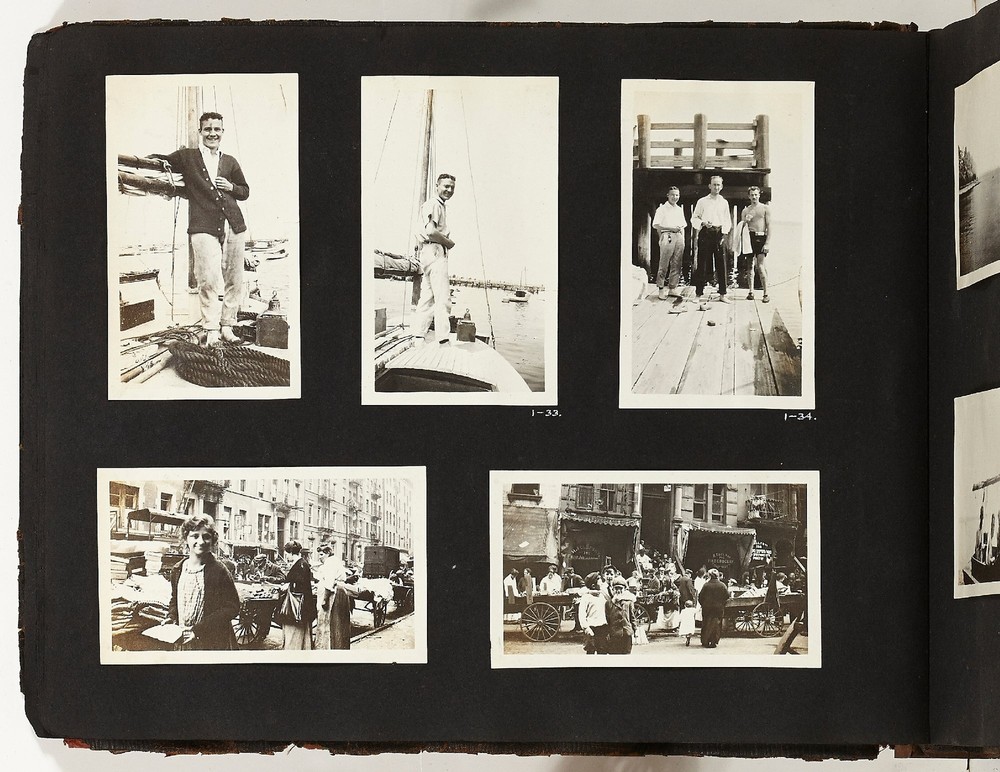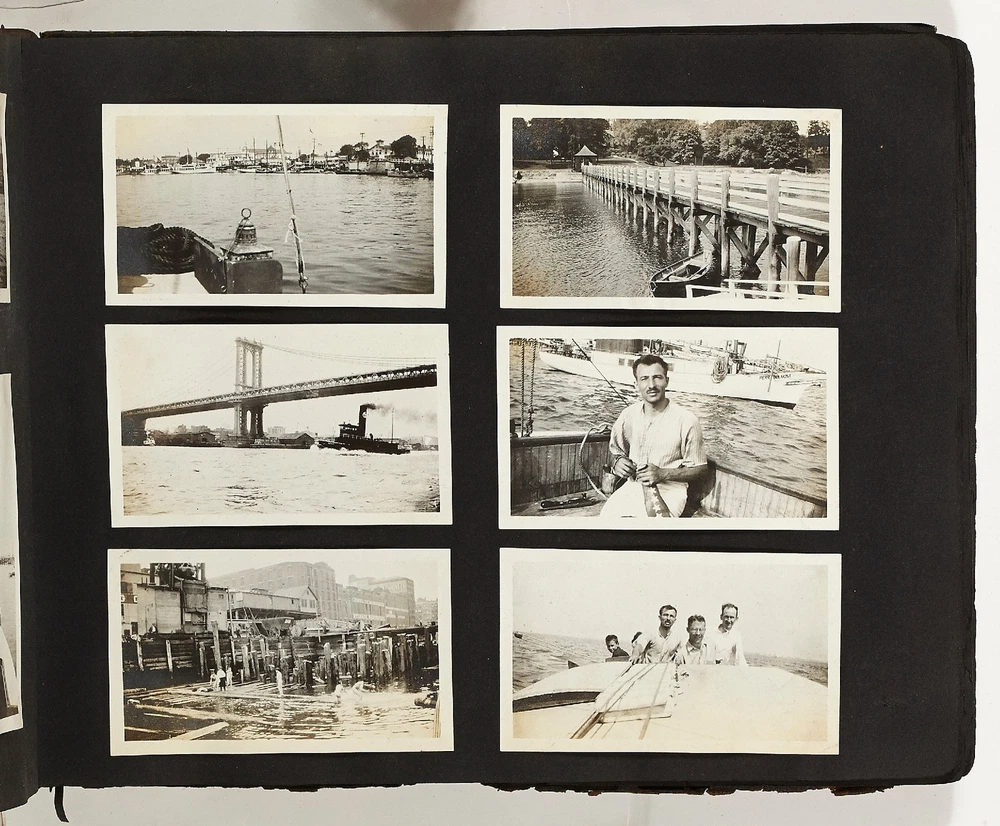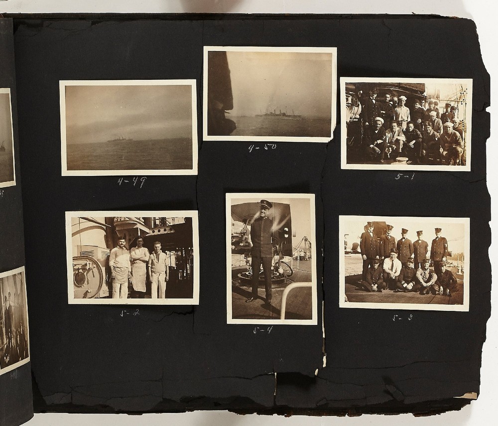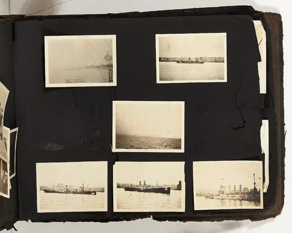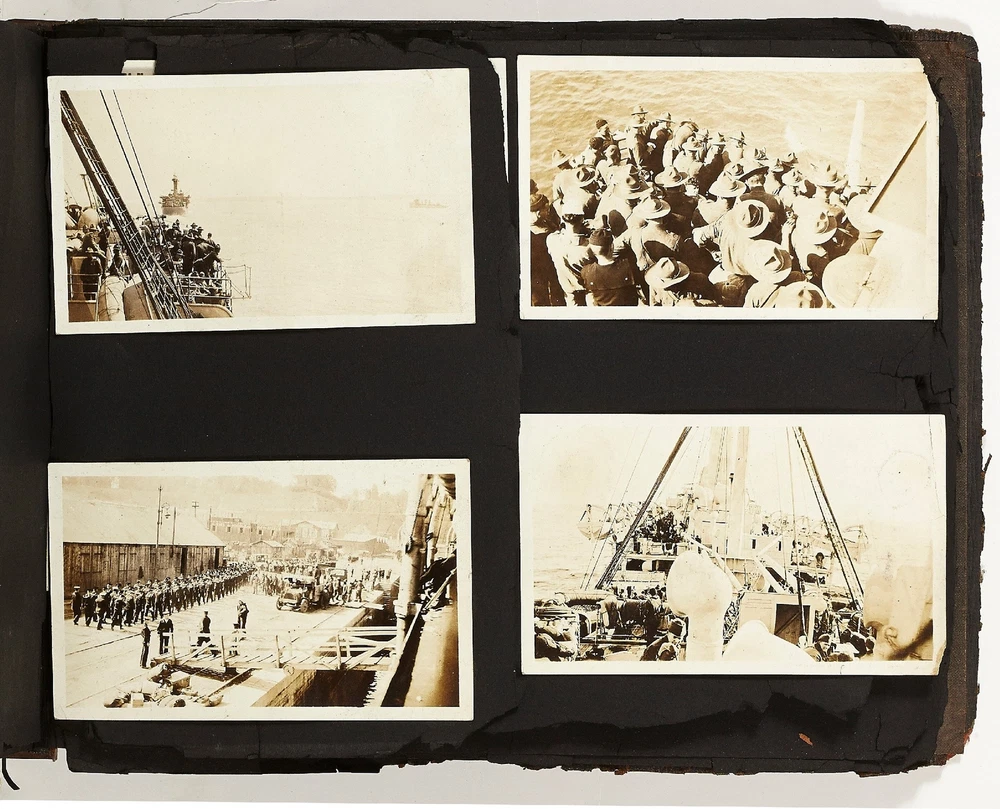 [Photo Album]: American Expeditionary Force WWI Title: [Photo Album]: American Expeditionary Force WWI Publication: France: 1915-1917 Description: Softcover. Oblong quarto. Measuring 12½" x 10". Black leather photo album. A collection of 244 sepia toned or black and white gelatin silver photographs measuring between 2½" x 3½" and 3½" x 6", some with captions. A good only photo album with detached pages, but with very good or better photographs affixed to stiff black paper. An album containing photos of a dock taken around 1915 as well as photos taken by a seaman in World War I. The early photographs show a group of men working on a large ship, both docked and at sea, including images of passing ships, men at the ship's wheel, and one of an unnamed lighthouse. After a break in the album, the second half shows service with either the Marines or Navy during World War I as part of the 1st A.E.F. force to arrive in France on the USS *Seattle* in 1917. They were docked at Port St. Nazaire in France, seen here, and were the first American troops to arrive in France. According to historian, Fred Baldwin, "The USA had joined the war, fighting alongside the Allies, and chose Saint-Nazaire as one of their most important entry harbors to France and Western European battlefields. Between 1917 and 1919, almost 198,000 troops and a daily average of 4,000 tons of material transited through Saint-Nazaire." These pictures show the first U.S. troops marching through St. Nazaire, local women working for the war effort, and a photograph captioned "U.S. aeroplane." Depicted are French troops (here dubbed "Frenchies") as well as French children. A few pages show German prisoners with captions like, "glad to talk to we Americans," "well fed and happy," and "glad to be in France," which suggests the lives of POWs in France was preferable to life in the trenches. There are uncaptioned photos of European towns and local people as well as sailors posed in uniform in front of stately homes and in town squares. One photo shows a group of U.S. Marines engaged in Fourth of July activities on board ship in 1917. The last few pages show the men leaving port with at-sea photographs of the crew, a large group of uniformed soldiers presumably waiting to be offloaded for a mission, and passing ships including an unidentified medical vessel. An extensive depiction of an American seaman's duty during World War I. Seller ID: 397455 Subject: Ephemera, Photography Between the Covers Between the Covers has been selling books for more than 30 years. Today we offer a wide ranging inventory, from Modern First Editions to General Used Books to Rare Archival Collections. We are active members of the Antiquarian Booksellers' Association of America (ABAA) and the International League of Antiquarian Booksellers (ILAB) . Terms All orders ship within two business days. Standard mail is USPS Media Mail. Expedited and international shipping are also available. We offer combined shipping on multiple orders. All books are guaranteed to be as described or they may be returned within 30 days of receipt for a full refund. This listing was created by Bibliopolis.