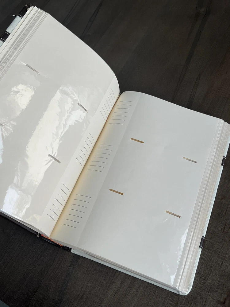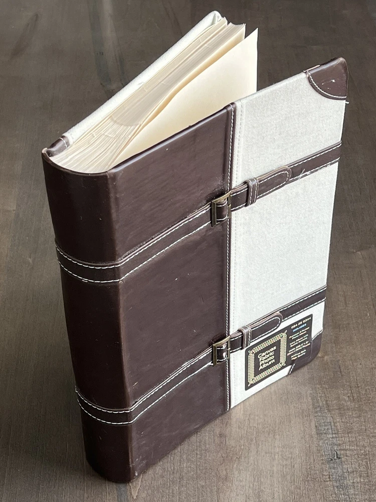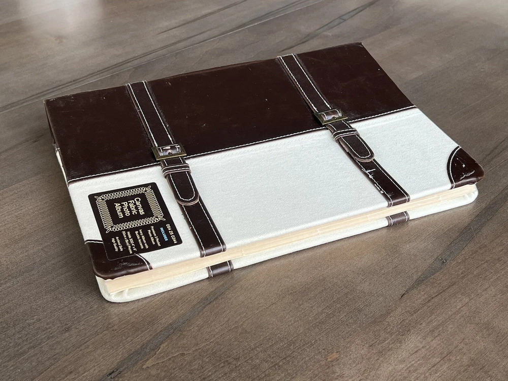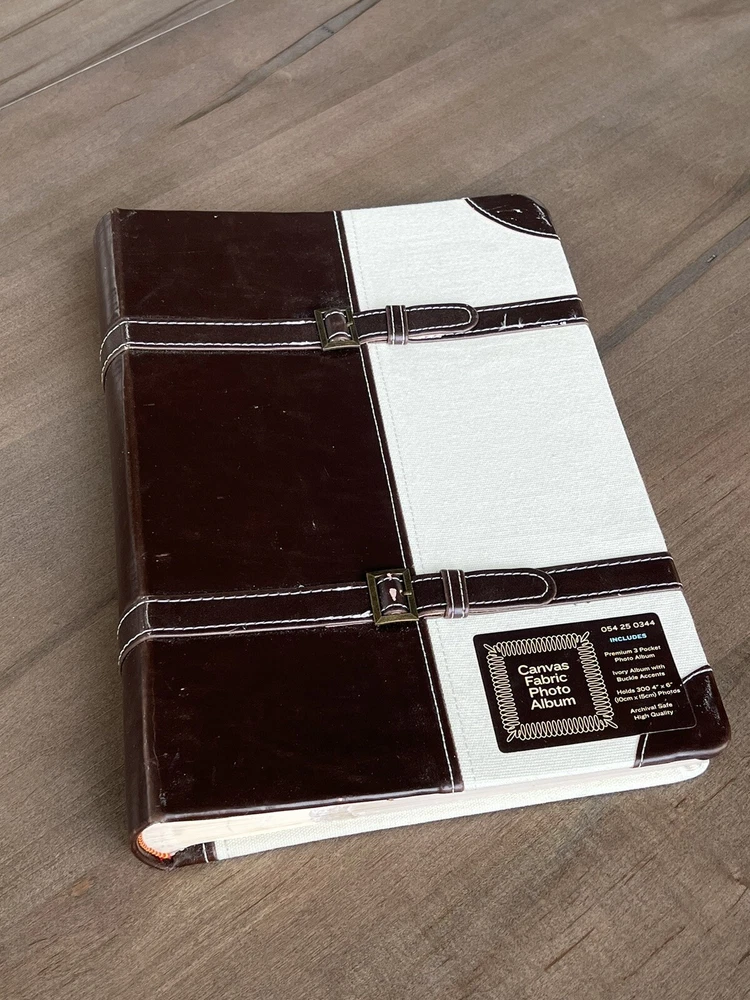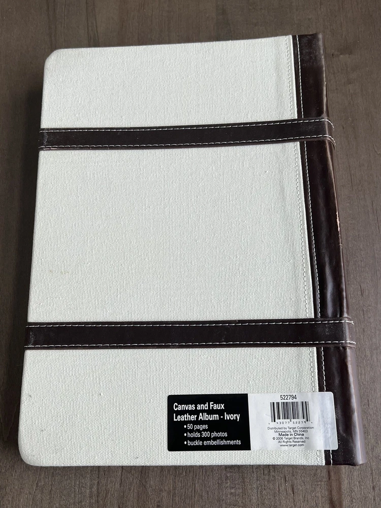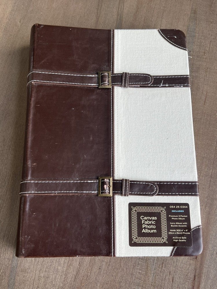 Photo Album Canvas & Faux Leather Ivory Album w/ Buckle Accents 3 Pocket 300 4x6. Never used. Target Brands Canvas and Faux Leather Photo Album. Ivory with buckle accents. 50 pages. Holds 300 photos. Buckle embellishments. Premium 3 Pocket Photo Album. Archival safe. High quality. Enjoy!