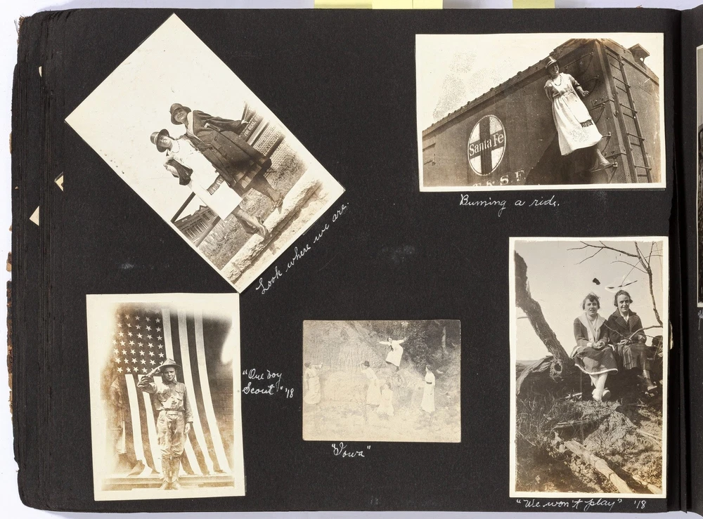 [Photo Album]: Images of an Oklahoma Family and Friends, 1917-20 Title: [Photo Album]: Images of an Oklahoma Family and Friends, 1917-20 Publication: (Oklahoma: 1917-20) Description: Softcover. Oblong octavo (11" x 8"). String bound flexible leather covers. Contains approximately 200 gelatin silver prints of various sizes neatly mounted on the rectos and versos of black paper leaves. Most prints are captioned in white ink on the mount underneath the print. The leather spine and covers are worn and perished at the edges, first fourteen leaves neatly detached from spine, else very good or better, interior prints are clean and bright with one photo removed. Laid in is one loose print (2 ¾" x 4 ½") of Bacon Rind, Chief of the Osage Nation in Oklahoma, captioned in ink on the blank bottom margin of the print. The album contains numerous images of a large extended Oklahoma family and friends socializing and engaged in various outdoor activities, including horseback riding, and at an outing at Wheeler Park, Oklahoma City. Most images are of young women, solo and in small groups of friends. Also included are a few images of young men at U.S. Army training camps, and one young man in uniform: "France ‘18". Two large portraits of a Western Union "Manager" and "Operator" at Guthrie suggests that the family home may have been located near Guthrie in Logan County. An attractive collection of images. Seller ID: 537714 Subject: Photography Between the Covers Between the Covers has been selling books for more than 30 years. Today we offer a wide ranging inventory, from Modern First Editions to General Used Books to Rare Archival Collections. We are active members of the Antiquarian Booksellers' Association of America (ABAA) and the International League of Antiquarian Booksellers (ILAB) . Terms All orders ship within two business days. Standard mail is USPS Media Mail. Expedited and international shipping are also available. We offer combined shipping on multiple orders. All books are guaranteed to be as described or they may be returned within 30 days of receipt for a full refund. This listing was created by Bibliopolis.