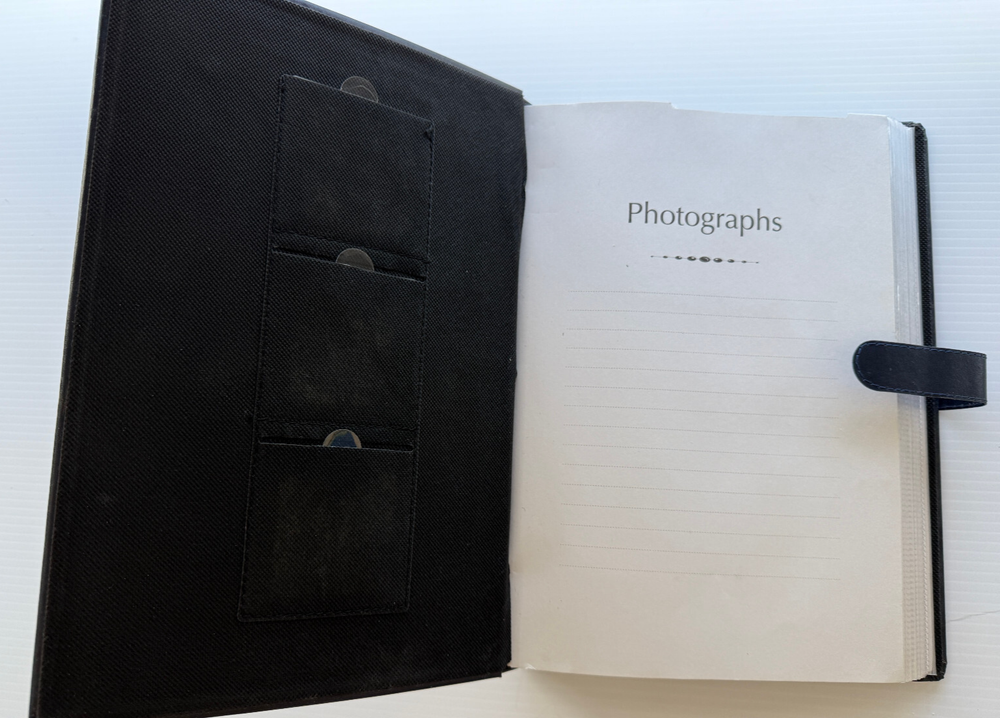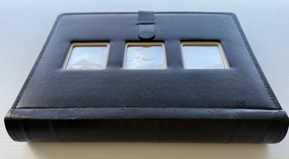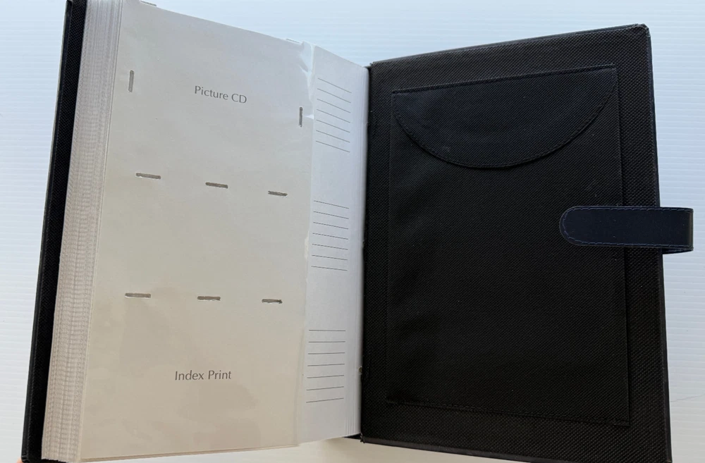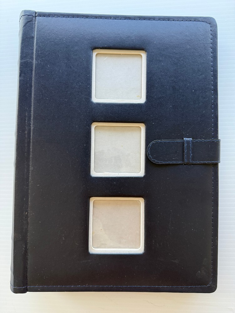 Photo Album Navy Faux Leather 3 Cover Photos 300 4x6 Photos Storage Pocket 50 pages with place to write description on each photo, has 3 pages for CDs/negatives/index photo, and a back pocket to place extra items. Good condition. Insides pages are in good condition. Outside cover has some minor scuffs. See pictures to determine your level of condition.