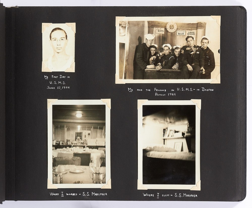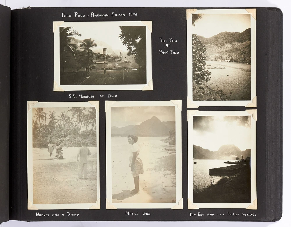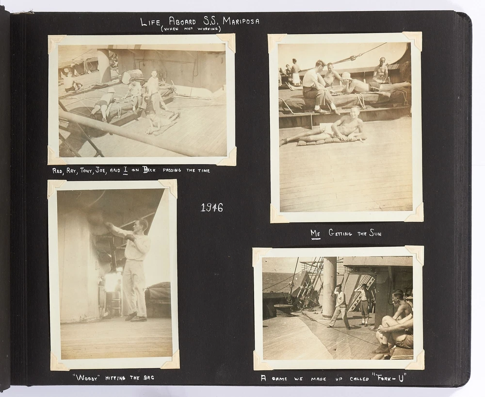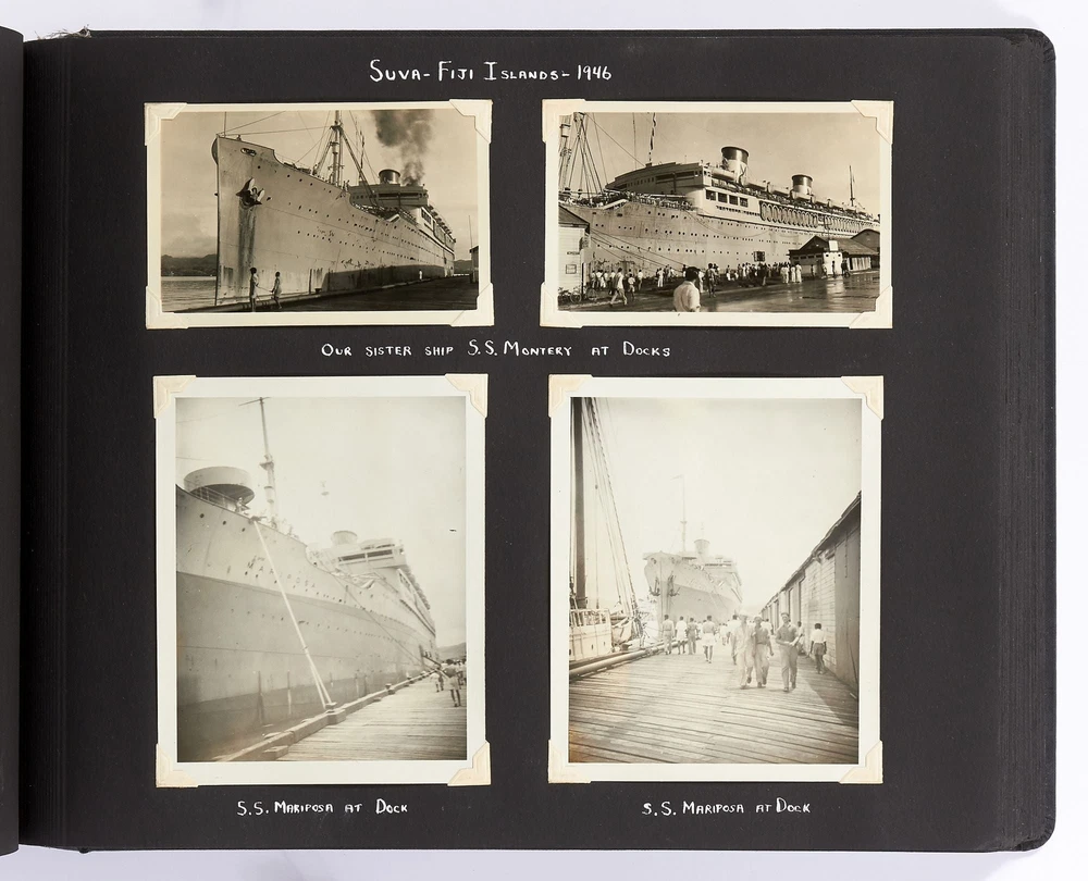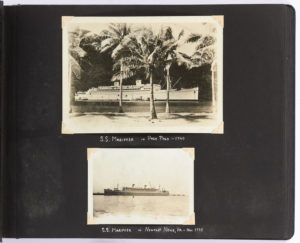 [Photo Album]: On Board the U.S.S. Mariposa Title: [Photo Album]: On Board the U.S.S. Mariposa Publication: 1944-1947 Description: Softcover. Oblong quarto. Measuring 13" x 10". String-tied black leather. Contains 190 black and white or sepia toned gelatin silver photographs measuring between 1.75" x 2.5" and 8" x 11", with captions and 20 pictorial postcards. Very good photo album with some mustiness, rubbing, and slight edgewear with near fine photographs. A photo album kept by a sailor while serving on board the S.S. *Mariposa* and S.S. *Aberdeen Victory* during and after World War II between 1944 and 1947. The album begins with photos of the *Mariposa* docked in Newport News, Virginia in 1945 followed by a large photo of the S.S. *Aberdeen Victory* in Marseille in 1947 with a caption that reads, "went around the world in this ship." One page includes a collection of portrait photos of young women he met on his travels with their location captioned under the photo including the Philippines, Brazil, Panama, and England. The *Mariposa* is photographed thoroughly including the rigging, kitchen, sleeping quarters, and upper decks. One section is captioned "Life Aboard S.S. Mariposa (when not working)" and shows the men "getting the sun" and playing a game they created called "Fork-U." There are also photos from the Atlantic Ocean and the Mediterranean featuring the North Atlantic in winter and the Rock of Gibraltar. The Pacific Ocean is also pictured with photos of a "goony bird following the ship" and an "island in the distance on the Pacific." The *Aberdeen* is also photographed in a section titled "Aberdeen Victory views 1947" which shows the church altar aboard the ship and "unloading by crane in Bombay." The men of the *Aberdeen* are also seen washing clothes and peeling potatoes. The crew enjoyed time off the ship as well, and photos of leave in the Panama Canal Zone are featured. They went to bars including the Florida club and flirted with local girls. When traveling past San Francisco the compiler photographed Alcatraz and the Army docks where the Navy ships were kept. The sailor also collected a number of pictorial postcards from his stop in Hawaii which feature Hawaiian tropical foliage, scenes of life on the island, and various landmarks. While in Hawaii he photographed Wakiki beach and downtown Honolulu with images of street scenes and buildings. Much of his time was spent island hopping in the Pacific to places such as Pago Pago in American Samoa, the Philippines, and Fiji where they spent a majority of their time in Suva. These photos show native houses, beaches, and the local people of the islands. One well-composed photo shows sailors walking up the docks with the *Mariposa* in the background; another shows their sister ship in the docks at Suva. While in Suva the compiler also photographed the local policemen in uniform, the botanical gardens, and the hotel. One photo shows an aerial view of people on a beach and is captioned "war brides and visitors on dock." Later in the album there are professional images of a volcanic eruption in New Guinea which took place in 1937. Another section of professional photos shows before and after shots of Manila depicting the effects of World War II. Photos from Brisbane, Australia show docks with the *Mariposa's* imposing hull in view as well as a seaplane flying over head. The city of Brisbane is also seen throughout with photos of shops and people of the area. They also stopped at Penang Island in the Malayan Straits which features photos of children, temples, and native workers. The final pages are from India and Ceylon with photos of dances, buildings, and a guide with a camel. An extensive collection of photographs detailing a sailor's time with the Navy at the end of World War II. Seller ID: 408134 Subject: Ephemera, Photography Between the Covers Between the Covers has been selling books for more than 30 years. Today we offer a wide ranging inventory, from Modern First Editions to General Used Books to Rare Archival Collections. We are active members of the Antiquarian Booksellers' Association of America (ABAA) and the International League of Antiquarian Booksellers (ILAB) . Terms All orders ship within two business days. Standard mail is USPS Media Mail. Expedited and international shipping are also available. We offer combined shipping on multiple orders. All books are guaranteed to be as described or they may be returned within 30 days of receipt for a full refund. This listing was created by Bibliopolis.