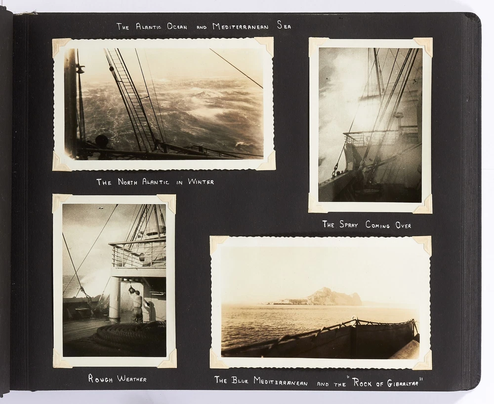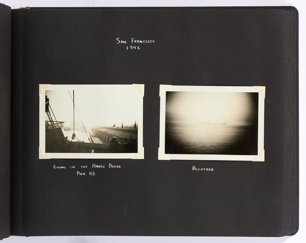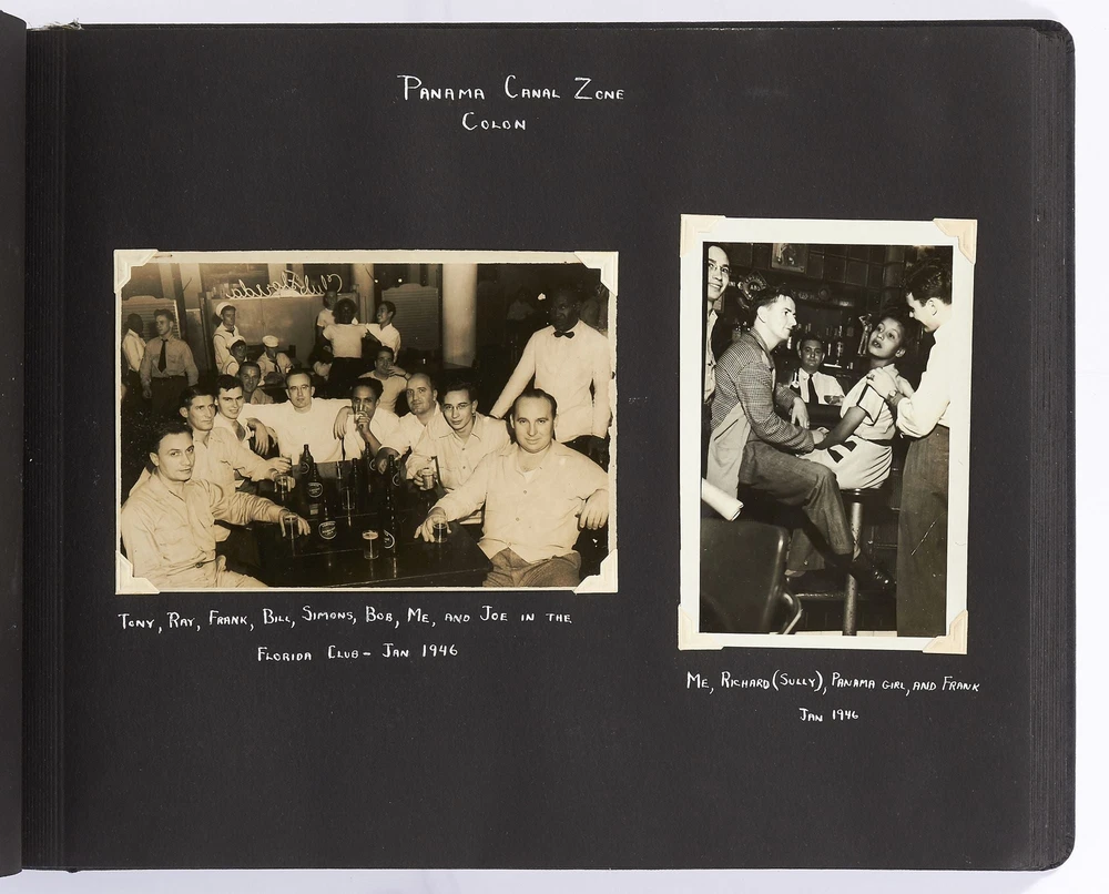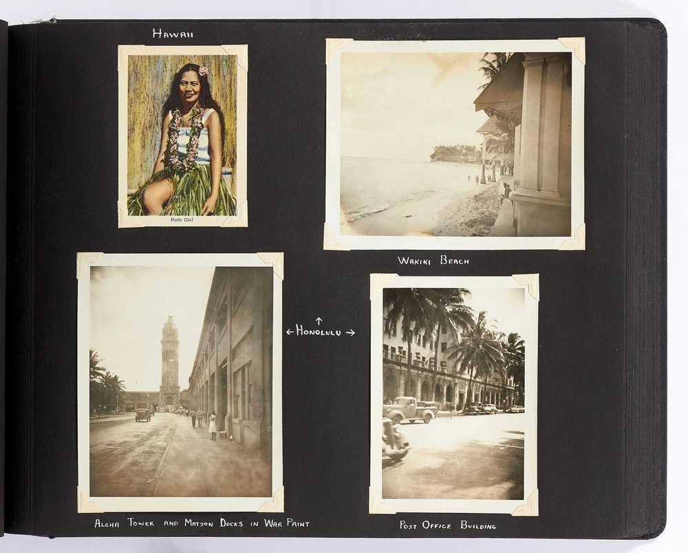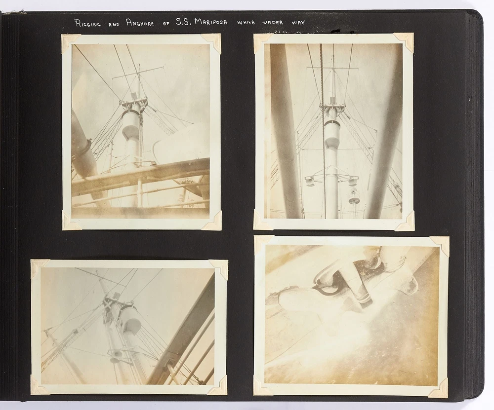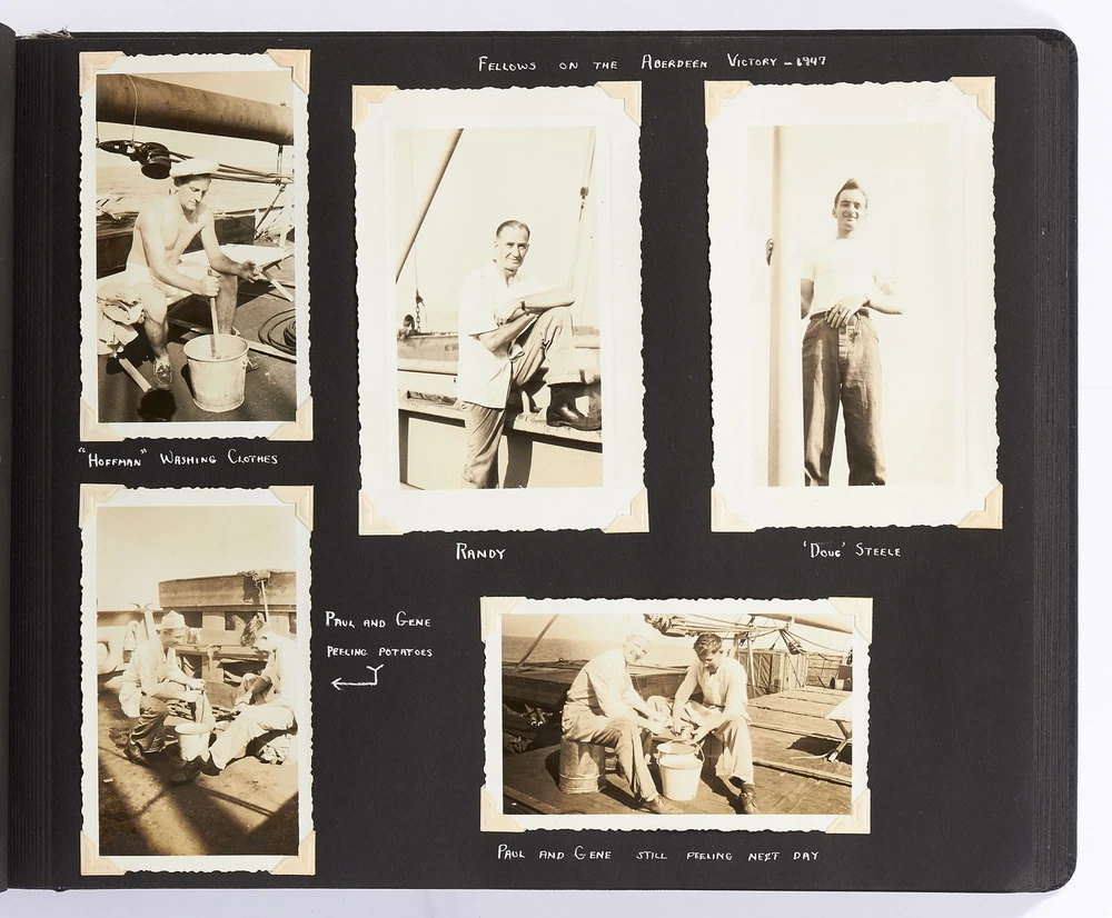[Photo Album]: On Board the U.S.S. Mariposa Title: [Photo Album]: On Board the U.S.S. Mariposa Publication: 1944-1947 Description: Softcover. Oblong quarto. Measuring 13" x 10". String-tied black leather. Contains 190 black and white or sepia toned gelatin silver photographs measuring between 1.75" x 2.5" and 8" x 11", with captions and 20 pictorial postcards. Very good photo album with some mustiness, rubbing, and slight edgewear with near fine photographs. A photo album kept by a sailor while serving on board the S.S. *Mariposa* and S.S. *Aberdeen Victory* during and after World War II between 1944 and 1947. The album begins with photos of the *Mariposa* docked in Newport News, Virginia in 1945 followed by a large photo of the S.S. *Aberdeen Victory* in Marseille in 1947 with a caption that reads, "went around the world in this ship." One page includes a collection of portrait photos of young women he met on his travels with their location captioned under the photo including the Philippines, Brazil, Panama, and England. The *Mariposa* is photographed thoroughly including the rigging, kitchen, sleeping quarters, and upper decks. One section is captioned "Life Aboard S.S. Mariposa (when not working)" and shows the men "getting the sun" and playing a game they created called "Fork-U." There are also photos from the Atlantic Ocean and the Mediterranean featuring the North Atlantic in winter and the Rock of Gibraltar. The Pacific Ocean is also pictured with photos of a "goony bird following the ship" and an "island in the distance on the Pacific." The *Aberdeen* is also photographed in a section titled "Aberdeen Victory views 1947" which shows the church altar aboard the ship and "unloading by crane in Bombay." The men of the *Aberdeen* are also seen washing clothes and peeling potatoes. The crew enjoyed time off the ship as well, and photos of leave in the Panama Canal Zone are featured. They went to bars including the Florida club and flirted with local girls. When traveling past San Francisco the compiler photographed Alcatraz and the Army docks where the Navy ships were kept. The sailor also collected a number of pictorial postcards from his stop in Hawaii which feature Hawaiian tropical foliage, scenes of life on the island, and various landmarks. While in Hawaii he photographed Wakiki beach and downtown Honolulu with images of street scenes and buildings. Much of his time was spent island hopping in the Pacific to places such as Pago Pago in American Samoa, the Philippines, and Fiji where they spent a majority of their time in Suva. These photos show native houses, beaches, and the local people of the islands. One well-composed photo shows sailors walking up the docks with the *Mariposa* in the background; another shows their sister ship in the docks at Suva. While in Suva the compiler also photographed the local policemen in uniform, the botanical gardens, and the hotel. One photo shows an aerial view of people on a beach and is captioned "war brides and visitors on dock." Later in the album there are professional images of a volcanic eruption in New Guinea which took place in 1937. Another section of professional photos shows before and after shots of Manila depicting the effects of World War II. Photos from Brisbane, Australia show docks with the *Mariposa's* imposing hull in view as well as a seaplane flying over head. The city of Brisbane is also seen throughout with photos of shops and people of the area. They also stopped at Penang Island in the Malayan Straits which features photos of children, temples, and native workers. The final pages are from India and Ceylon with photos of dances, buildings, and a guide with a camel. An extensive collection of photographs detailing a sailor's time with the Navy at the end of World War II. Seller ID: 408134 Subject: Ephemera, Photography Between the Covers Between the Covers has been selling books for more than 30 years. Today we offer a wide ranging inventory, from Modern First Editions to General Used Books to Rare Archival Collections. We are active members of the Antiquarian Booksellers' Association of America (ABAA) and the International League of Antiquarian Booksellers (ILAB) . Terms All orders ship within two business days. Standard mail is USPS Media Mail. Expedited and international shipping are also available. We offer combined shipping on multiple orders. All books are guaranteed to be as described or they may be returned within 30 days of receipt for a full refund. This listing was created by Bibliopolis.