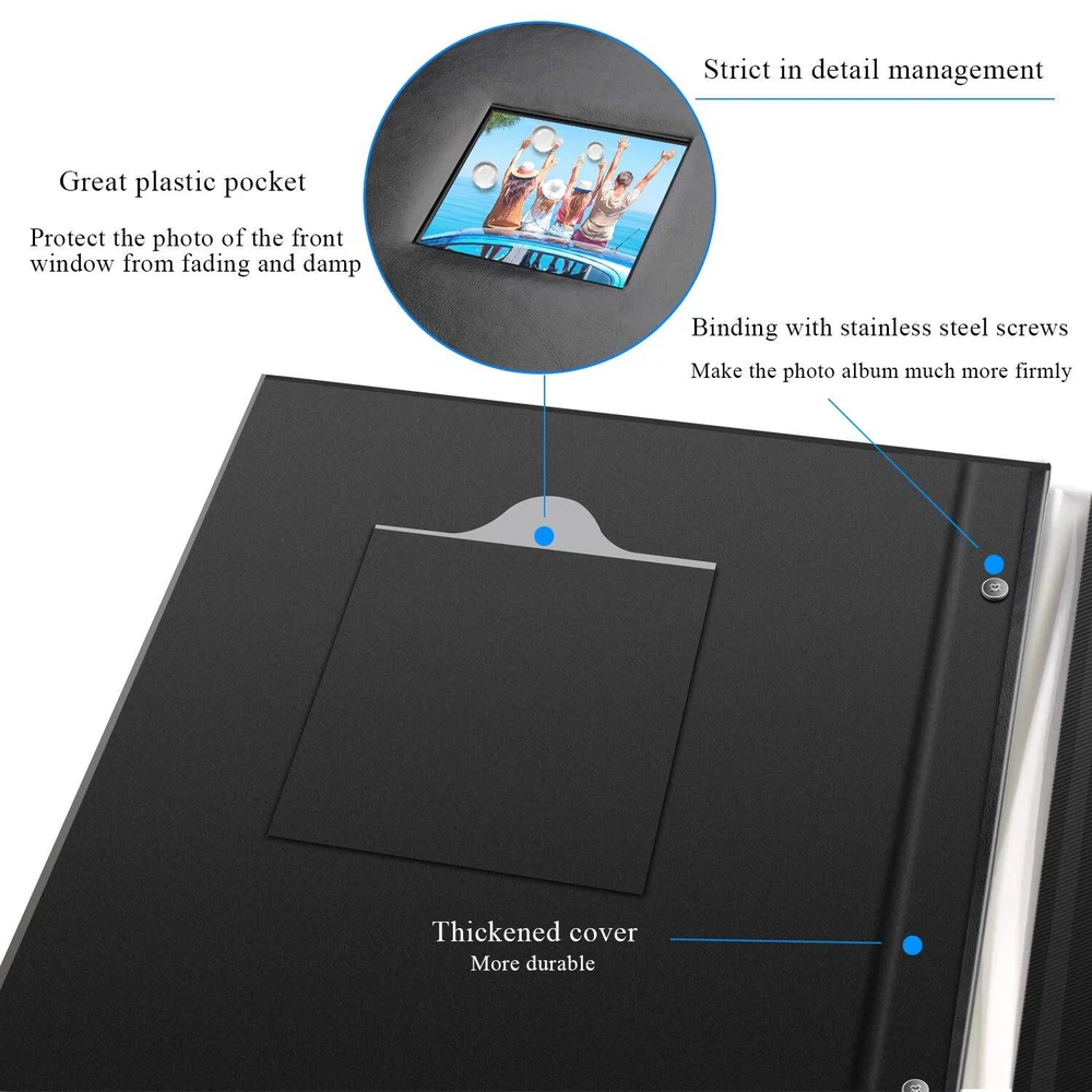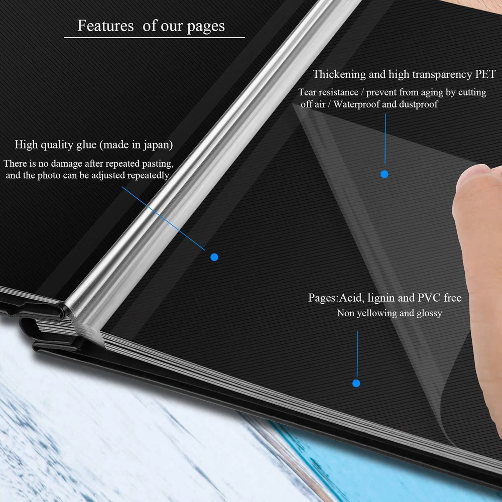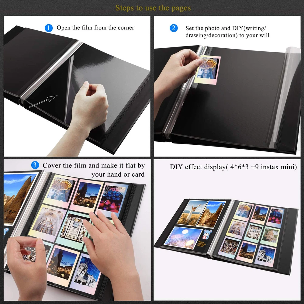 Perfect gift self-adhesive photo book is a wonderful gift for your family and friends. A good gift for birthday, Valentine's Day, Mother's Day, Christmas and the other special occasions. The Magnetic Self-Stick photo album is different from traditional albums. It can not only save photos, but also allow you to add decorative options to personalize your album. 1 DOT2 innovative self-adhesive photo album helps you to paste your favorite photos on the photo album in seconds without using other auxiliary tools. From now on, you only need three steps: 1. Uncover the film 2. Put in the photos 3. Cover with plastic film Specifications Color: Classic pearl black Weight: 2.11 lb (0.96kg) Total: 20 sheets (40 pages) Album cover size: 11.4X10.6 inch Inner page size: 11.02X8.35 inch Advantages 1. This self-adhesive photo album consists of 20 sheets cardboard with film that is not only non-deformable and durable, but also waterproof dustproof and airtight. The photos will never fade for years, so will your beloved memories. 2. 40 pages (20 sheets) can hold 3”X5”, 4”X6”, 5”X7”, 6”X8”and 8”X10”inche photos 3. The cover is made of PU leather. It makes the photo album much strong, non-deformable and permanent collection. 4. The self-adhesive pages make it much easier for you to fix the photos and no corner sticker will be needed. 5. The classic black pages make the DIY easier and looks more elegant. 6. On the cover of the album is a 3.94”X3.94” window. You can define the topic according to your wishes. The windows often have a protective cover and a slit or a removable backing, so you can change the photo as often as you want. If you need the bigger photo album, please search B08FZYSXV6 If you have any questions, please contact us and let us know to make it right for you. 📕【PLENTY OF ROOM】Cover size: Length 11.4 x Width 10.6 (inches), internal self-adhesive page length 11.02x Width 8.35 (inches), 20 sheets/40 pages. It is Double-sided tape pages and can hold all sizes of photos such as 3”X5”, 4”X6”, 5”X7”, 6”X8” and 8”X10” inches and any tickets you wanna keep. 📕【GOOD ADHESION AND LONG-TERM PRESERVATION】The thickened and clear self-adhesive film design and high quality black inner pages can protect photos and text well from dust, debris, and moisture. It will not fade for years, which is suitable for long term storage. No corner stickers or glue needed to place photos on the page. The adhesive is strong enough to hold the photos, but you can still reposition or remove them as needed. Dust-free, lignin-free, acid free and PVC free. 📕【EXQUISITE WORKMANSHIP】The classic black PU leather hardcover which are resistant to tear, more durable than linen, paper, and also looks more upscale. The leather cover has a really comfortable and soft touch and make the picture album much strong and non-deformable. The stainless steel nails, which does not rust and more durable. Your photos can be better protected and it may stay as a new one for years 📕【PERFECT FOR A GIFT】There is one 3.94X3.94" decorative cover window on the photo album. You can define the topic according to your wishes. Ideal gift for Valentine's Day, Christmas, Anniversary, Mother's Day, Thanksgiving Day, Birthday, Graduation, Anniversary and so on. It could also be used as Travel Record, Wedding Album, Baby Milestone Albums. A memory book of your own journey. 📕【EASY TO PERSONALIZE】This is a DIY scrapbook album, you can fully let your imagination go wild. It will be a perfect photo album for recording your wonderful moments. Please don’t worry, we have checked all the albums before send them out. If you have any questions please feel free to contact us, we're always here for you. Let's take our journey and enjoy.
