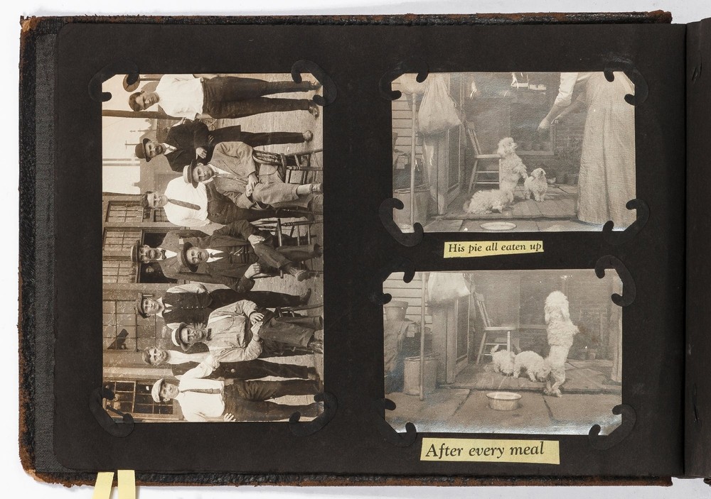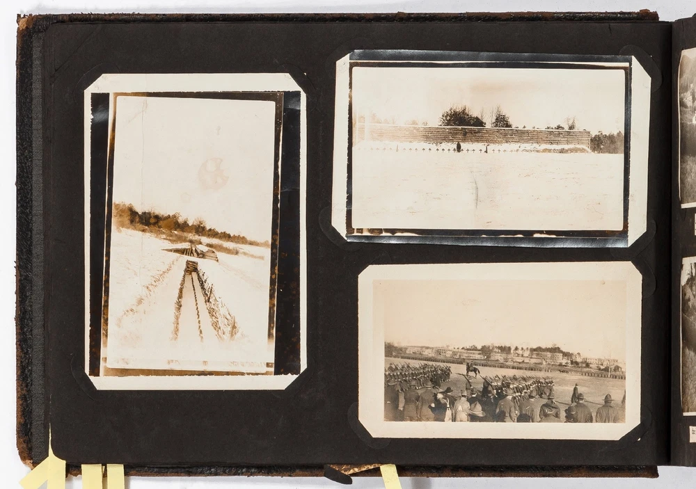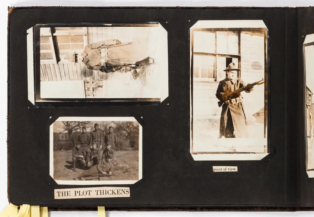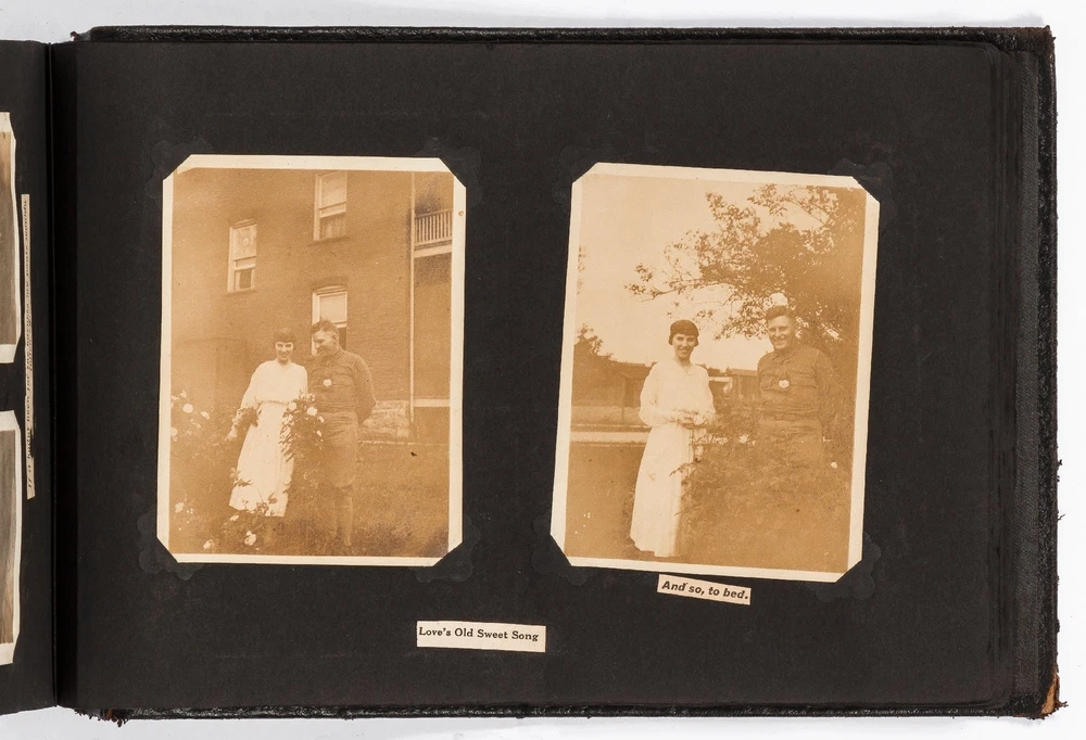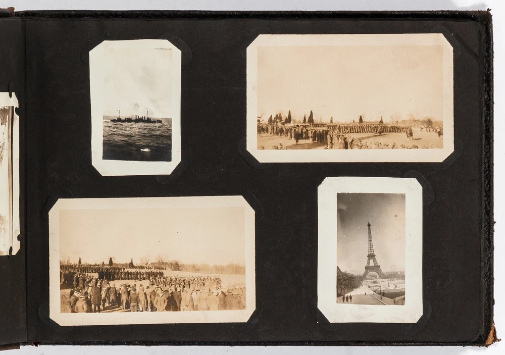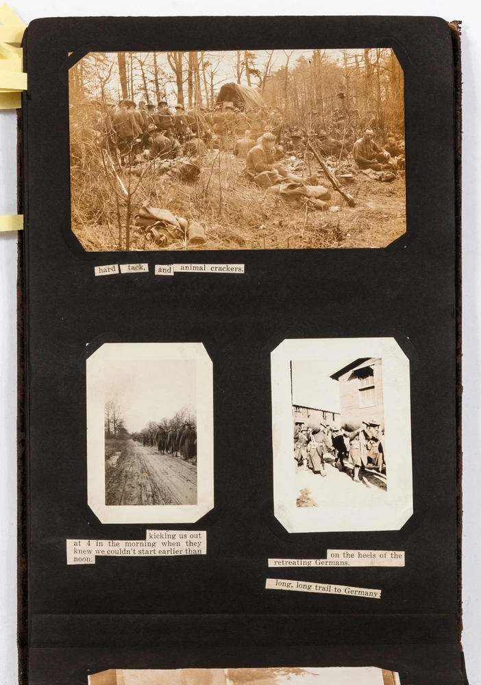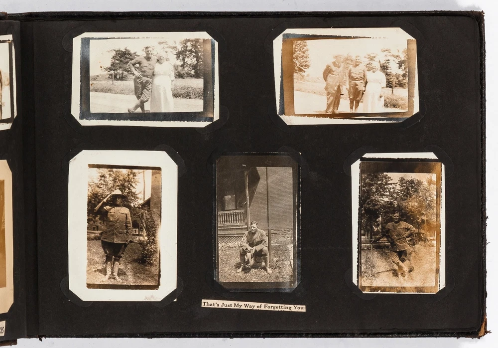 (Photo Album): Soldier's Photo Album from Before, During, and After World War II Title: (Photo Album): Soldier's Photo Album from Before, During, and After World War II Publication: Paris, France: [circa 1930-1950] Description: Softcover. Oblong quarto measuring 11.5" x 7". String tied black leather flexible boards with "photographs" embossed in gilt. Contains 264 gelatin silver black and white or sepia toned photographs measuring between 1.5" x 1" and 8.5" x 6.5" with some captions. Bumped spine ends and corners with some light wear on the leather, about near fine with near fine lightly faded photographs. A young man's photo album from before, during, and after World War II, circa 1930s-1950s. Newspaper and magazine cut outs are used to caption certain photographs, "This album is a real monument." A page is dedicated to a young woman captioned, "come where my love lies," with pictures of the woman posing and smiling. In other photographs the couple can be seen affectionately holding each other in their arms. Many of the photographs also show the man's friends, in group photographs. There are real photograph postcards of family picnics as well with some regular family photographs including beach trips with pictures of swimsuits from the time frame. Several pictures of the man's family poodles, cats, and later pictures of pet birds are included as he really loved animals. There are pictures from Paris featuring the Eiffel tower and during the man's visit he takes pictures of past war barracks and old military paraphernalia. This may have sparked that man's interest to join the army during World War II. During his time in the war there are pictures of him with his infantry at base and training, one of which is captioned, "That's just my way of forgetting about you." There is one picture that shows dozens of beds outside covered in snow, completely empty. After returning home from war he has some later hunting photographs one of which shows a deer fully strung up and about to be skinned. He also can be seen working in a small goods store behind the counter with pictures of some of the food items and home goods he sold. His life after is mostly focused on his wife with a photograph of the two posed close together with her captioned, "attempted to kiss him," and, "take your time." A wedding photo of his wife in her dress is shown with a later picture of the couple together captioned, "And so, to bed." Some of the photographs feature accidental double exposures of the couple so that it looks like multiple couples are pictured in some of the shots. An interesting travel photo album belonging to a young man during the course, before, and after World War II. Seller ID: 424529 Subject: Ephemera, Photography Between the Covers Between the Covers has been selling books for more than 30 years. Today we offer a wide ranging inventory, from Modern First Editions to General Used Books to Rare Archival Collections. We are active members of the Antiquarian Booksellers' Association of America (ABAA) and the International League of Antiquarian Booksellers (ILAB) . Terms All orders ship within two business days. Standard mail is USPS Media Mail. Expedited and international shipping are also available. We offer combined shipping on multiple orders. All books are guaranteed to be as described or they may be returned within 30 days of receipt for a full refund. This listing was created by Bibliopolis.