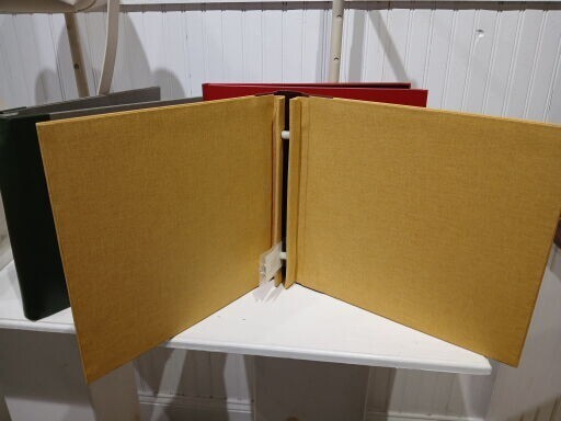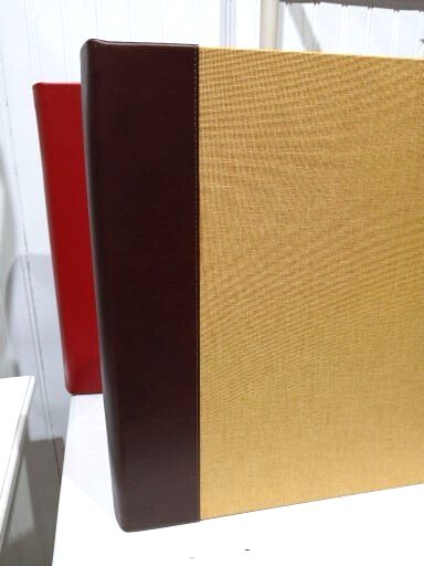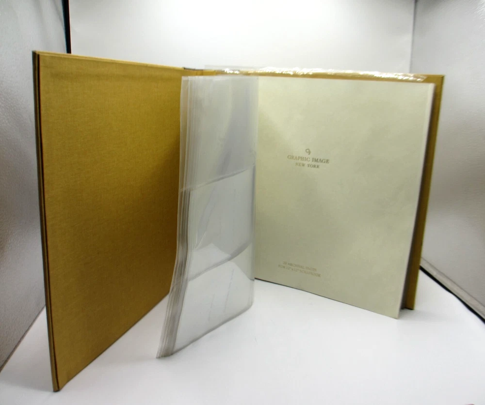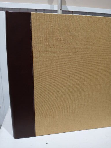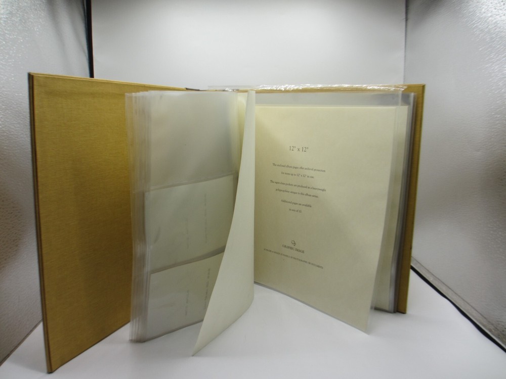 New Old Inventory Graphic Image XXL photo album Cover is linen fabric with leather Interior can hold archival quality polypropylene pages that are heavy weight and super clear. Pages won't wrinkle or harm photos. Ships with one set of 10 pages which holds up to 120, 4" x 6" prints. And one set of 12 x 12 pages. Each page holds six photographs, horizontal. Album cover measures 13-1/2" x 15"