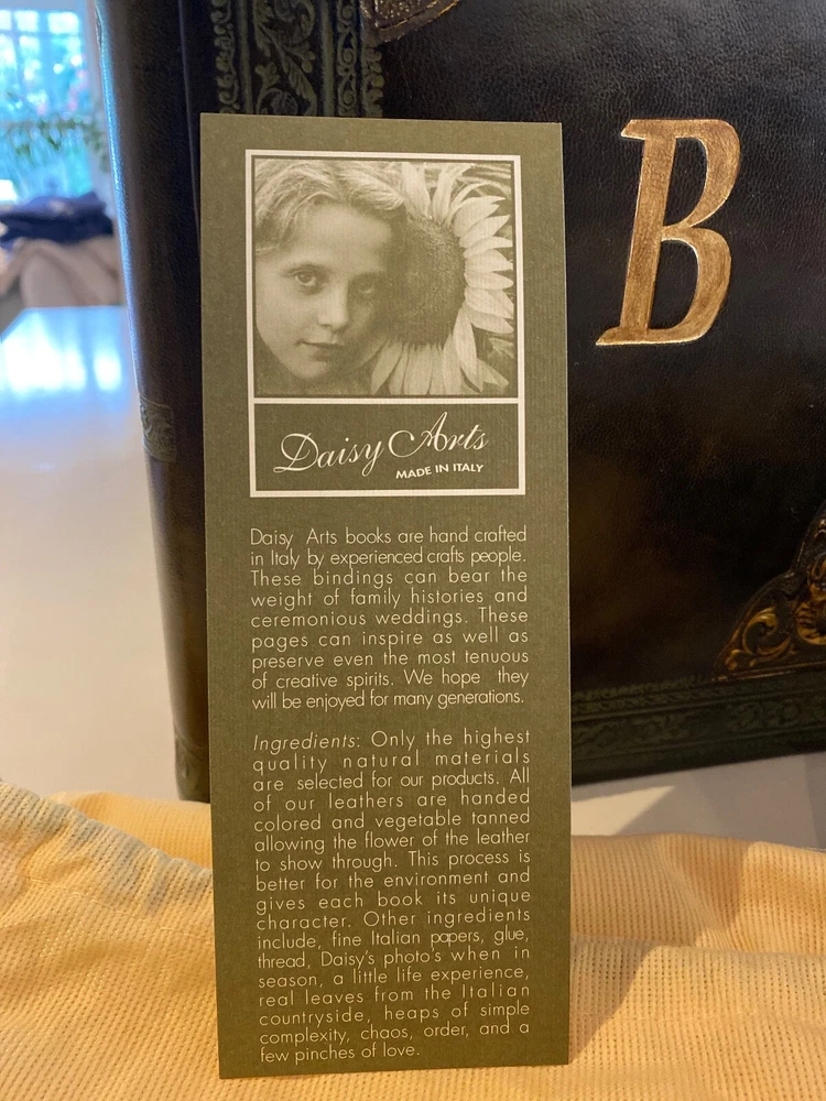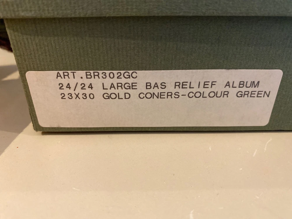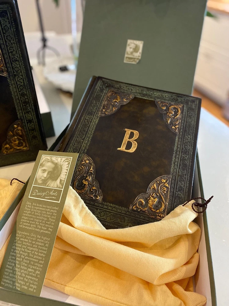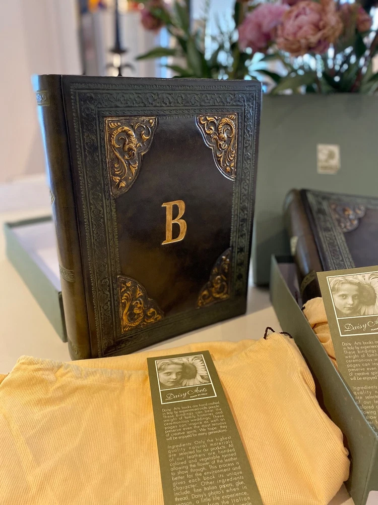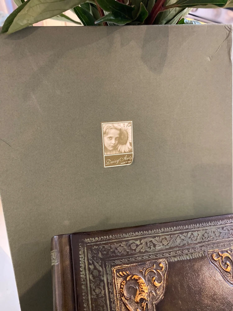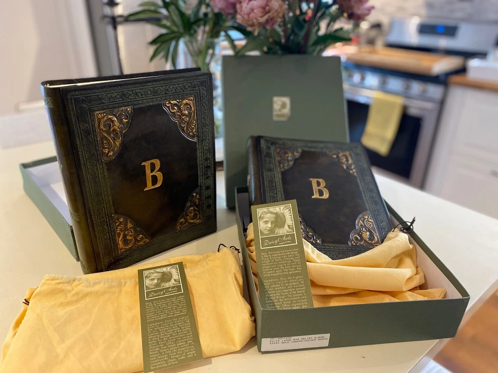 Selling a pair (2) Daisy Arts custom Italian leather vintage Albums. Their photo albums are unparalleled, with 50 archival quality, heavy cream stock pages (100 sides) and translucent interleaved tissue between pages. These are Model BR302GC, a 9.5"x12.5"x 2.5" book bound in a vegetable tanned full-grain Bass Relief olive green leather with gold painted enhanced corners with the capital letter "B" centered on the covers in Gold color. The albums has never been used and are shipped in the original cloth bag and box & a half. One of the albums is missing the top of box. From the company, these custom albums are currently sold for $300 plus shipping. AI description cause I find it fun.... Elevate your photo storage with this set of two DAISY ARTS vintage-themed photo albums. The green leather cover and Venetian bass relief of the albums give off an air of elegance. Each album is book-bound and contains 9.5x12.5 arch pages, allowing for the maximum photo size of 8 x 10. Preserve your memories in style with these high-quality albums that are made in Italy. The albums are perfect for storing personal photos or as a gift for a loved one. Get your hands on this new-in-box set of two DAISY ARTS photo albums and indulge in the beauty of vintage.