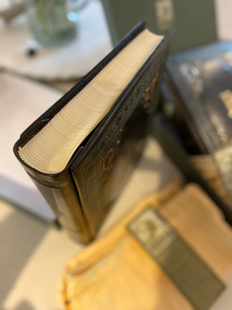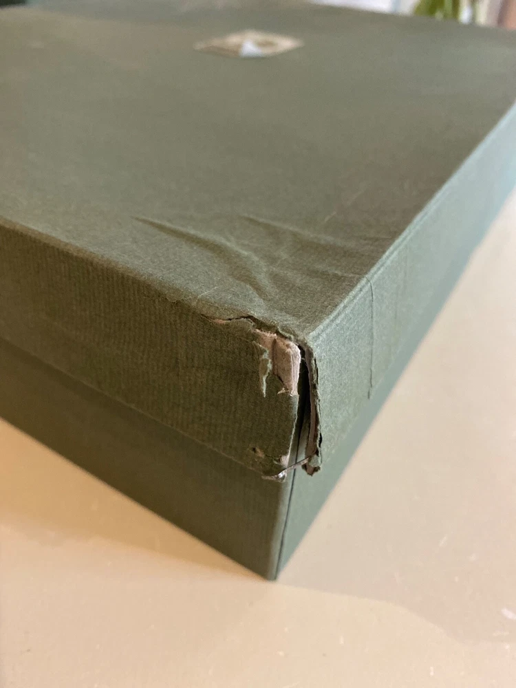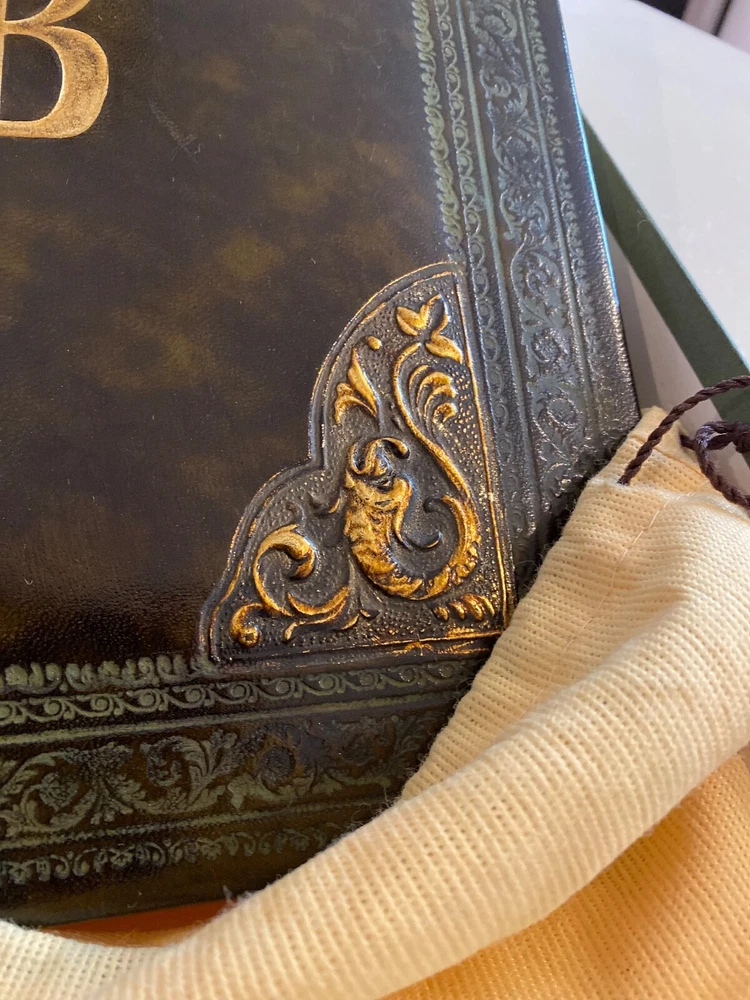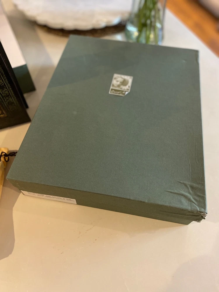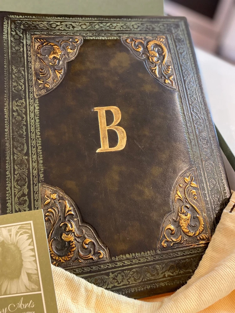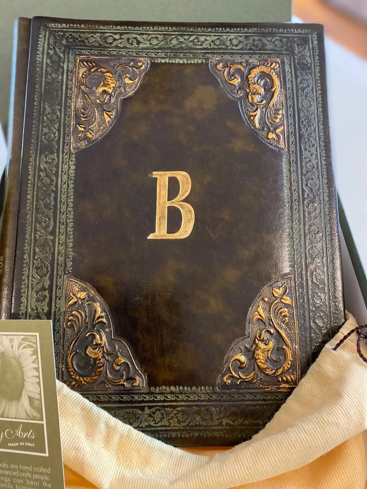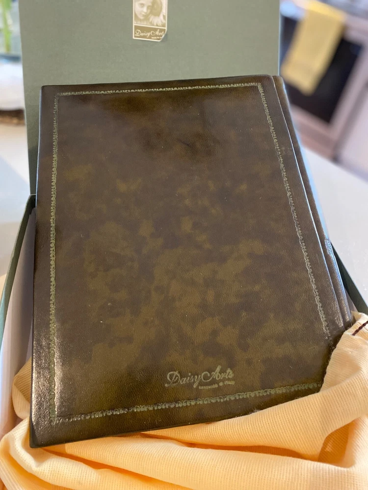 Selling a pair (2) Daisy Arts custom Italian leather vintage Albums. Their photo albums are unparalleled, with 50 archival quality, heavy cream stock pages (100 sides) and translucent interleaved tissue between pages. These are Model BR302GC, a 9.5"x12.5"x 2.5" book bound in a vegetable tanned full-grain Bass Relief olive green leather with gold painted enhanced corners with the capital letter "B" centered on the covers in Gold color. The albums has never been used and are shipped in the original cloth bag and box & a half. One of the albums is missing the top of box. From the company, these custom albums are currently sold for $300 plus shipping. AI description cause I find it fun.... Elevate your photo storage with this set of two DAISY ARTS vintage-themed photo albums. The green leather cover and Venetian bass relief of the albums give off an air of elegance. Each album is book-bound and contains 9.5x12.5 arch pages, allowing for the maximum photo size of 8 x 10. Preserve your memories in style with these high-quality albums that are made in Italy. The albums are perfect for storing personal photos or as a gift for a loved one. Get your hands on this new-in-box set of two DAISY ARTS photo albums and indulge in the beauty of vintage.