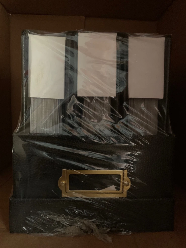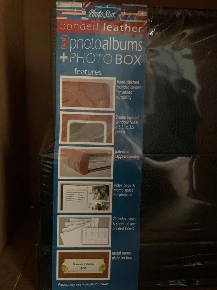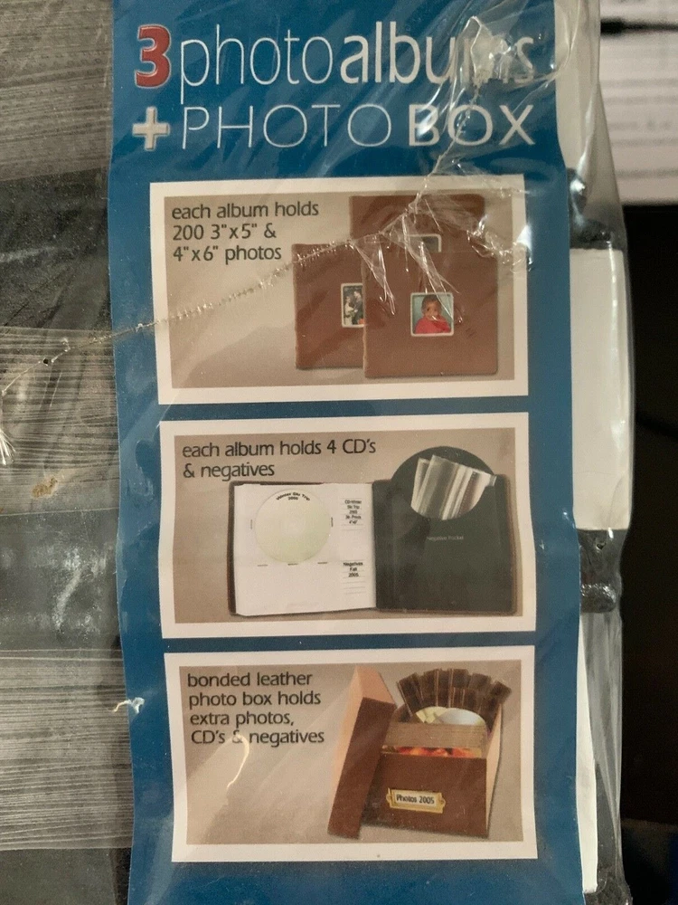 These were personally owned. We purchased many sets. Many were used and these last 2 are not needed. They are heavy, strong & durable. They will be around for many generations to come. They are archival safe & acid free. Each book holds 200 3" x 5" or 4' x 6" photos + 4 CD's. That's 600 photos per set. The photo box holds extra photos, CD's & negatives. Note the nameplate holder so you can label the contents of each box such as the years or people it includes. There is also the cute little window for a picture on the front cover of the book which could also identify the contents of that book. We had a lot of fun going through years of pictures and saving and categorizing the highlights of our lives.