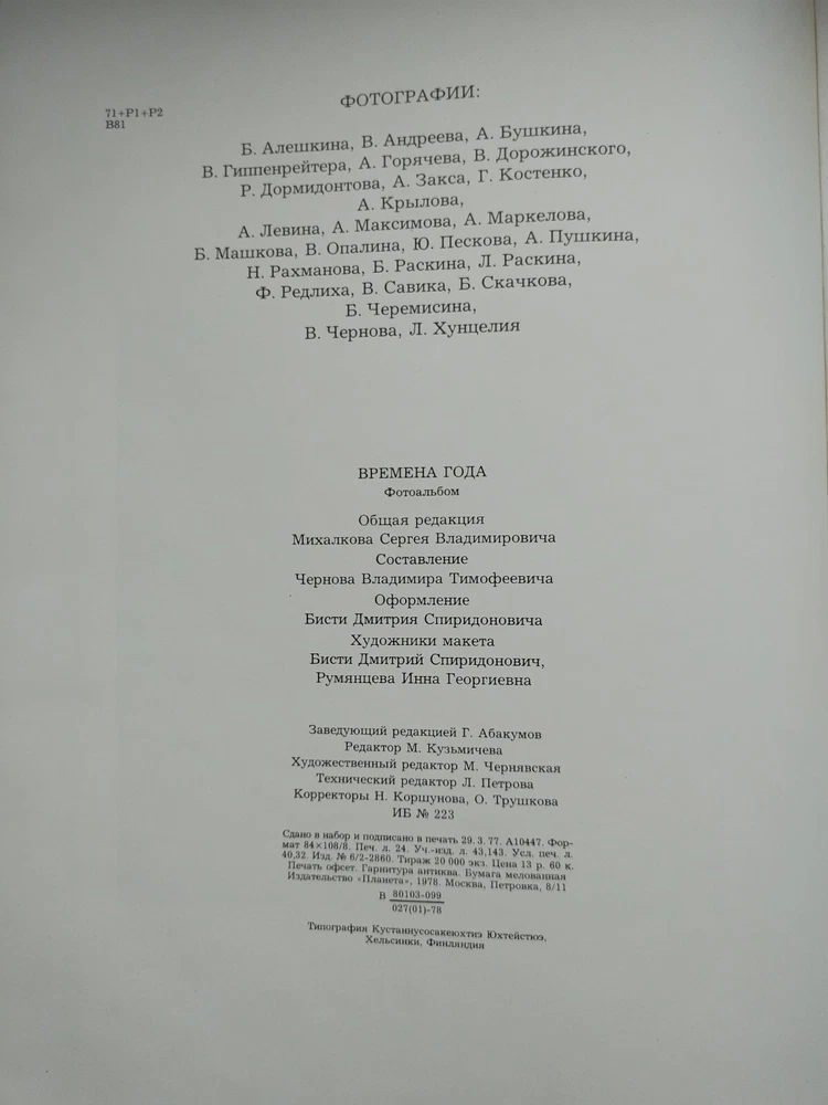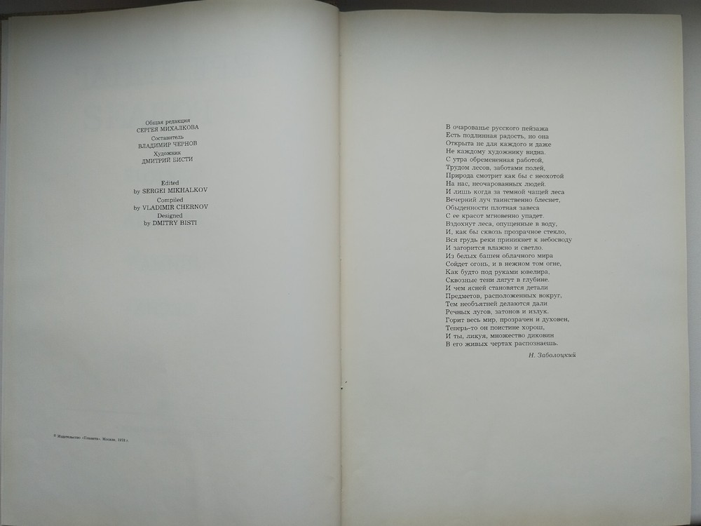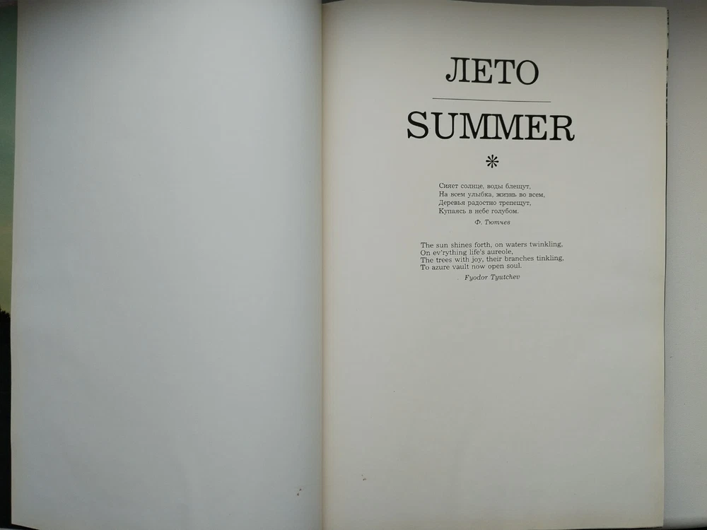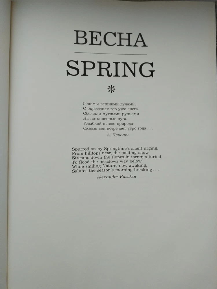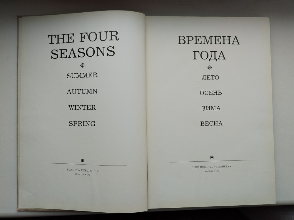 Cover: firm + dust jacket; 240 pages; 1978 hard cardboard sleeve. Compiled by V. Chernov. SEASONS. Summer. Autumn. Winter. Spring M. Planet 1978 edited by Mikhalkov, S.V. , Gorgeous print. Hardcover, cloth, dust jacket. Made in Finland. Circulation 20000. Language: Russian, English. Very Large format - 275 x 400 mm. An original gift for connoisseurs of poetry and photography. Gorgeous photos of nature by seasons. A unique edition. Luxurious photo album "Seasons" is a poetic collection of the best poems of Russian and Soviet classics. The book is divided into chapters according to the seasons of the year - Spring, Summer, Autumn, Winter. Each chapter is accompanied by beautiful photo illustrations that accompany the poetic lines of famous poets.