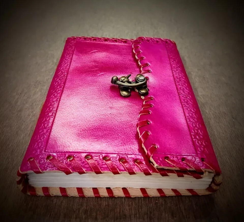 Pink Colored Handmade Unlined 5*7 Unlined Large Leather Bound Unisex Journal Product Description: Features: * Material: Leather & Recycled Paper. * Size: approx. (5x7) inches approx. (6x8) inches - $32.00 * 200 pages ( Both side) of handmade Deckle Edge Cotton Paper, made from recycled cotton. * Eco-friendly. * Handmade. * Brand New. * A very beautiful gift for yourself or your friends. * Great diary, travel journal and notebook.