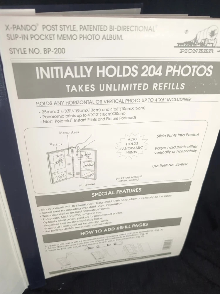 This Pioneer BP-200 Photo Album in Navy Blue is the perfect addition to your photography collection. The album is designed with faux leather material, giving it a sleek and stylish look. The slip-in album format allows for easy insertion of your photos, while the post-bound pages provide a secure and durable display for your memories. The blue color adds a pop of color to your collection, making it stand out. The album is slightly damaged please refer to pictures.