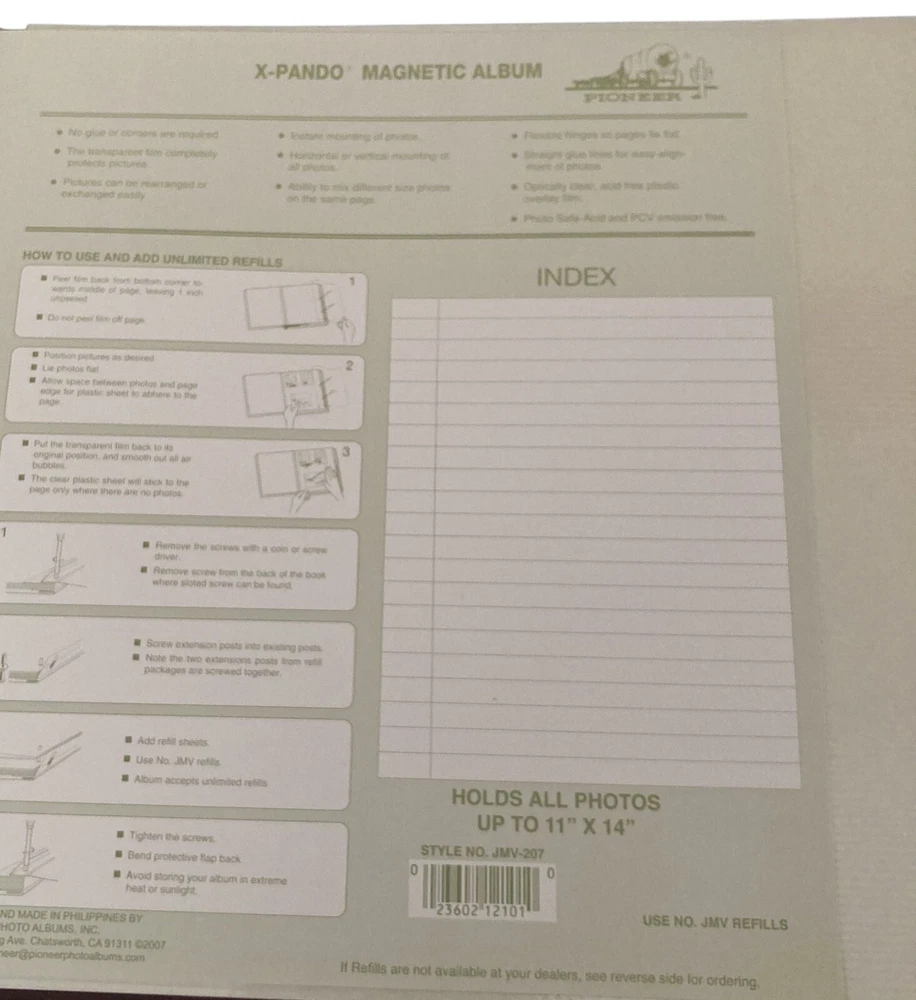 Pioneer Deluxe Jumbo 20 Page Magnetic Photo Album Panoramic New In Box No PVC Holds all size photos listed below including panoramic 3 1/2”x5 1/4”, 4”x6”, 5”x7”, 8”x10”, 11”x14” Smoke free home